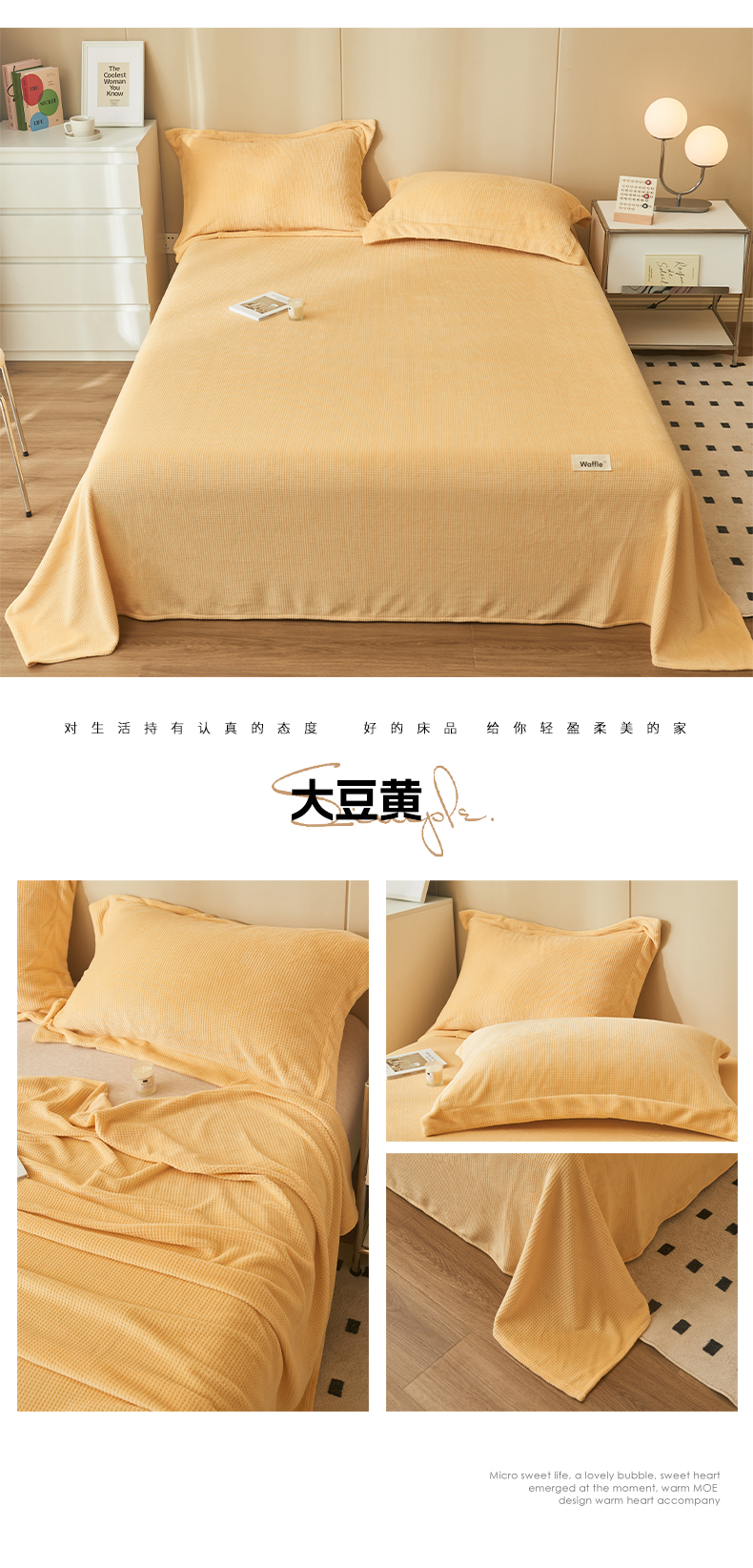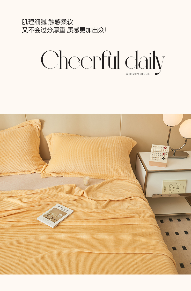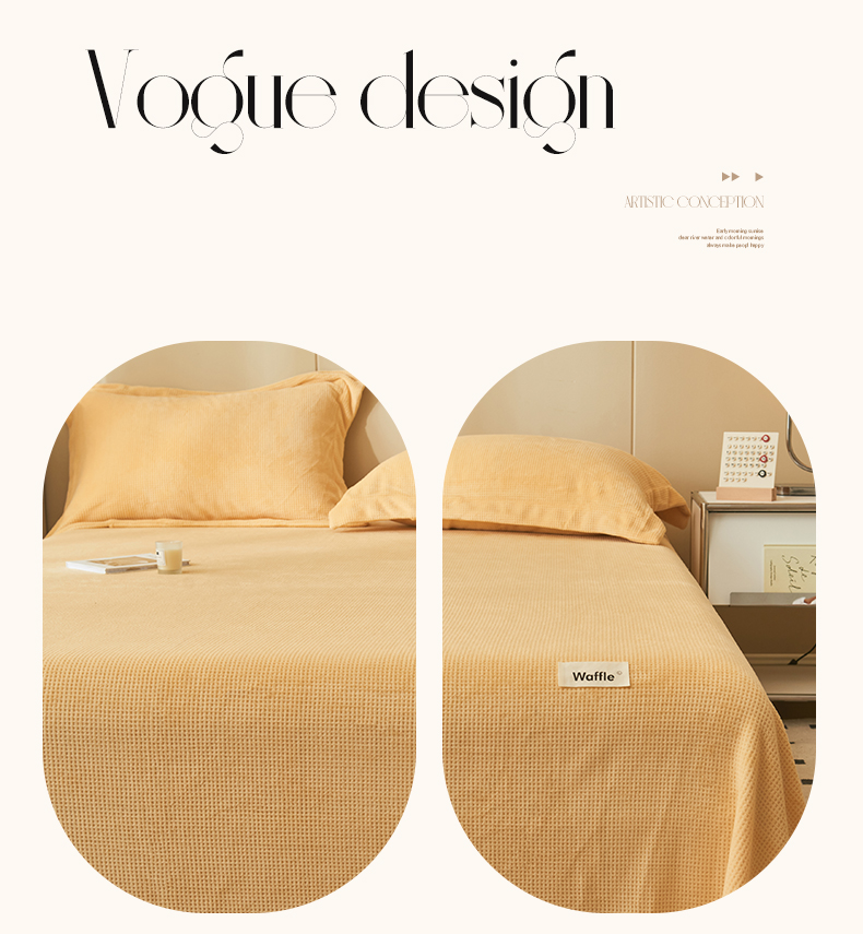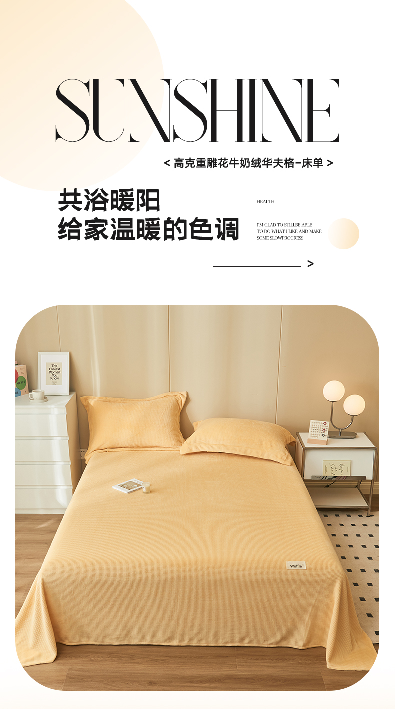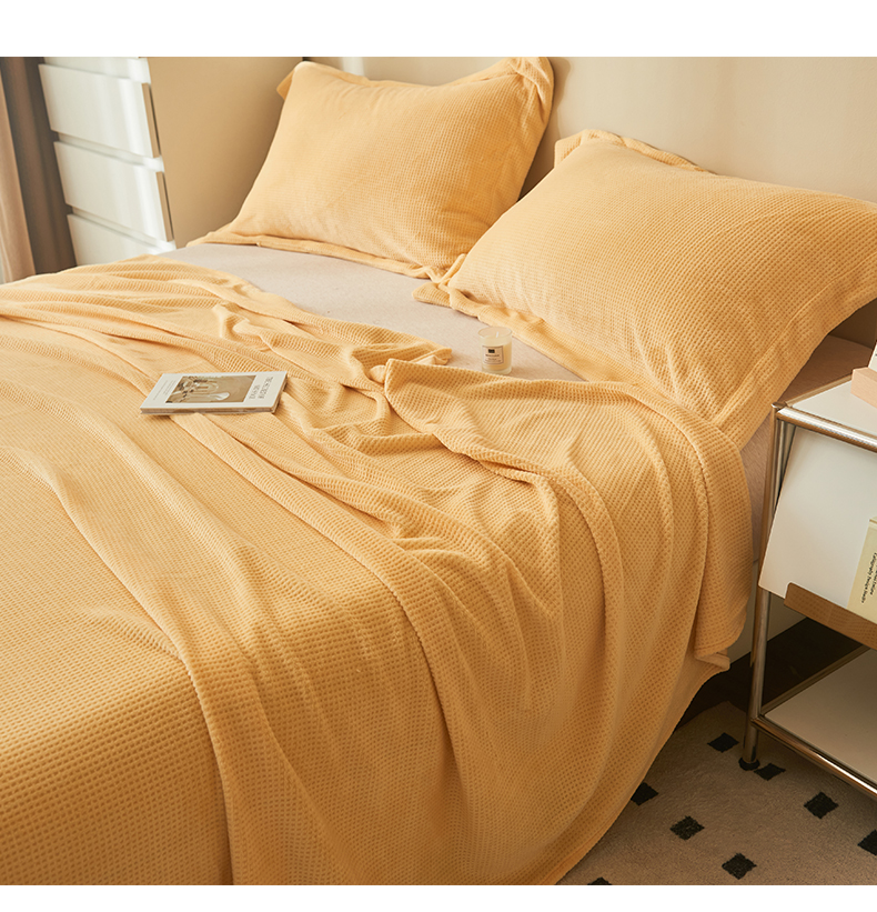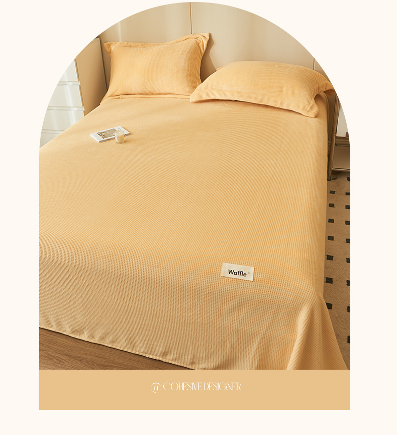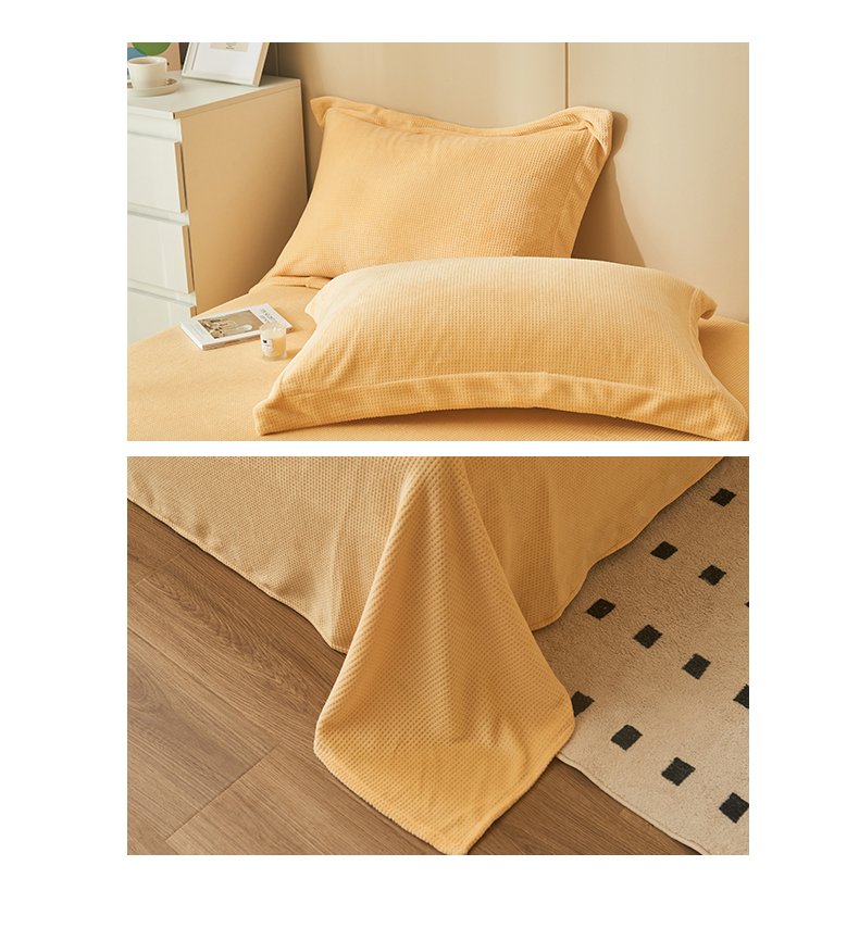 • 91家纺网 家纺一手货源 找家纺 吾诺 2023秋冬 华夫格绒床单枕套床笠毯子单品系列 - 牛奶绒床单 大豆黄