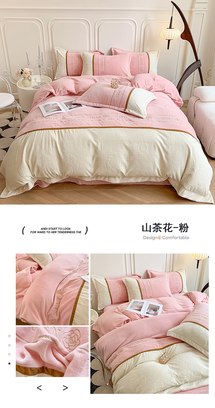芯贝儿 2024新款轻奢简约绣花加厚牛奶绒保暖四件套 山茶花--粉
