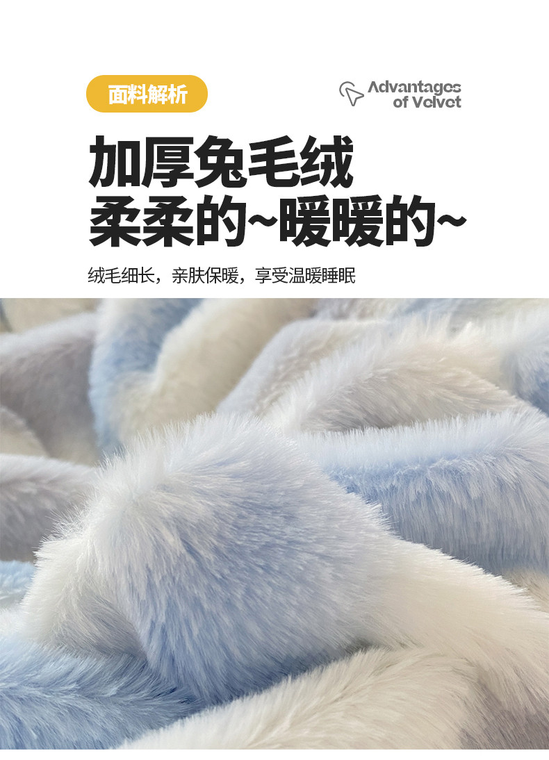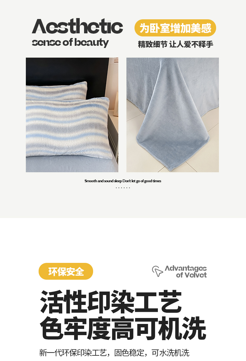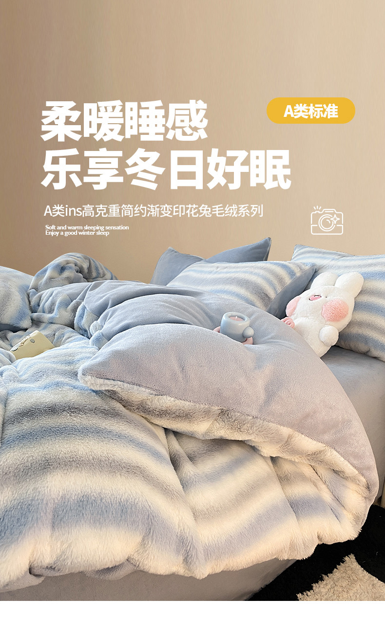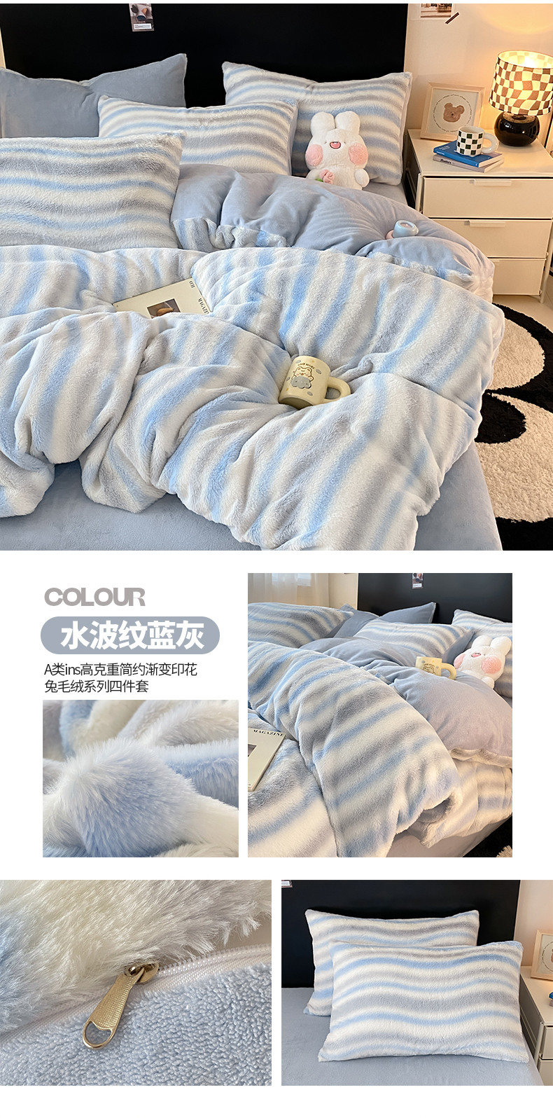 A类ins高克重320克简约渐变印花兔毛绒暖绒加厚牛奶绒系列四件套 绒兔毛-水波纹蓝灰