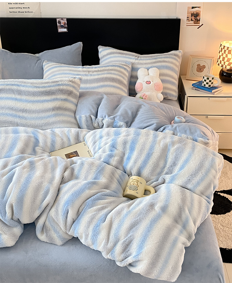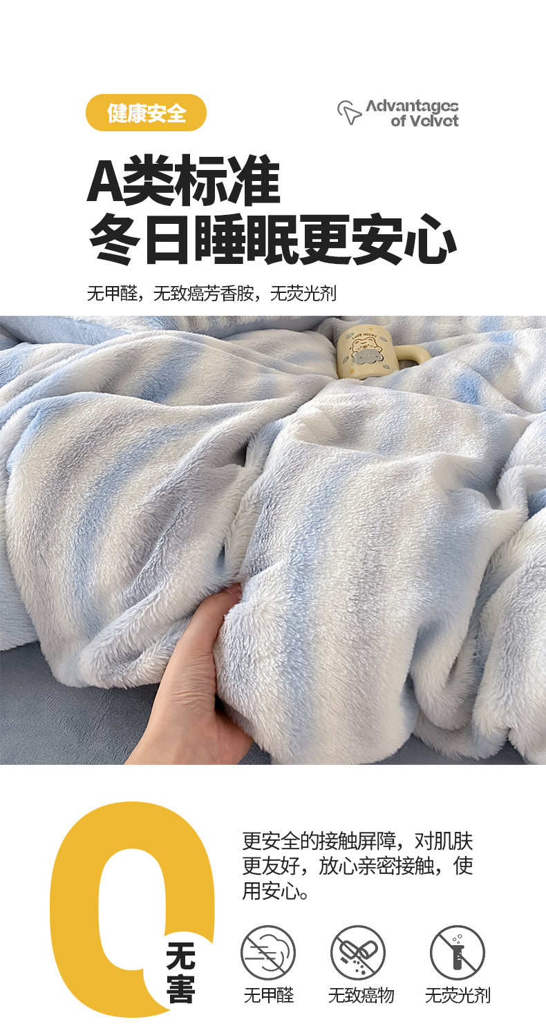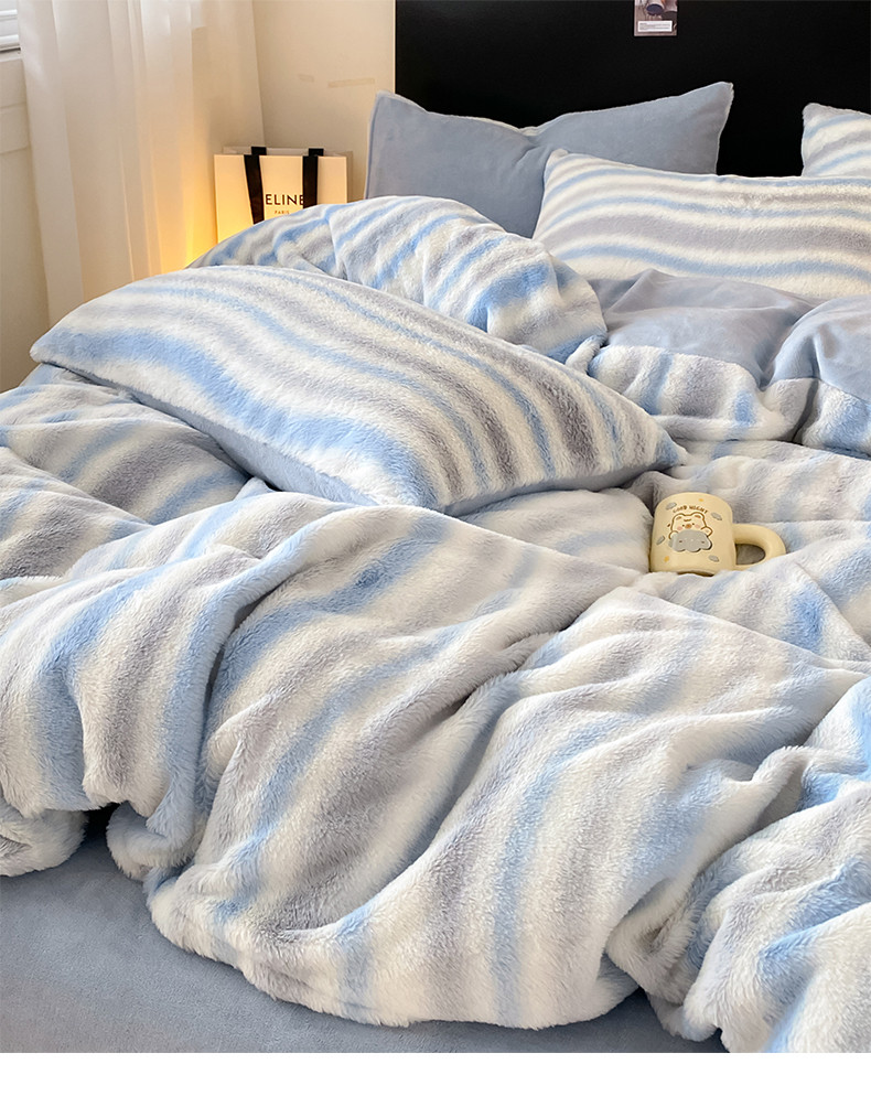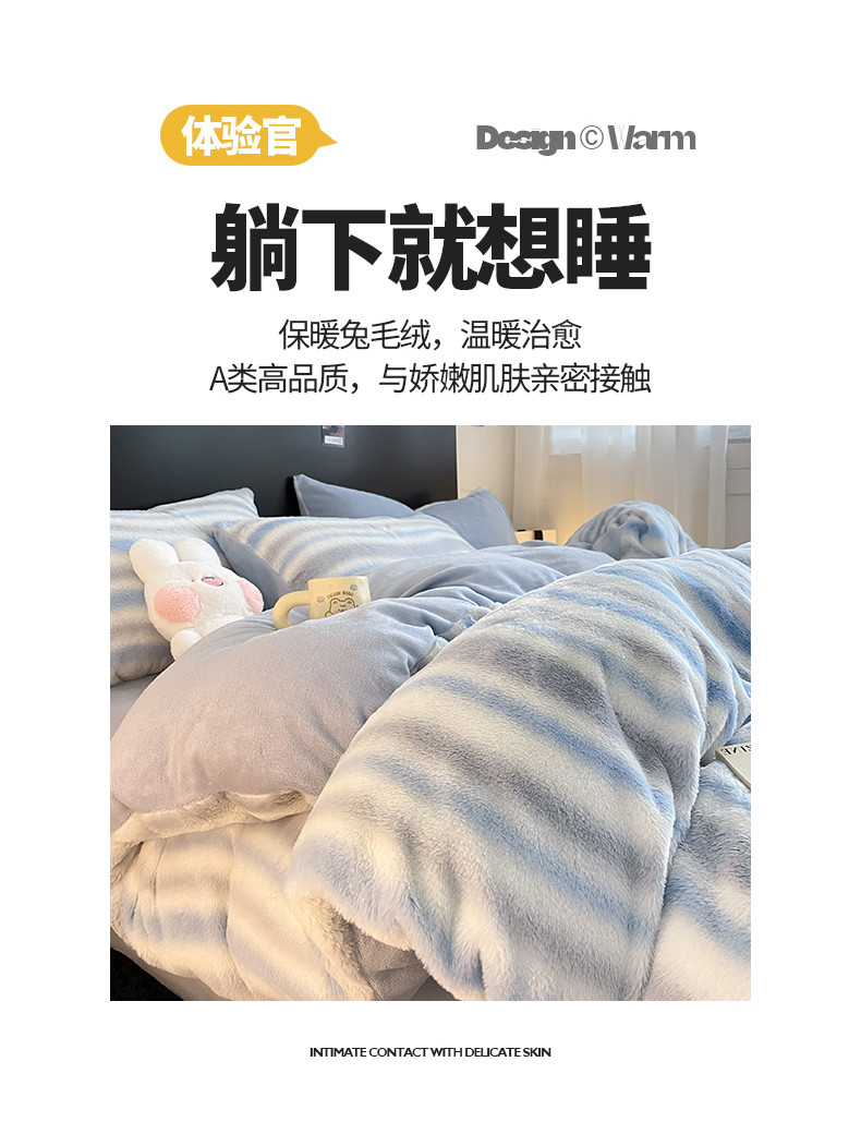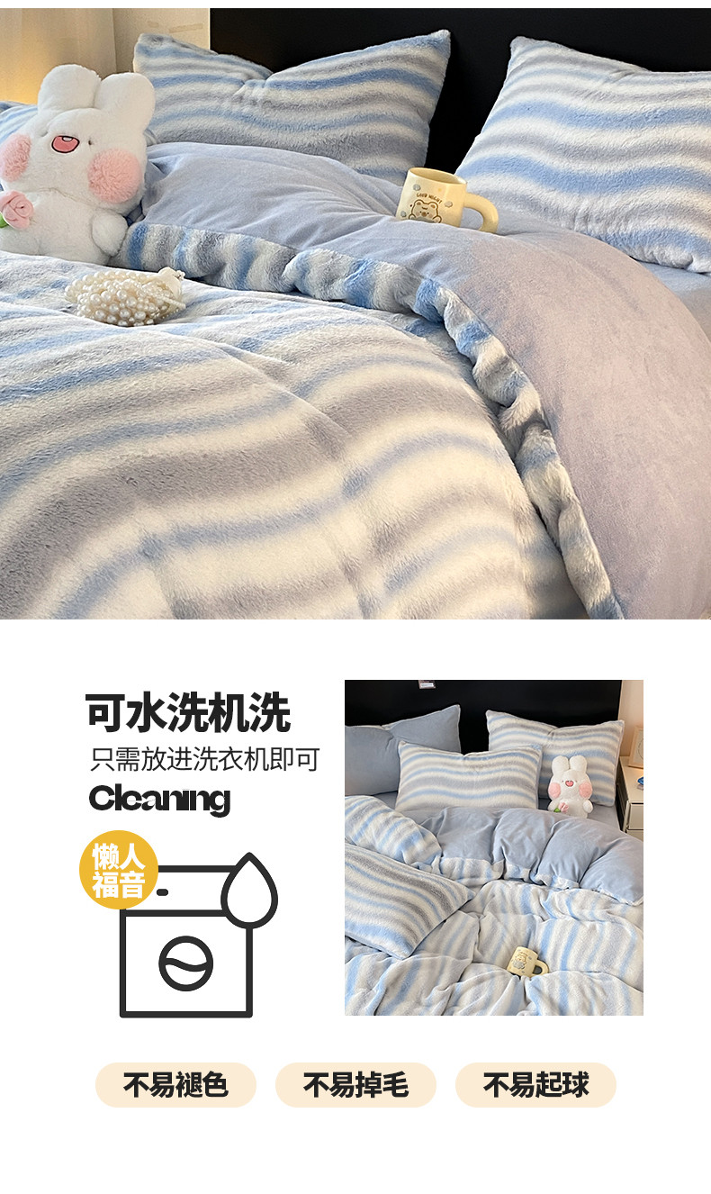 A类ins高克重320克简约渐变印花兔毛绒暖绒加厚牛奶绒系列四件套 绒兔毛-水波纹蓝灰