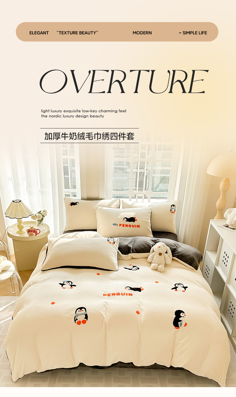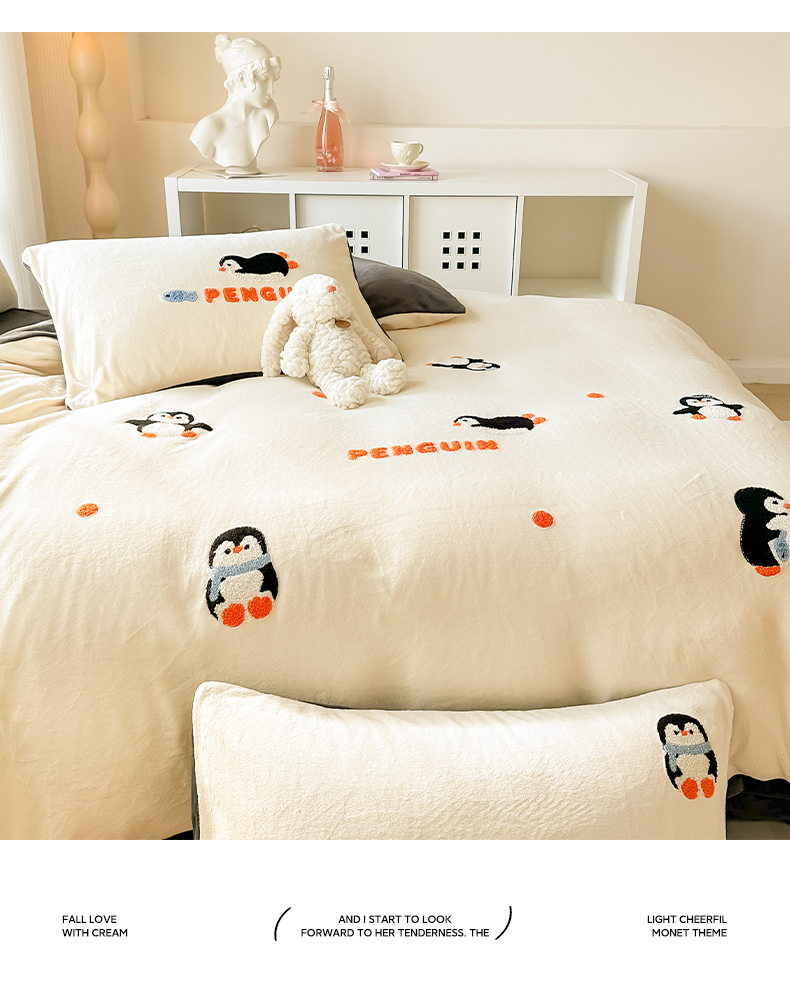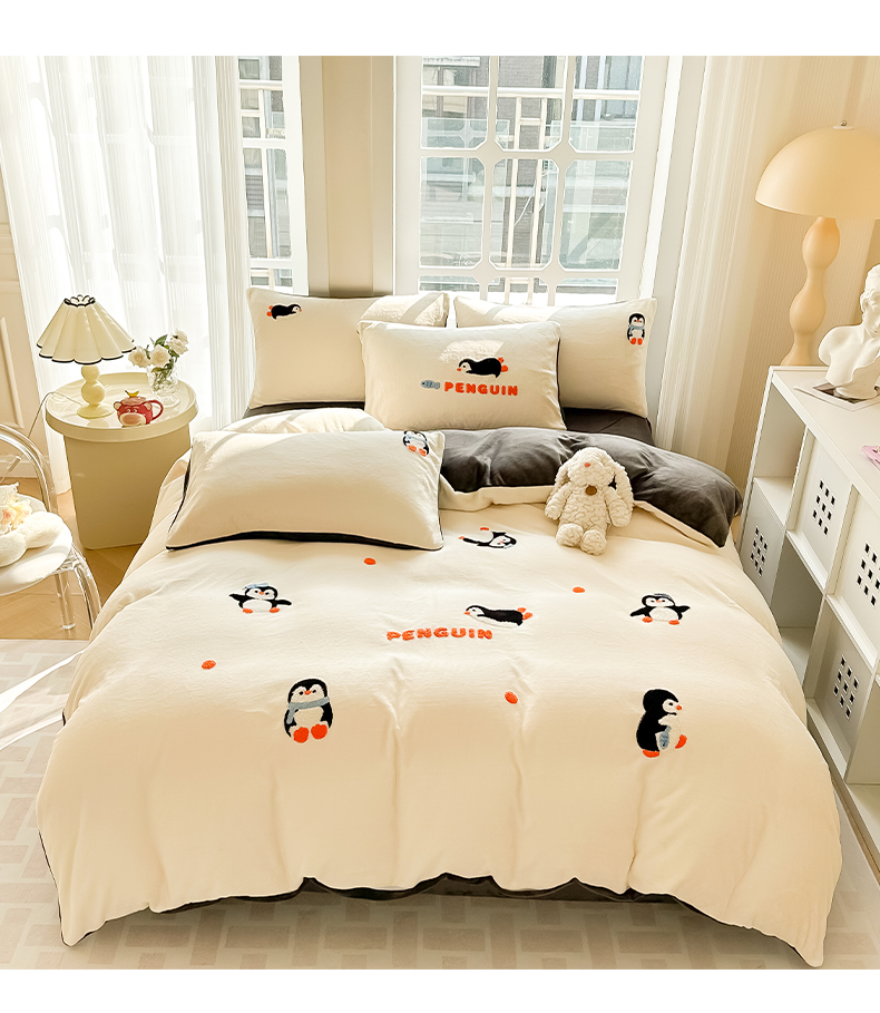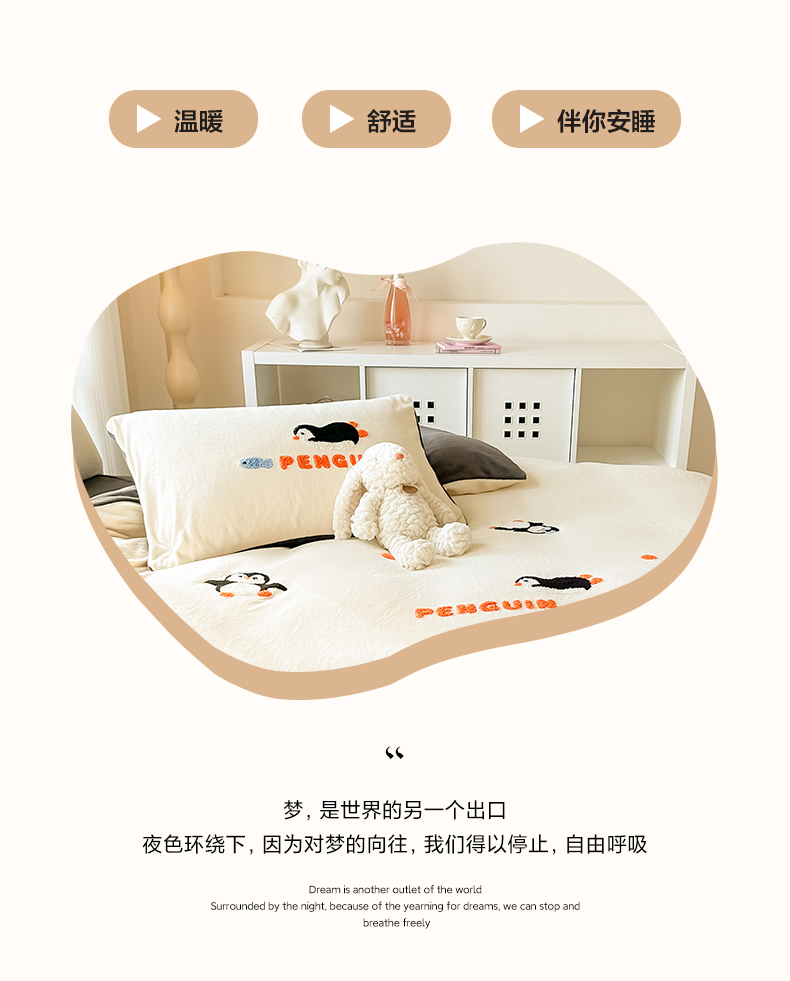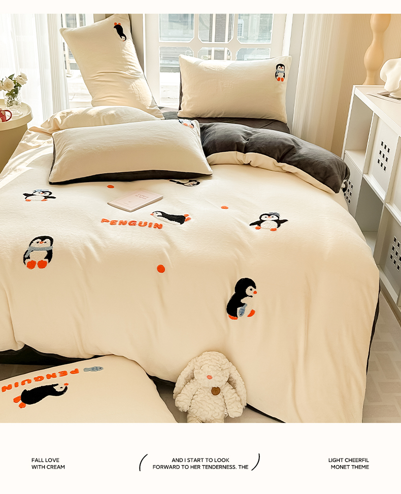 当前位置: 91家纺网 > 商品网购 > 床品套件 > 四件套 > 牛奶绒四件套 > 眠屿家纺 2023新款牛奶绒毛巾绣四件套(温馨版) 企鹅抓鱼