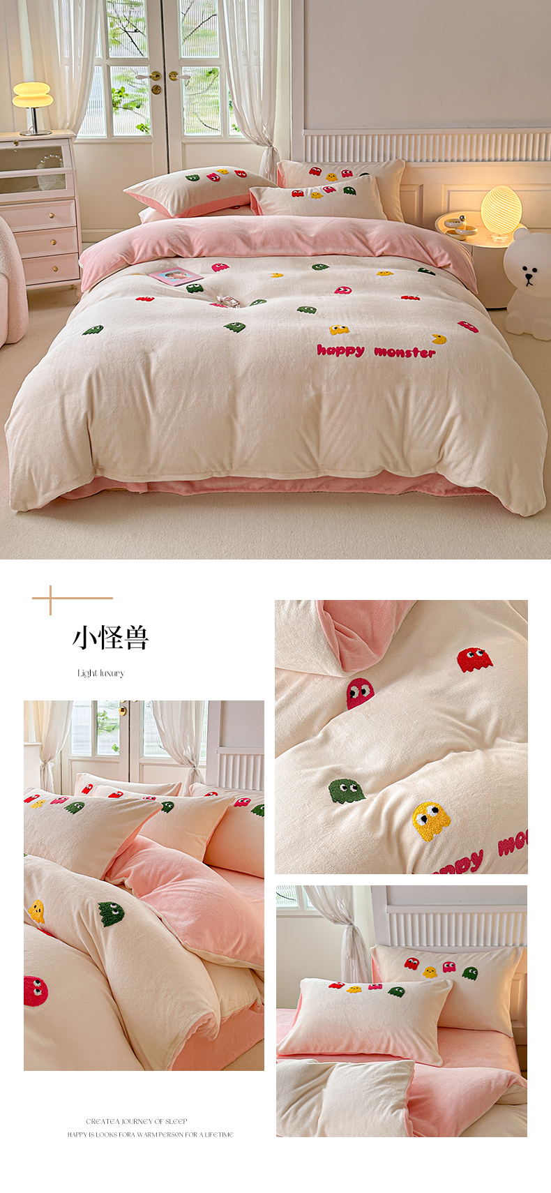 木堇家居 2023秋冬新款牛奶绒毛巾绣四件套 小怪兽