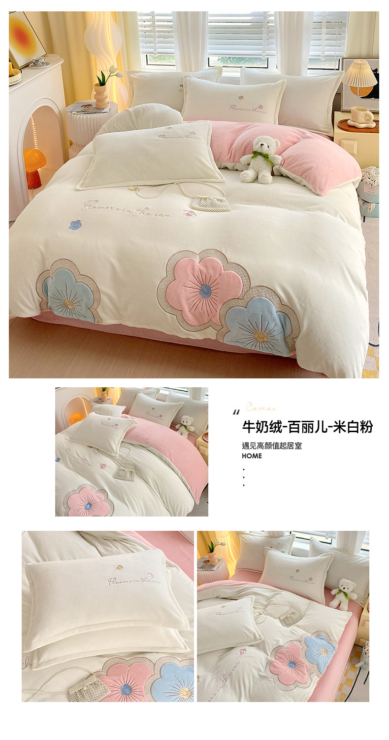 商品名称:凡客家居 2023新款牛奶绒贴布绣四件套 百丽儿-米白粉