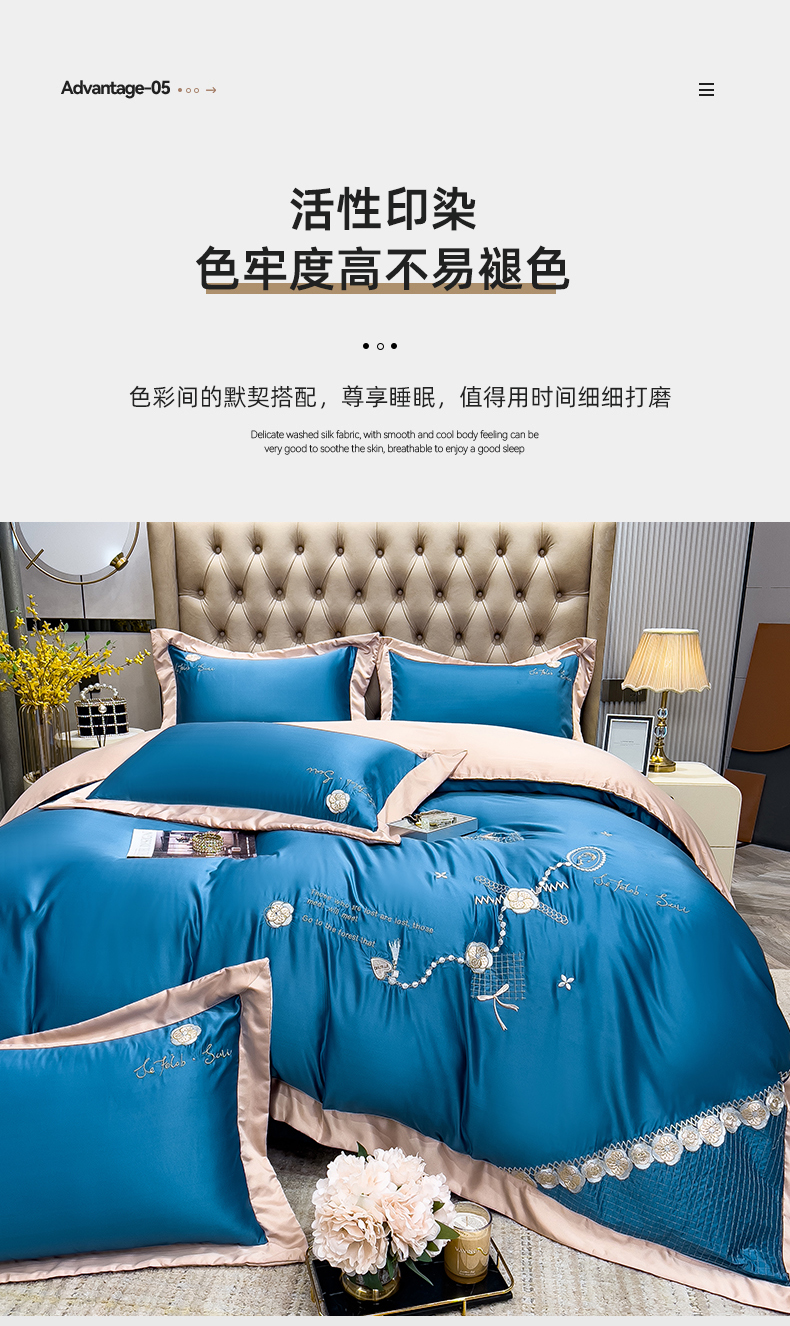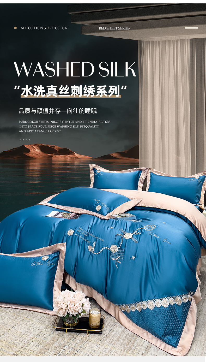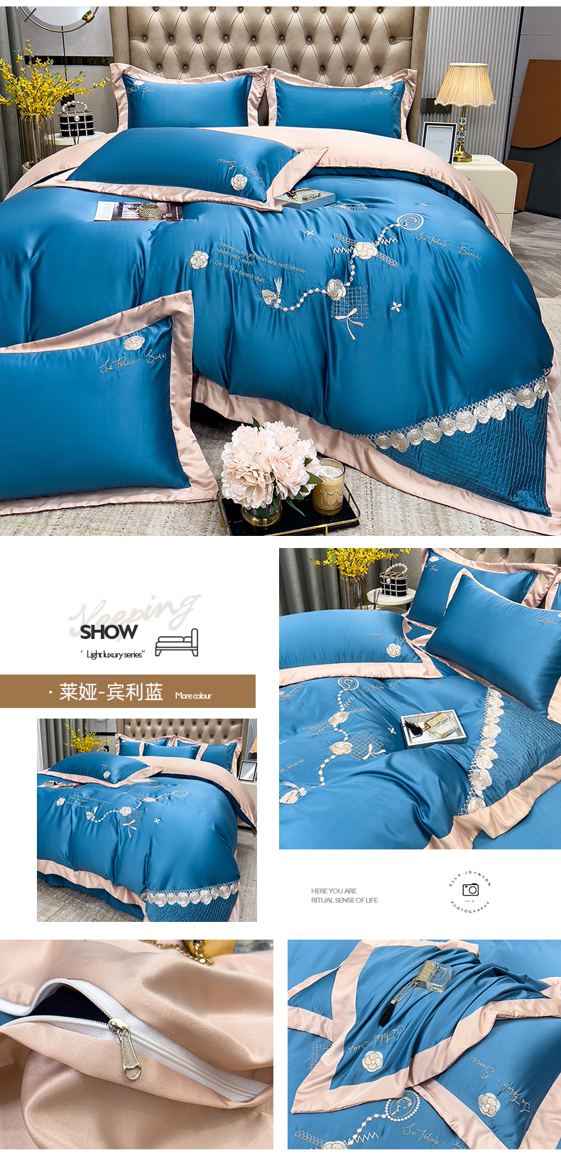 欧冠家纺 2024新款绣花水洗真丝四件套莱娅四件套 莱娅-宾利蓝