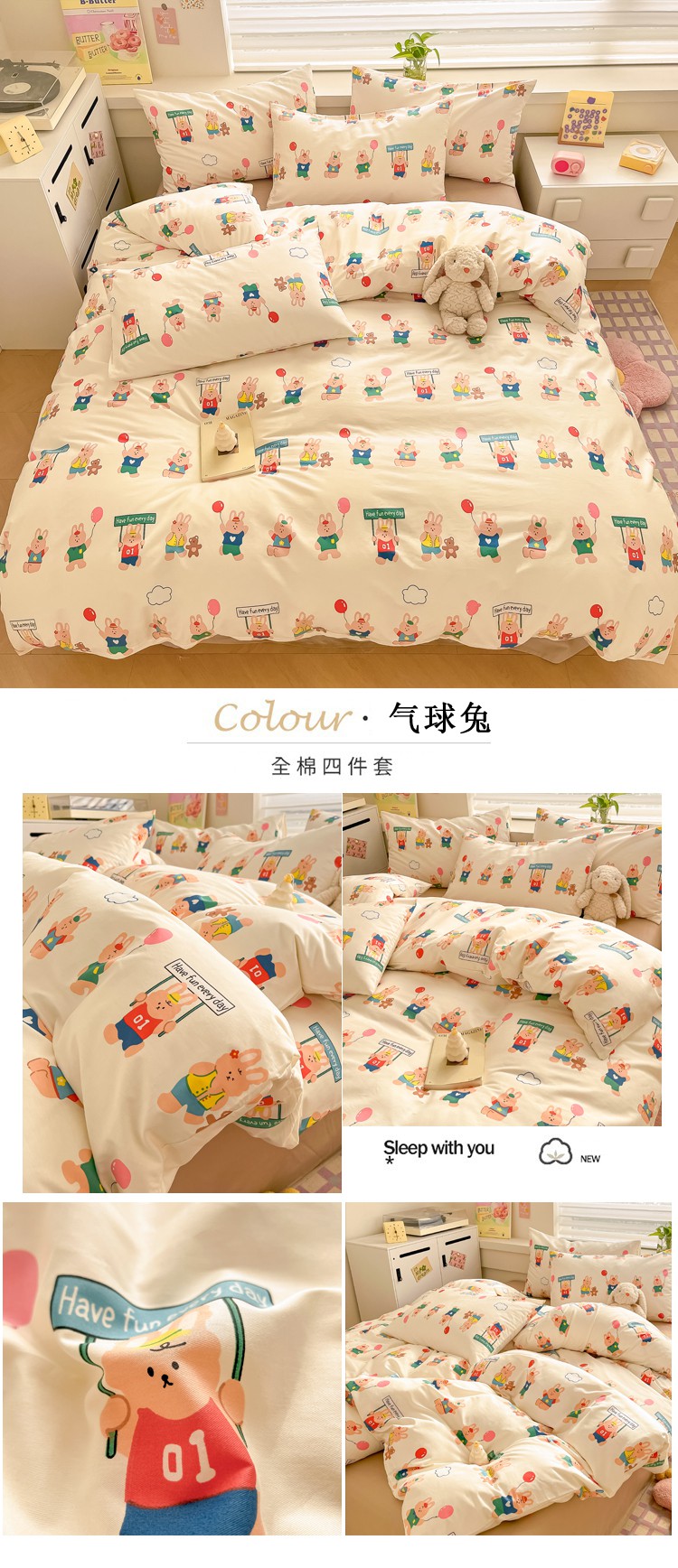 当前位置: 91家纺网 > 商品网购 > 床品套件 > 四件套 > 全棉普通四件套 > 柠馨 2024新款全棉13376乖萌系列四件套(第六批) 气球兔