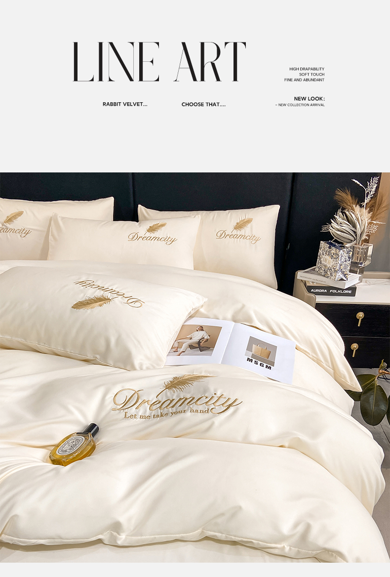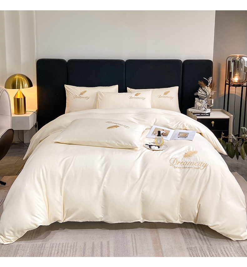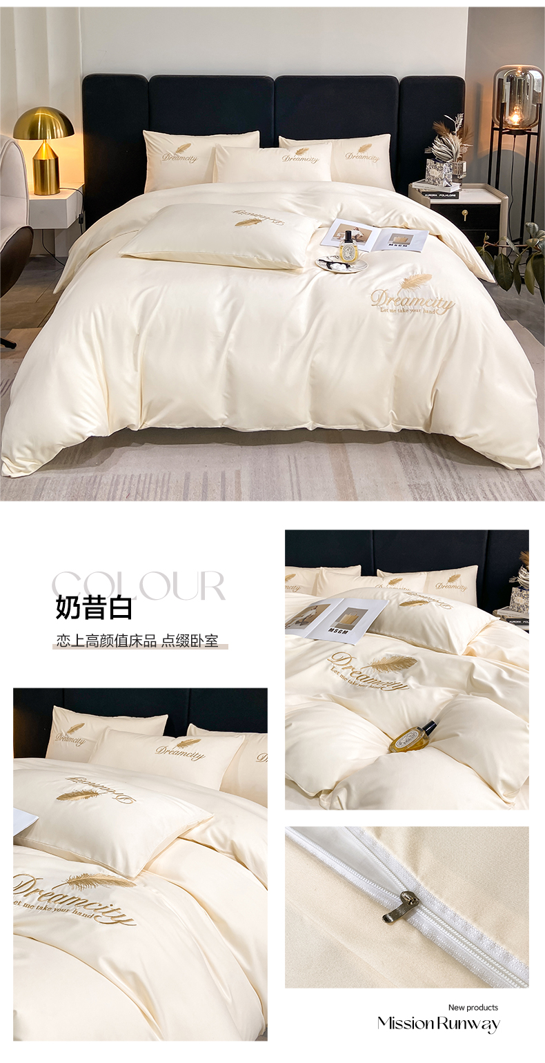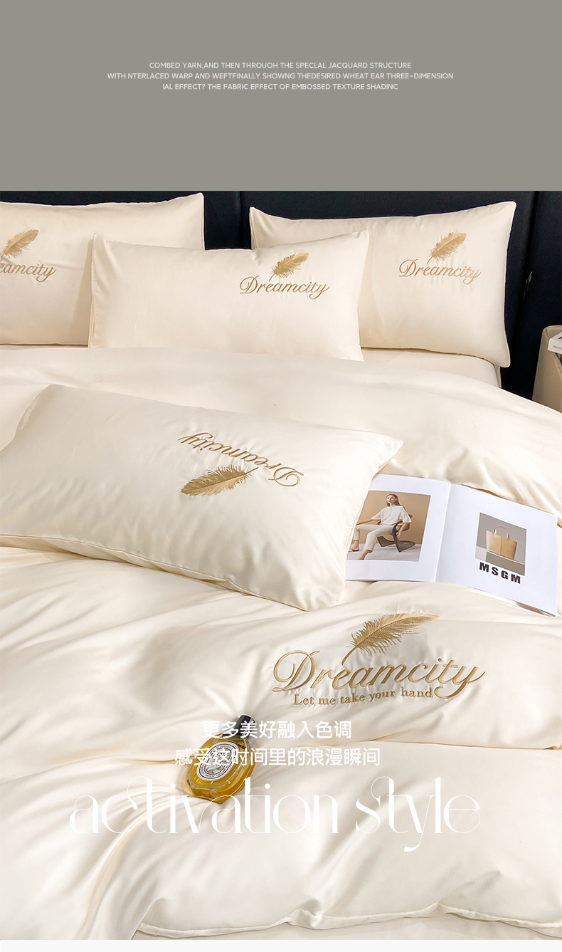 商品名称:如一 2024新款水洗棉磨毛纯色刺绣羽毛系列四件套 羽毛-奶昔白