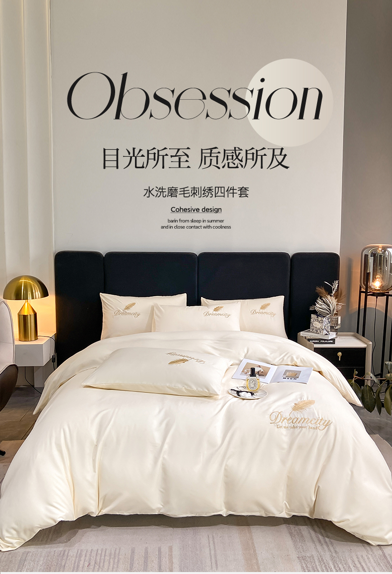 如一 2024新款水洗棉磨毛纯色刺绣羽毛系列四件套 羽毛-奶昔白