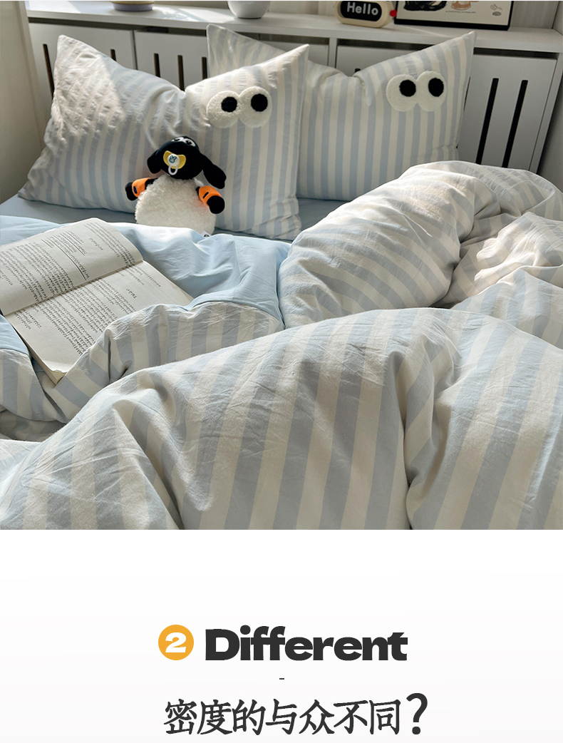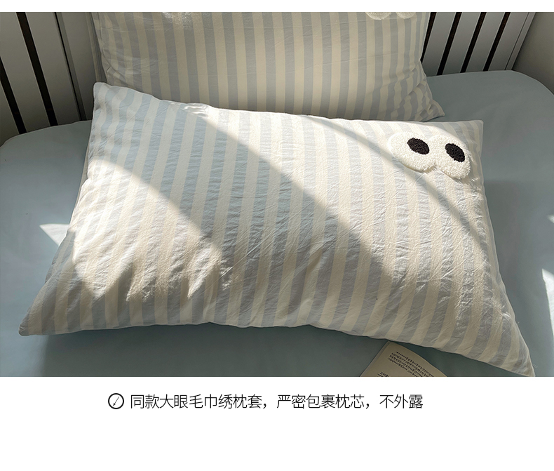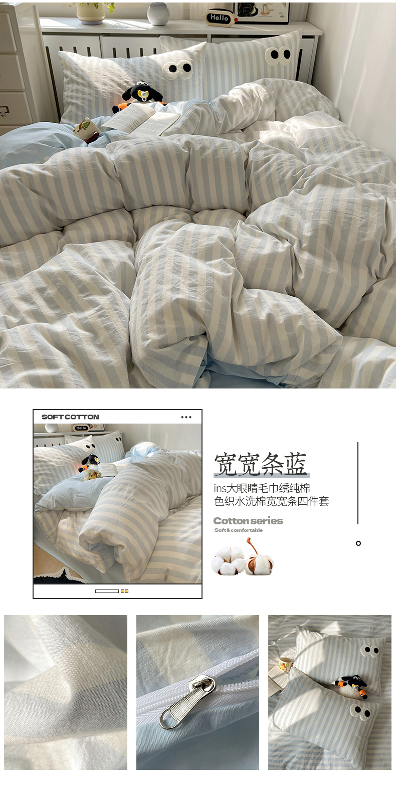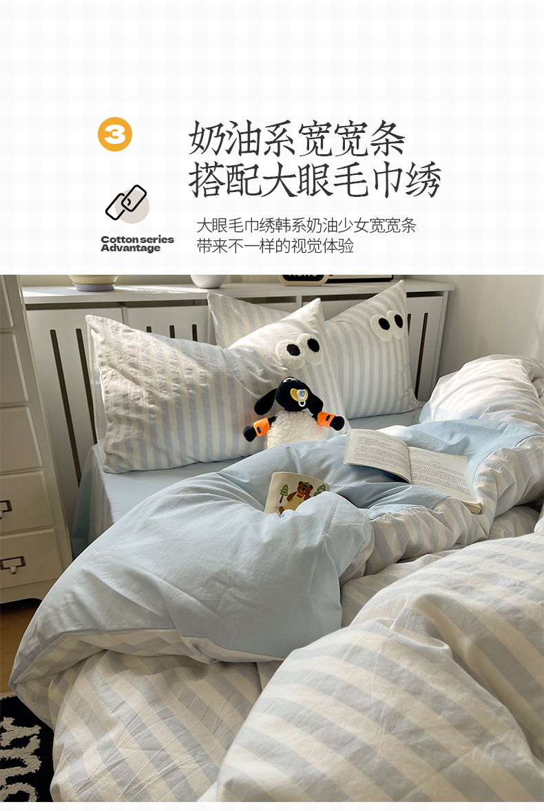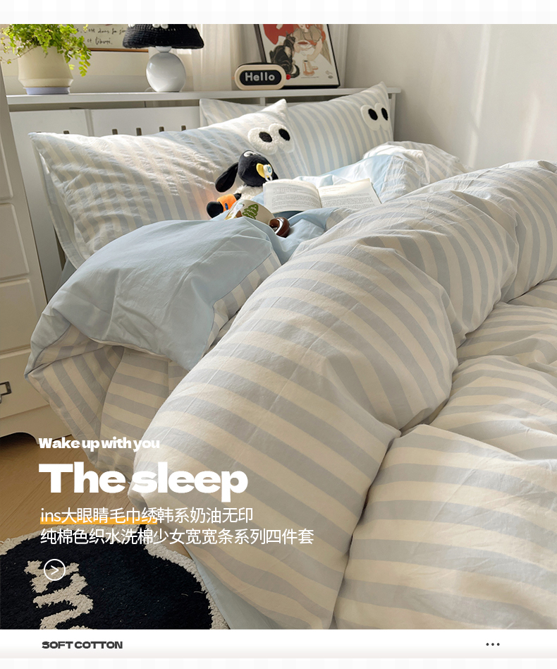 商品名称:桃子 2024新款ins大眼睛毛巾绣韩系奶油无印纯棉色织水洗棉少女宽宽条系列四件套 水洗棉-宽宽条蓝