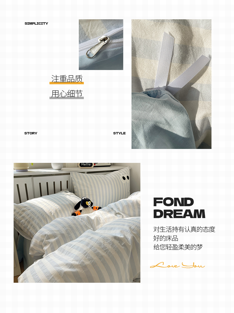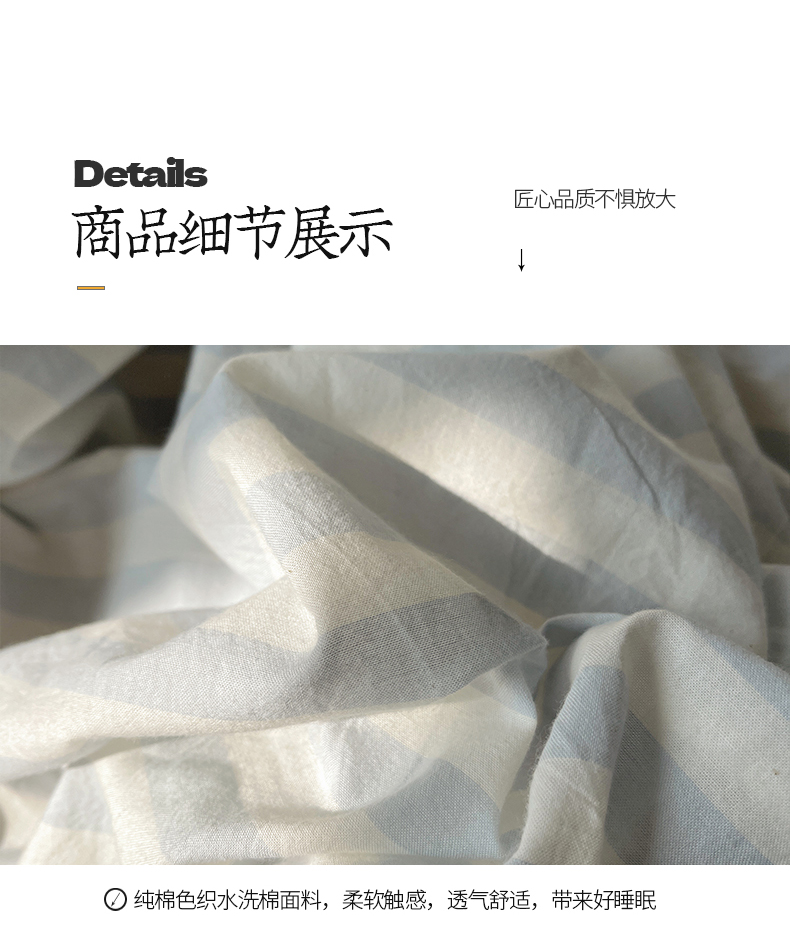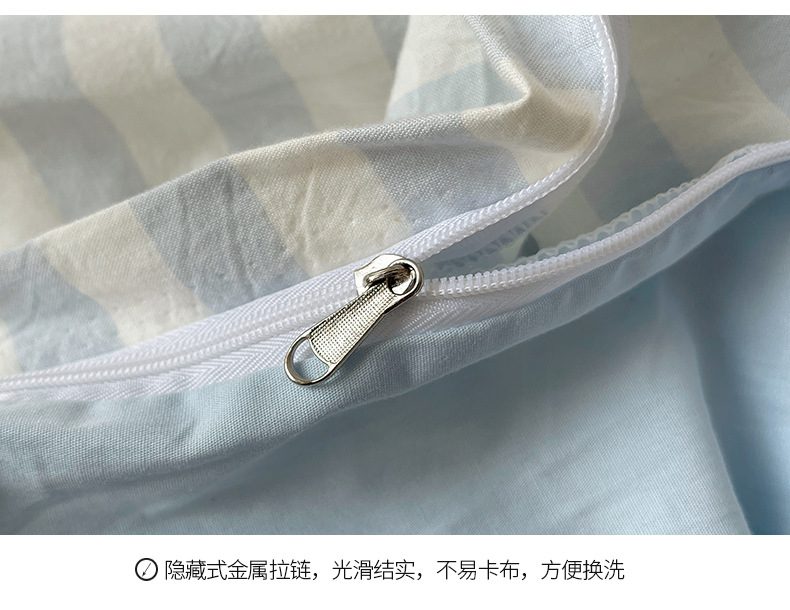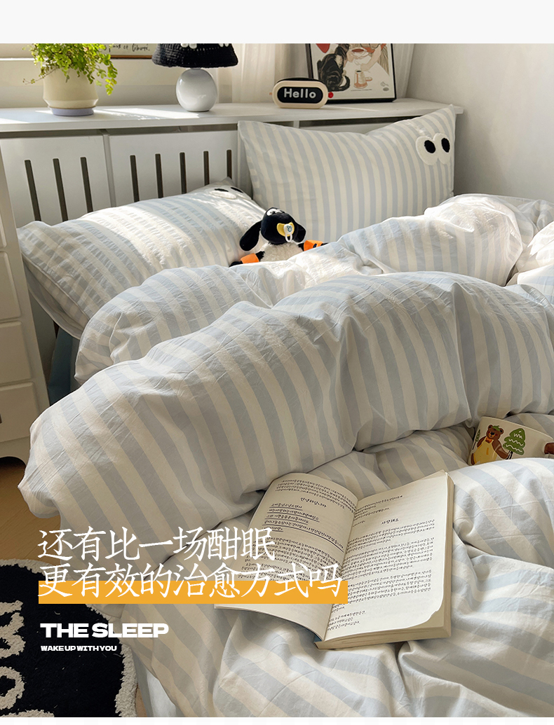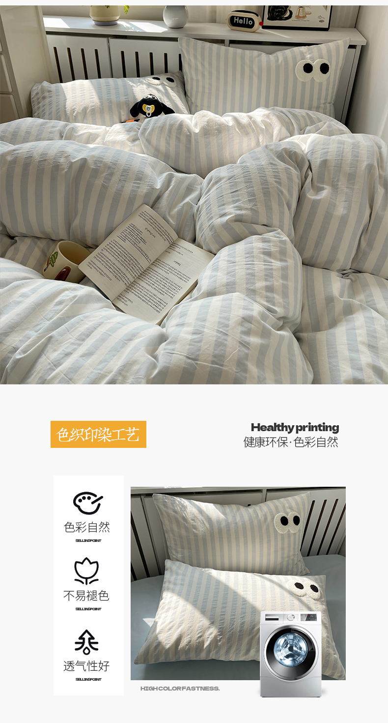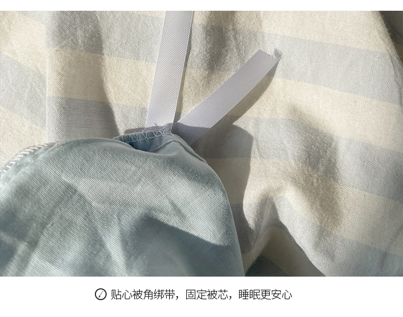 商品名称:桃子 2024新款ins大眼睛毛巾绣韩系奶油无印纯棉色织水洗棉少女宽宽条系列四件套 水洗棉-宽宽条蓝