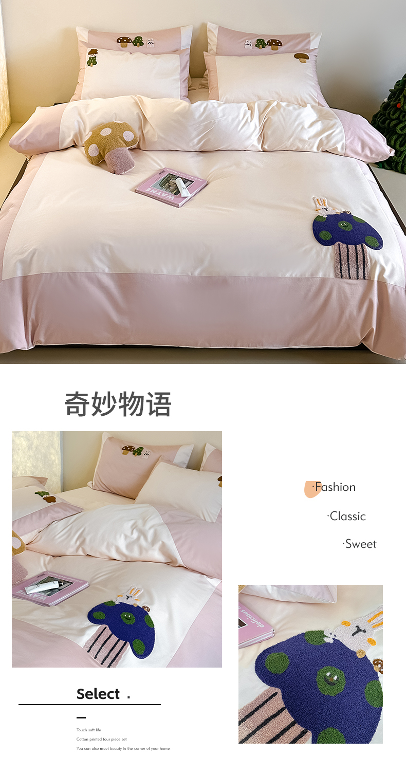 商品名称:泽西家纺 2024新款全棉水洗棉毛巾绣大拼角四件套 奇妙物语