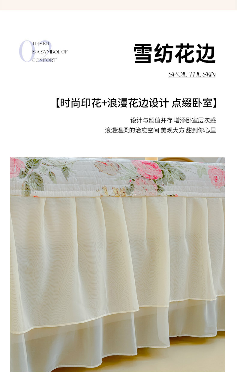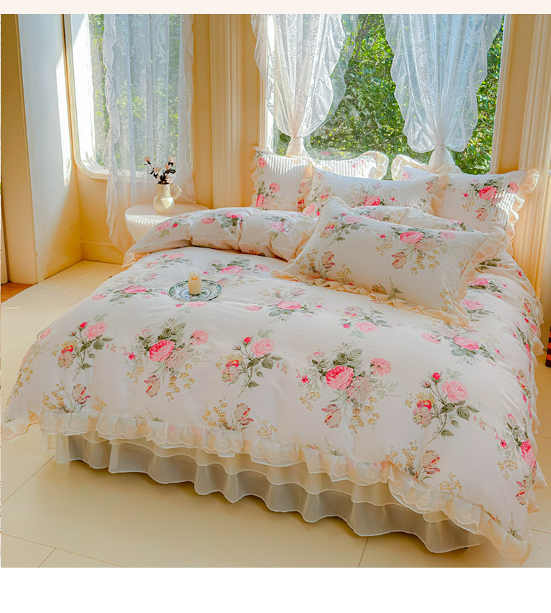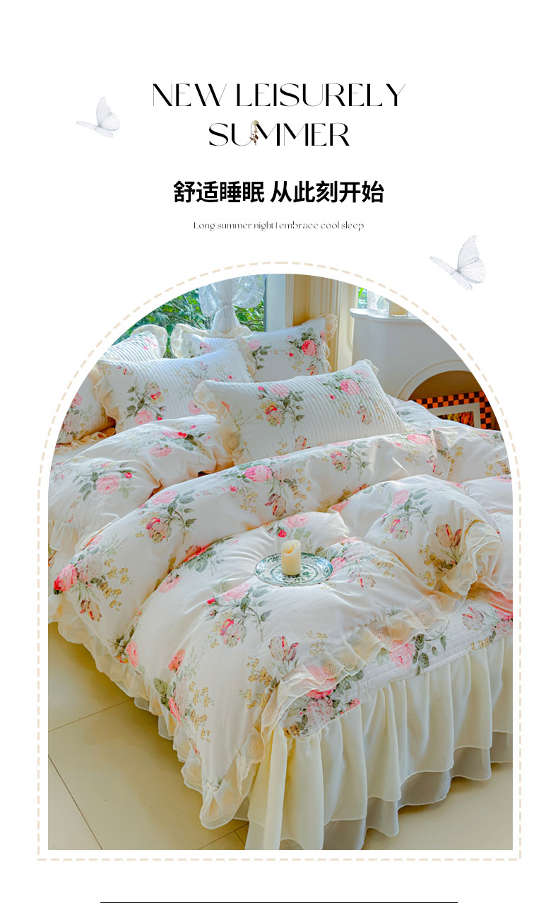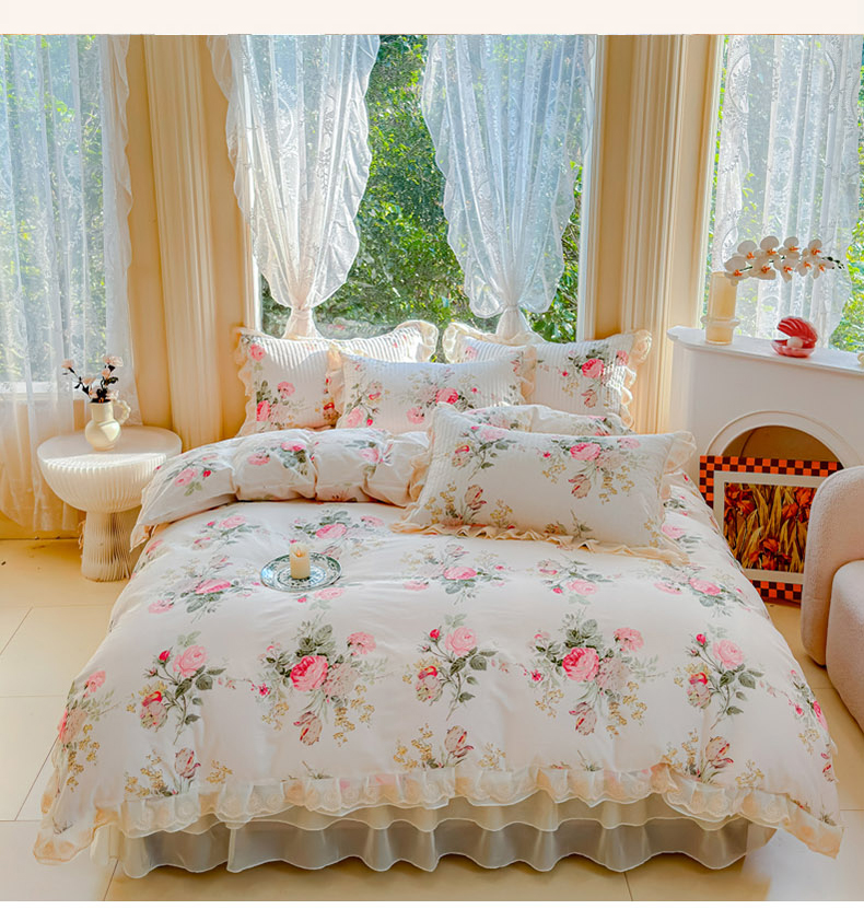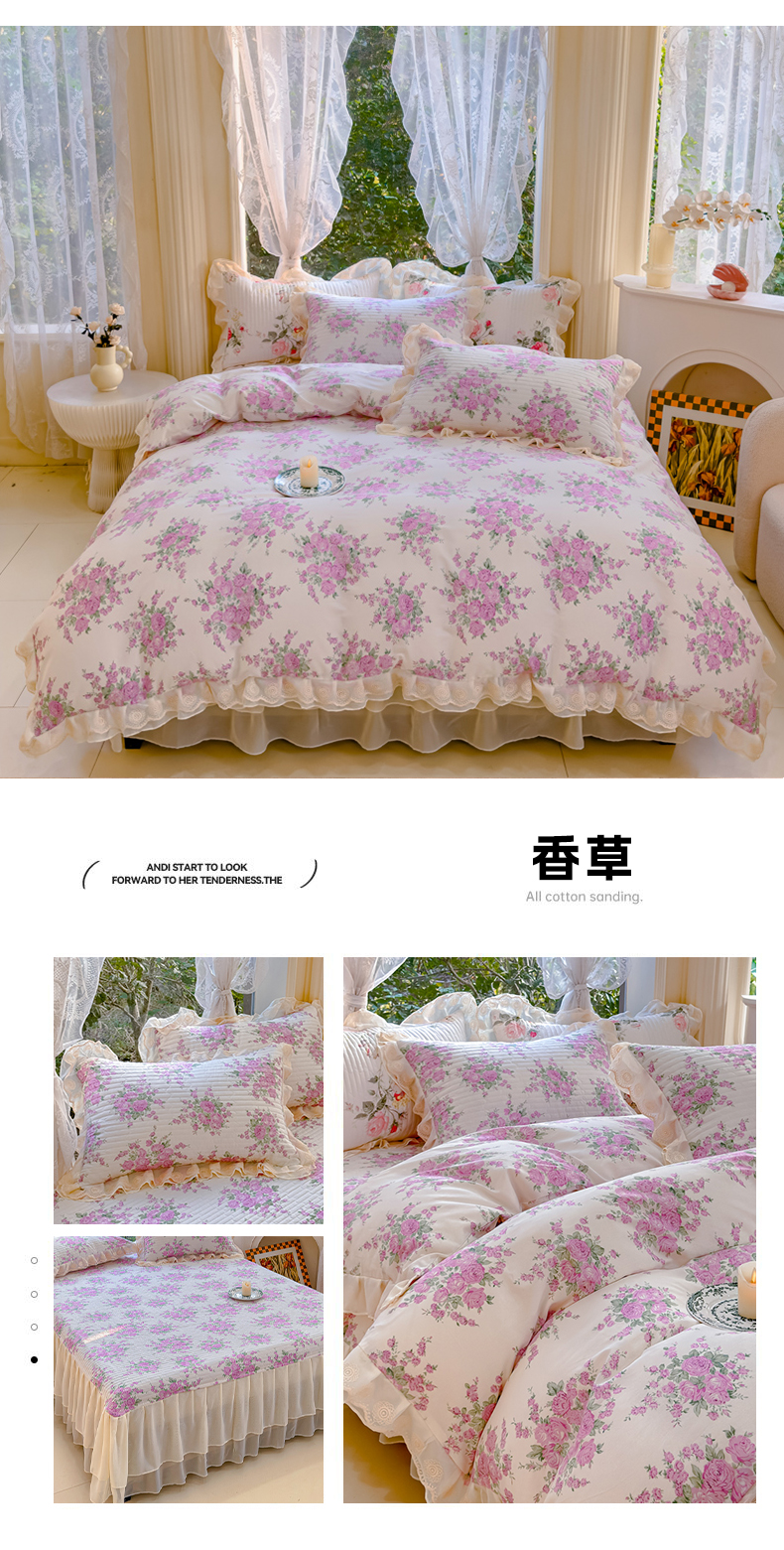 当前位置: 91家纺网 > 商品网购 > 床品套件 > 四件套 > 全棉普通四件套 > (总)木兰花 2024新款全棉印花被套蕾丝夹棉床裙款四件套