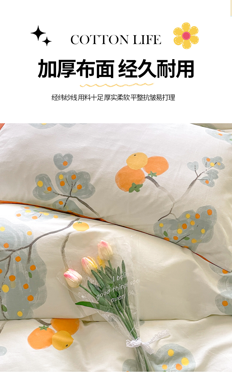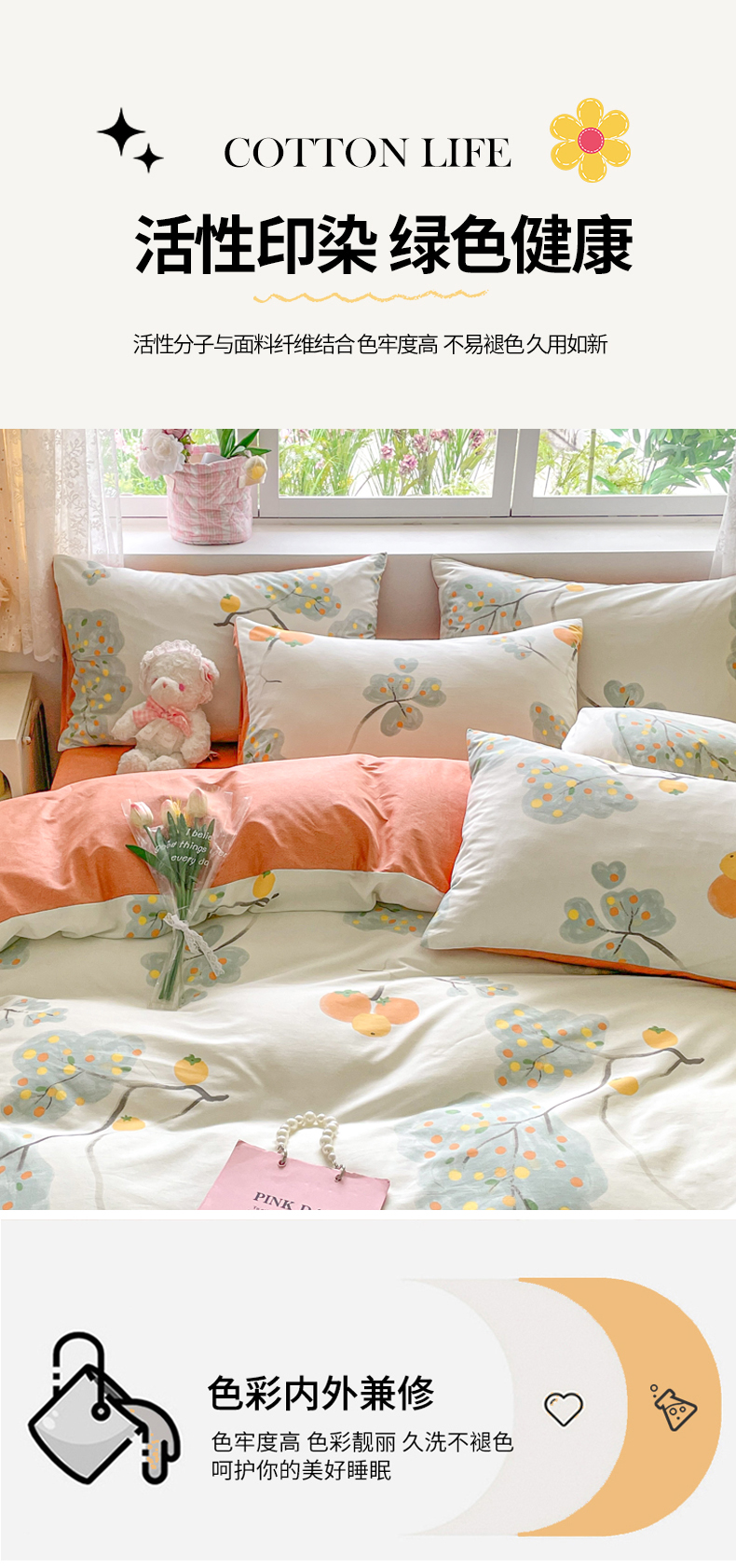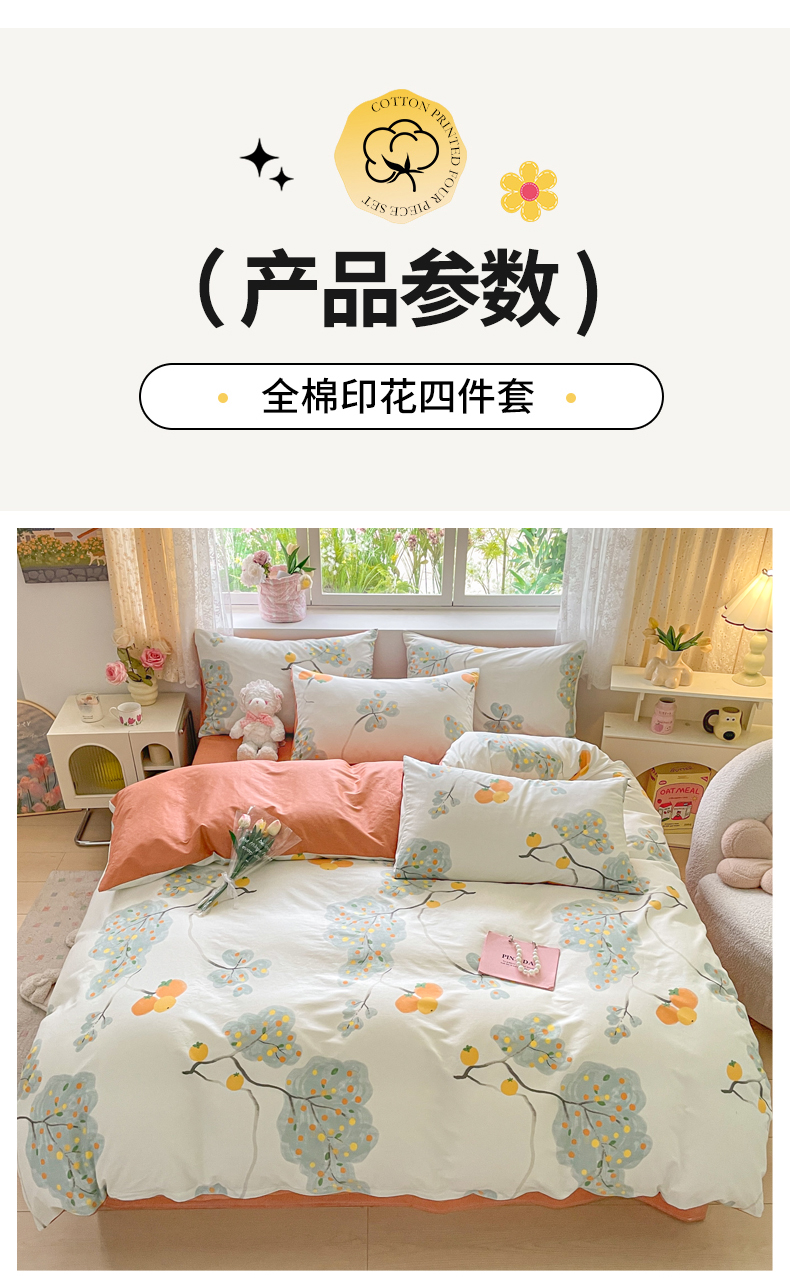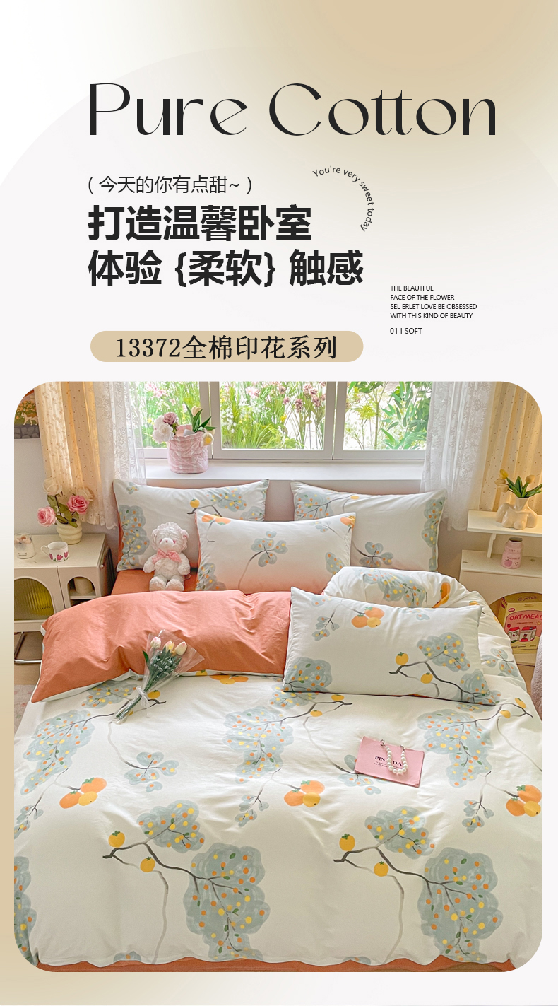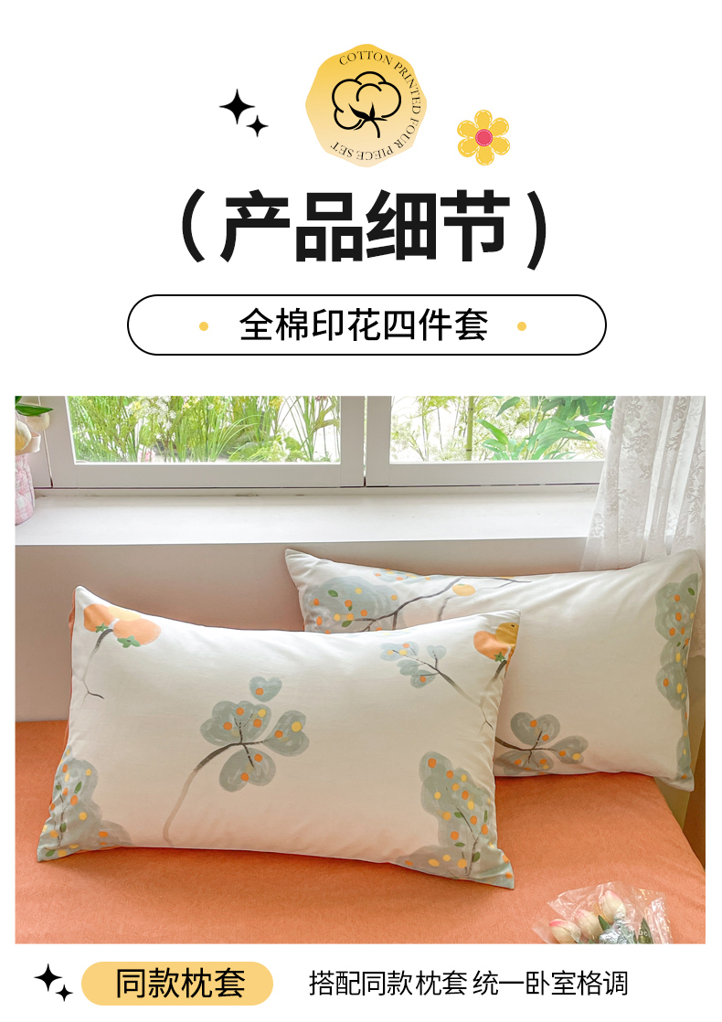 商品名称:洺兰家居 2025年新款13372全棉印花四件套纯棉小清新北欧风花卉床单床笠款套件 柿柿如意