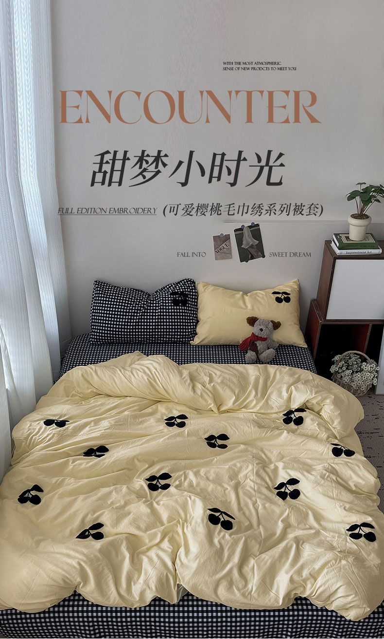 尤米 2024新款可爱樱桃系列水洗棉毛巾绣单被套 樱桃-黄格