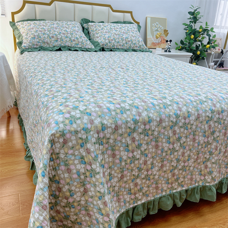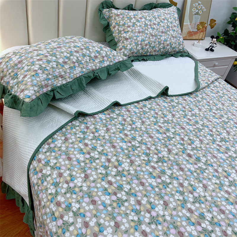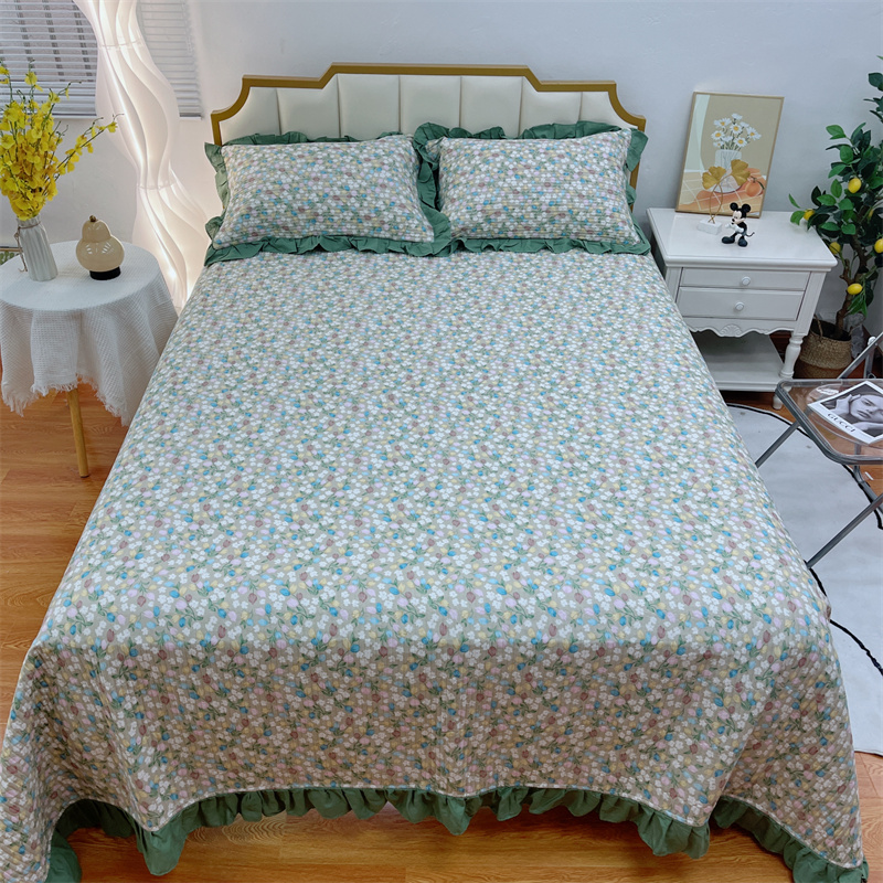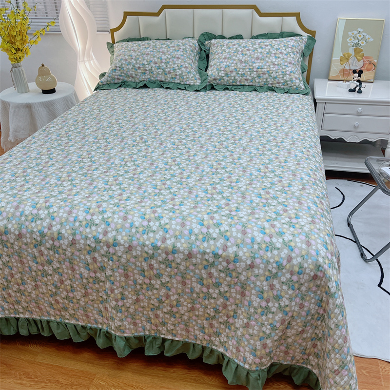 暖居 2024新款A类双层纱全棉床盖三件套防滑不跑床绗缝加厚纯棉床单 青藤
