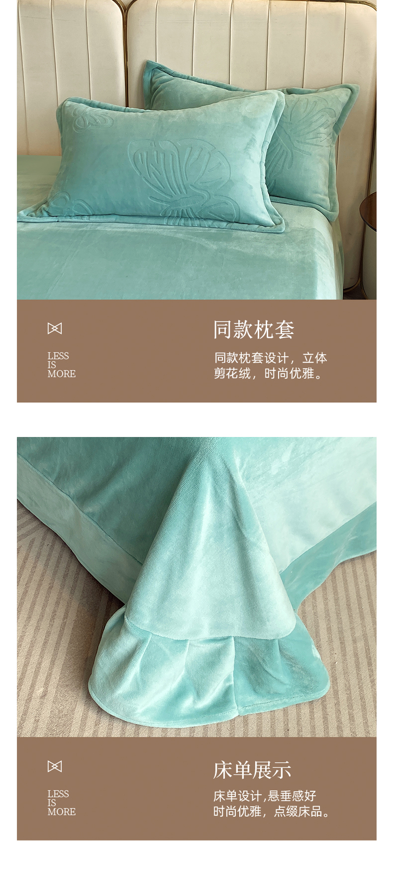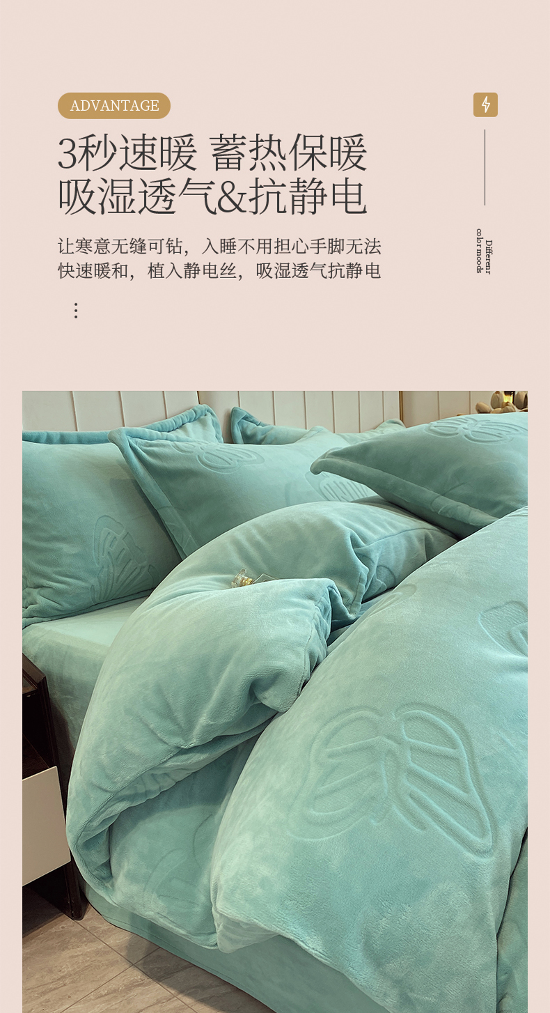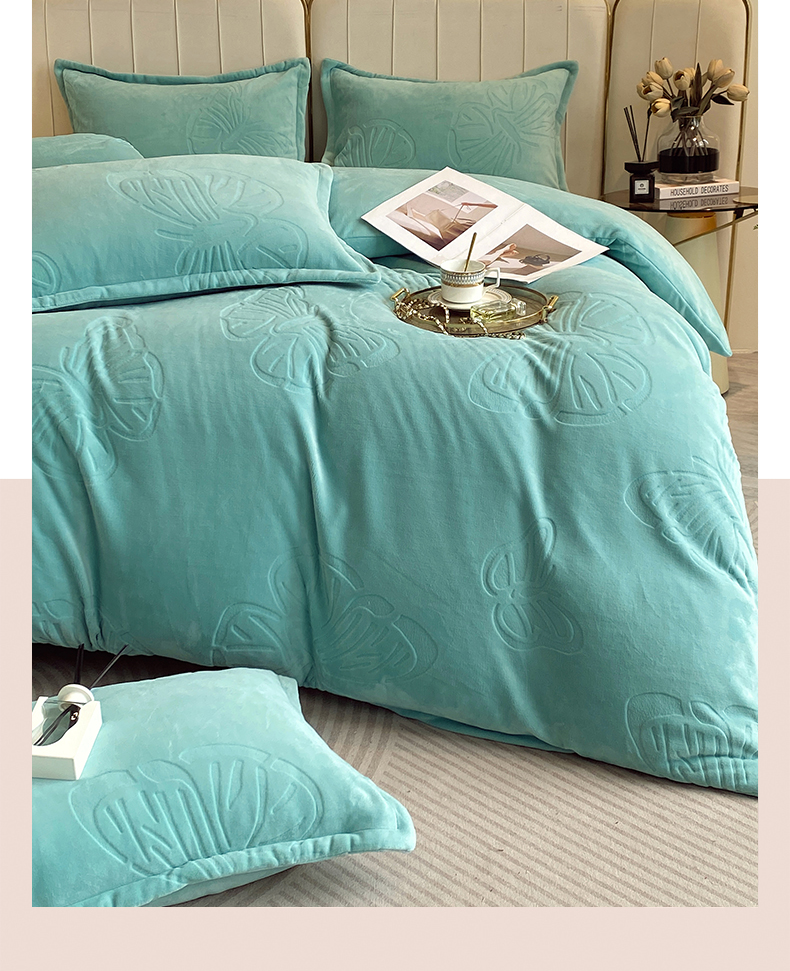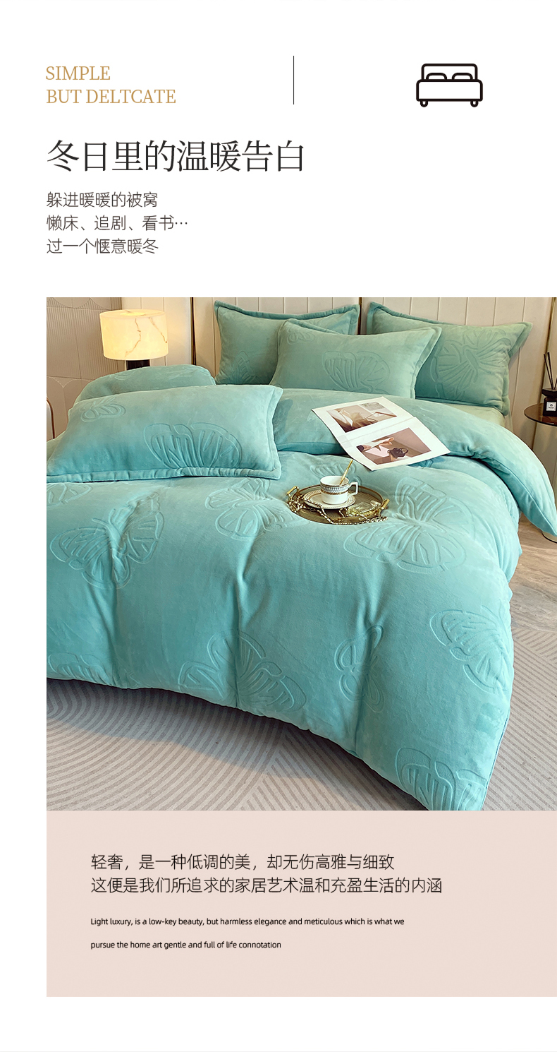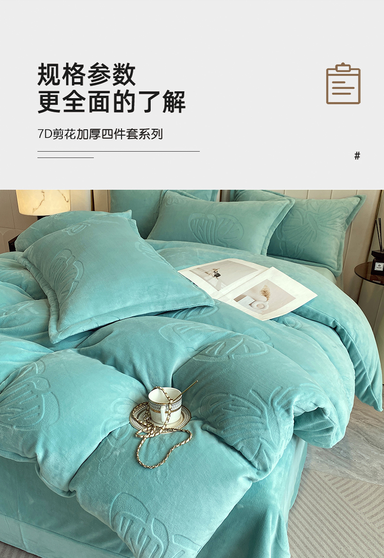 商品名称:一左一右 2024新款高克重加厚230克剪花雕花牛奶绒四件套7D立体蝴蝶纯色简约床笠 湖绿