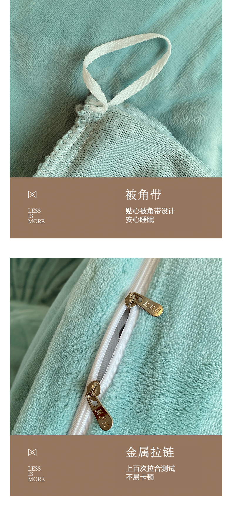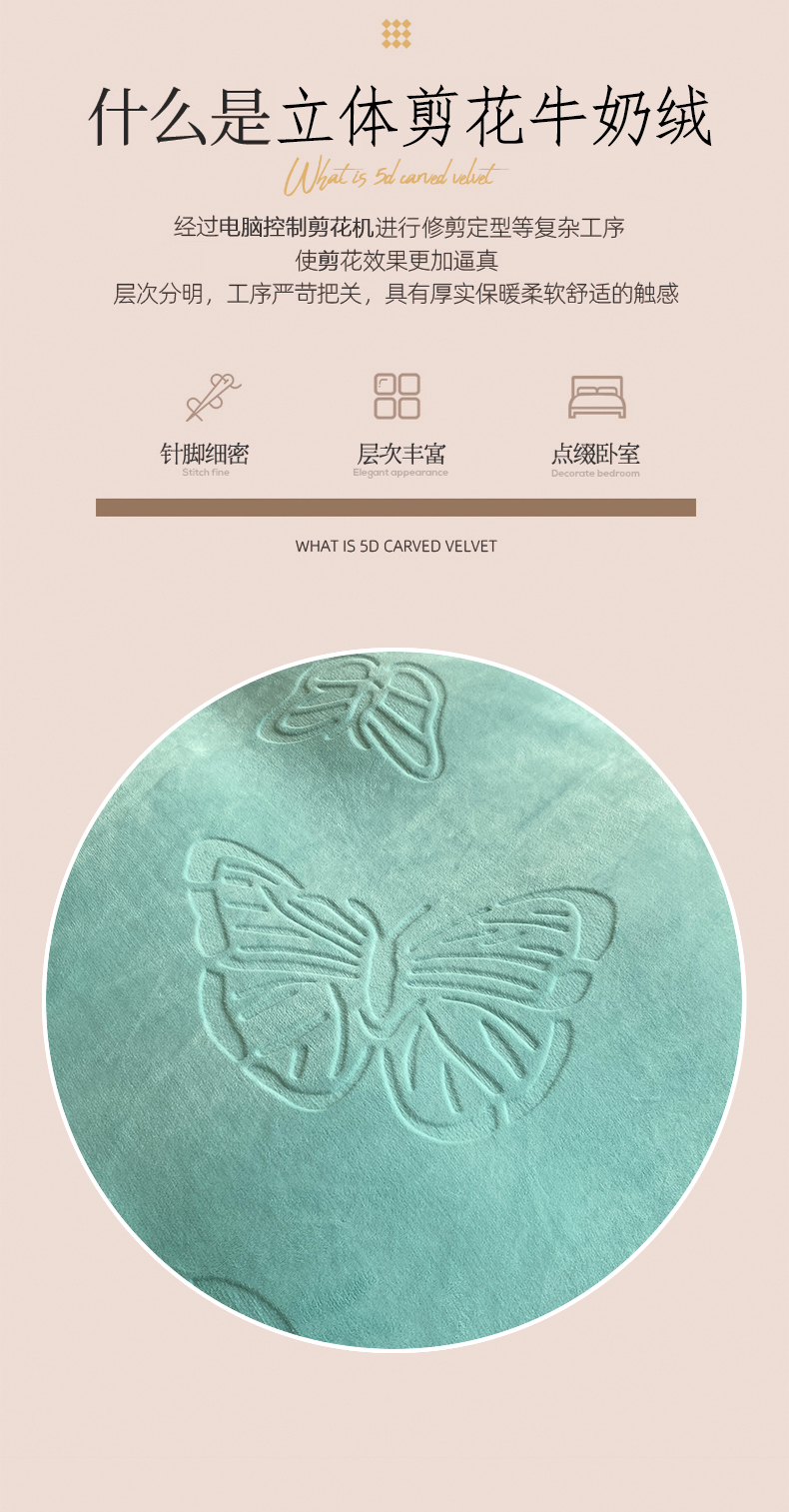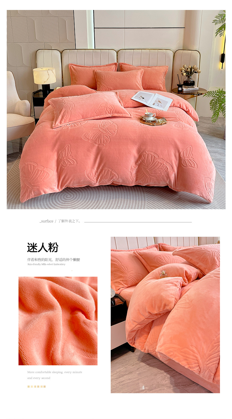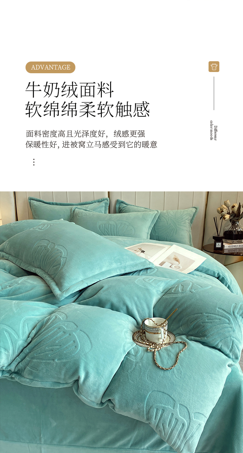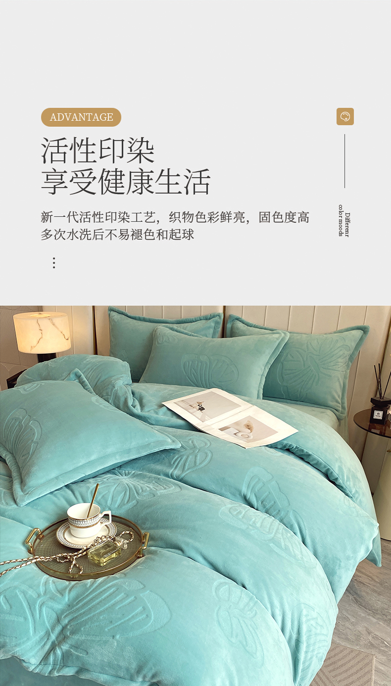 商品名称:一左一右 2024新款高克重加厚230克剪花雕花牛奶绒四件套7D立体蝴蝶纯色简约床笠 湖绿