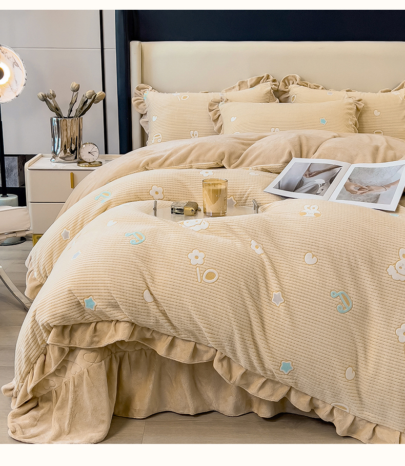 (总)恒爱家纺 2025新款牛奶绒贴布绣夹棉床裙四件套,豆沙红,浪漫紫,天空蓝,温馨粉,象牙白