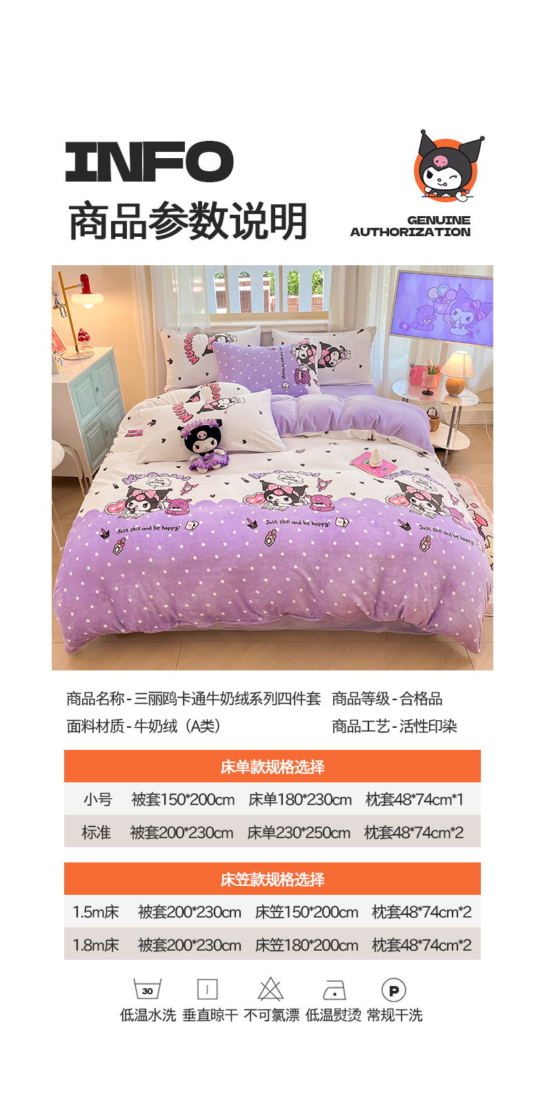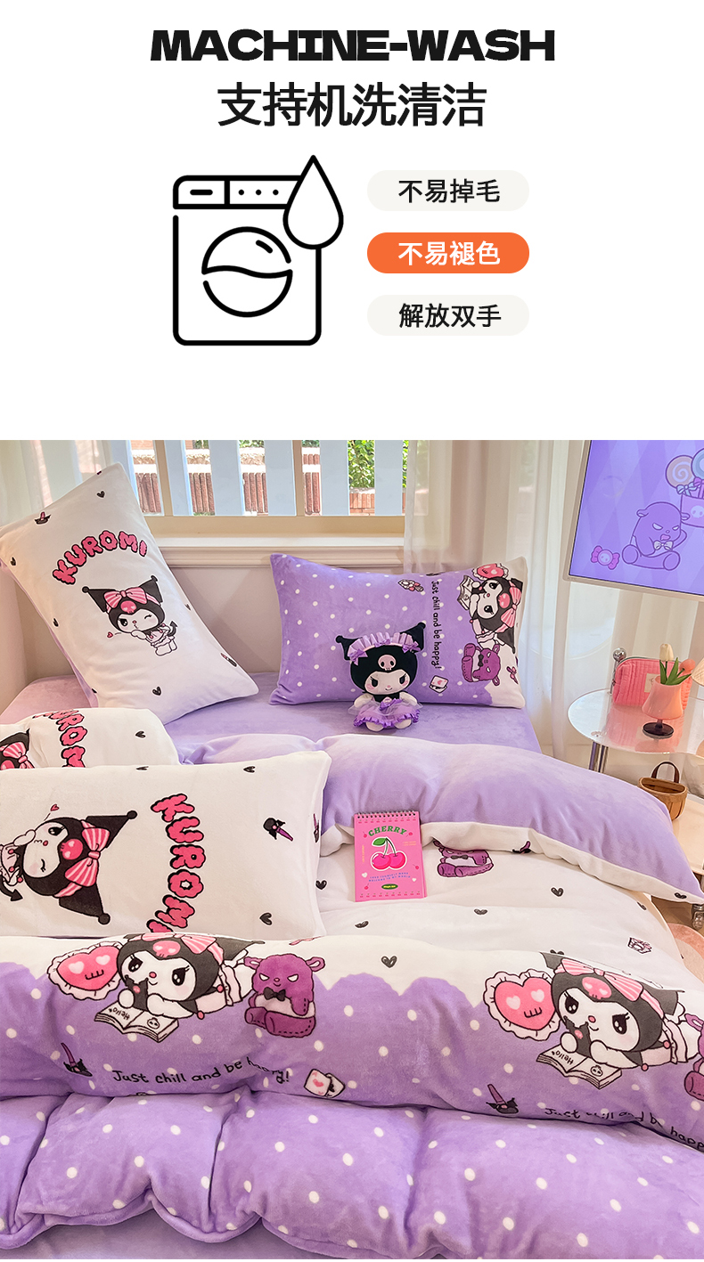 当前位置: 91家纺网 > 商品网购 > 床品套件 > 四件套 > 牛奶绒四件套 > 桃子家居 2024新款三丽鸥卡通加厚高克重200克牛奶绒系列四件套 绒三丽鸥-公主库洛米