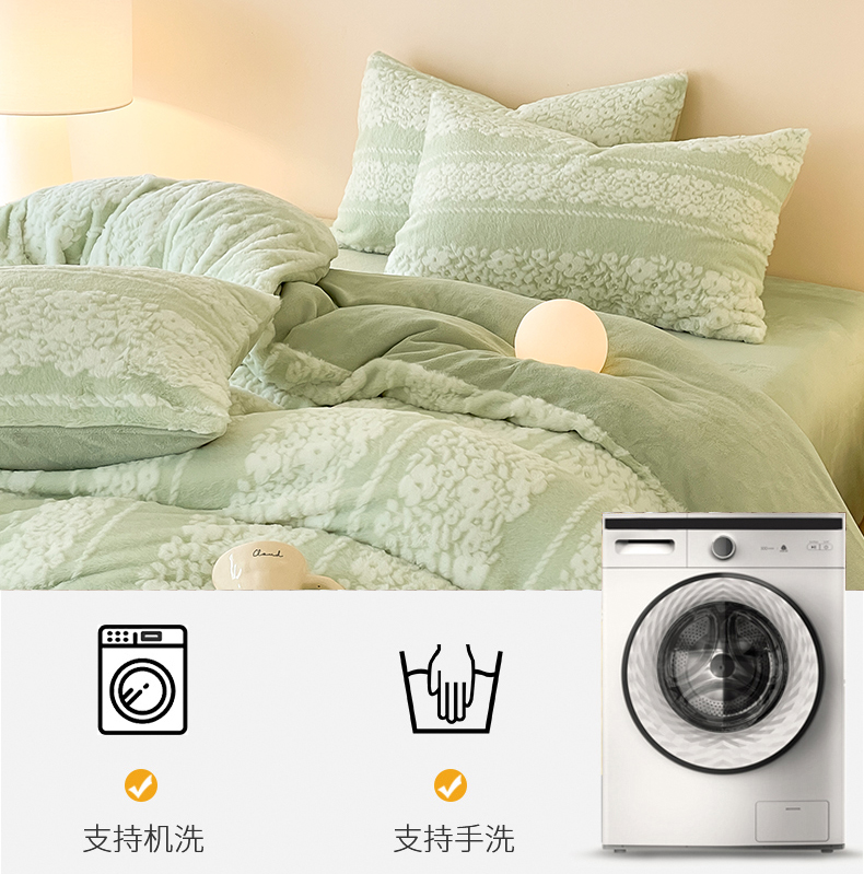 商品名称:金爱家 2024新品全消光A类纯色獭兔毛绒立体牛奶绒兔毛雕花350克四件套 兔毛百合花绿色