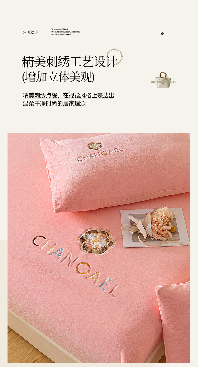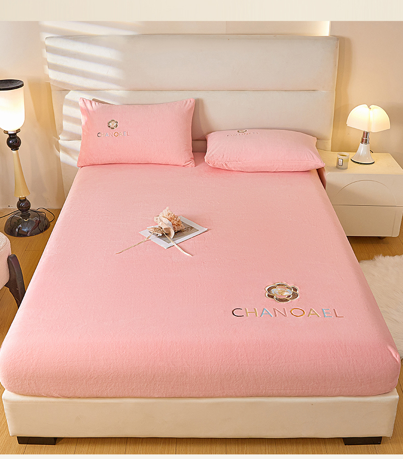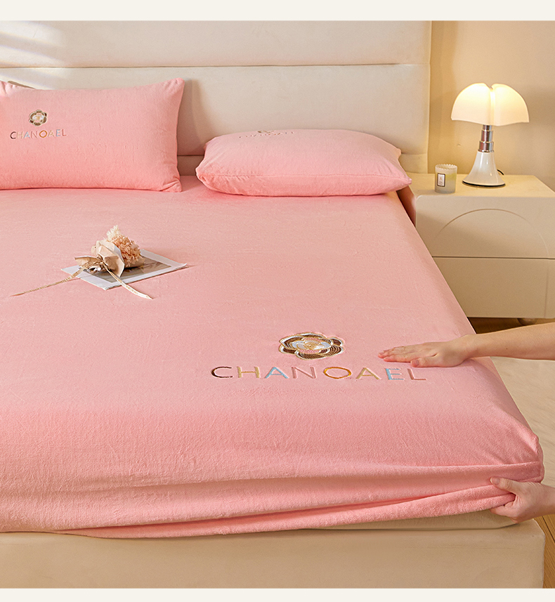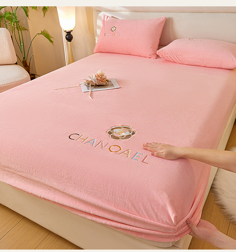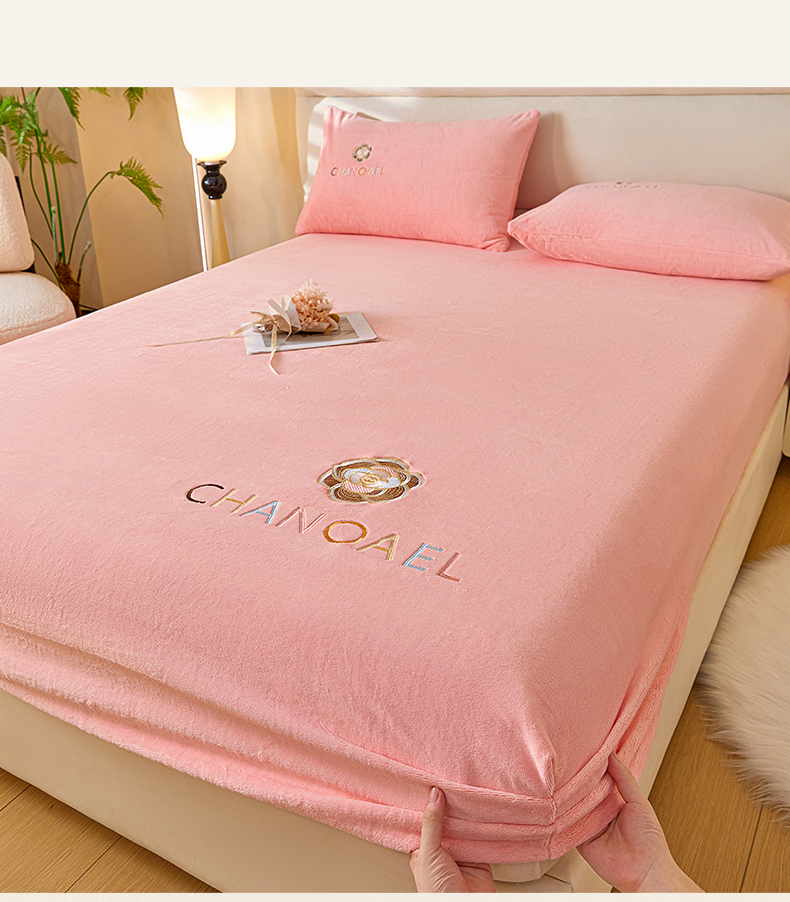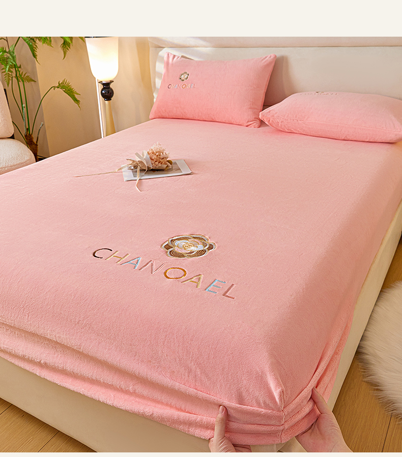 摩妮卡 2025新品牛奶绒刺绣床笠床垫保护三件套-山茶花 香人粉