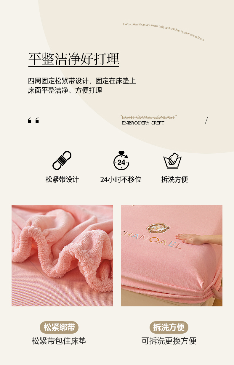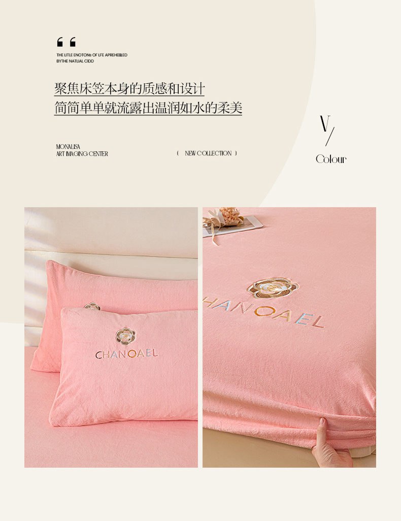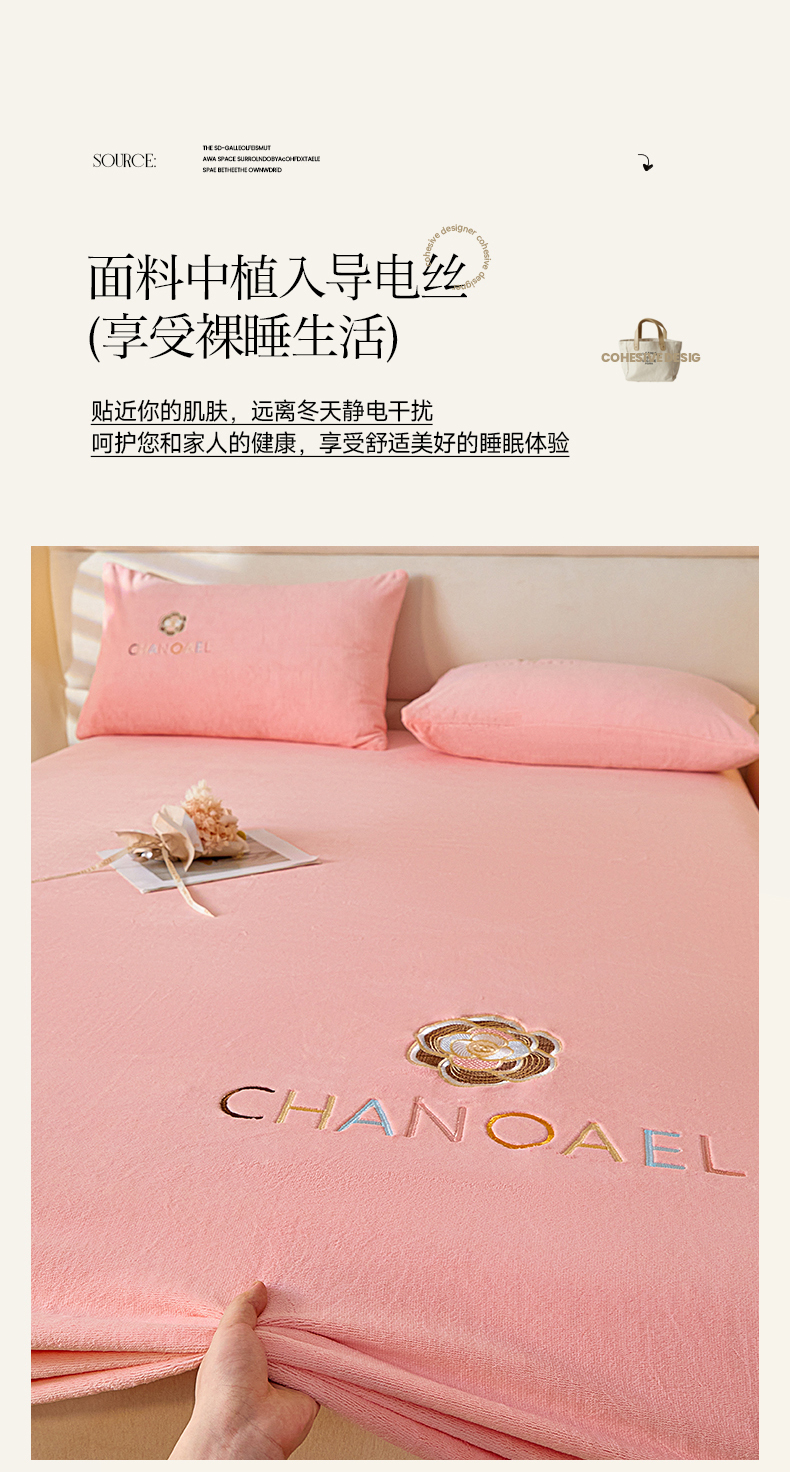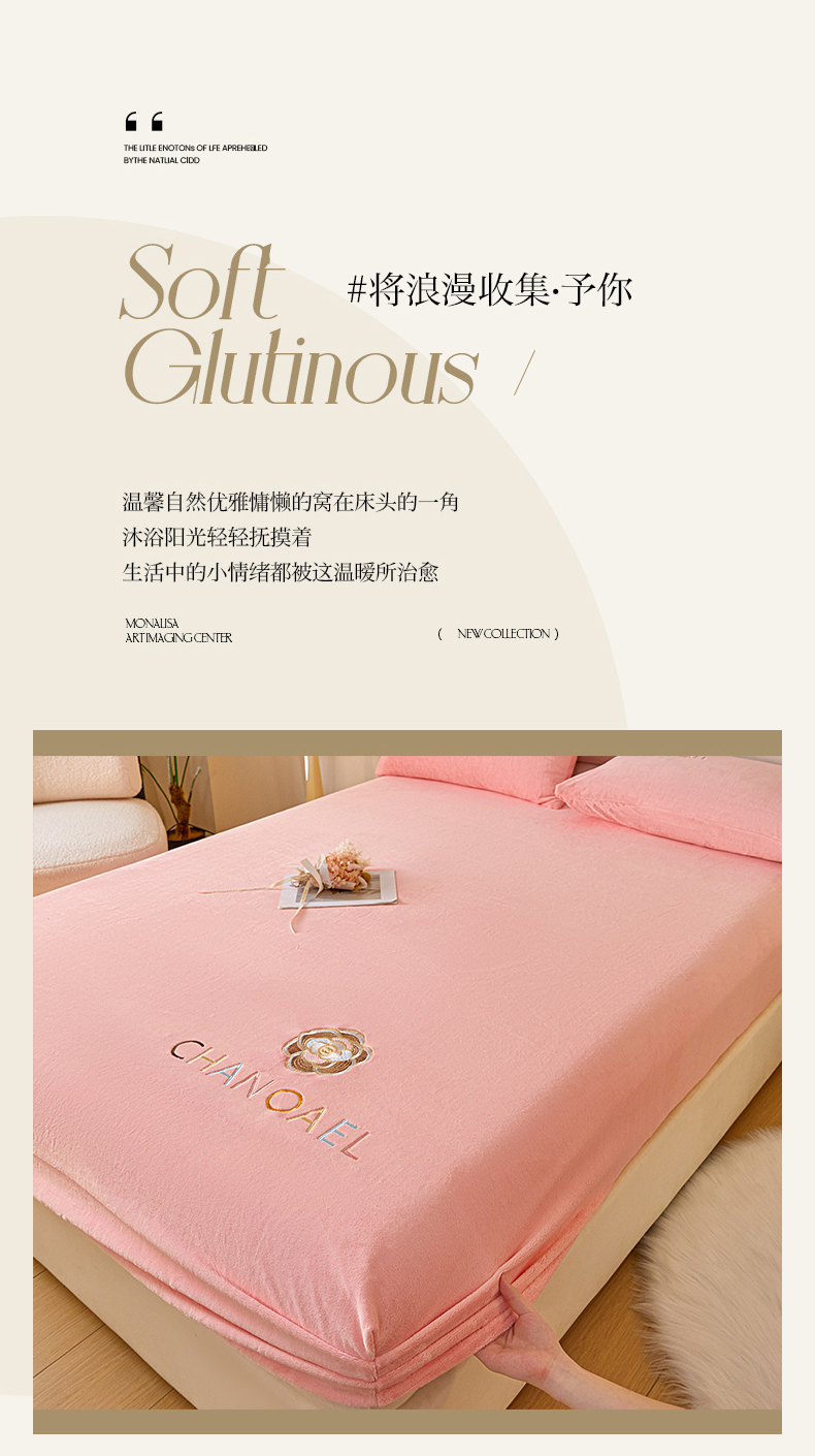 摩妮卡 2025新品牛奶绒刺绣床笠床垫保护三件套-山茶花 香人粉