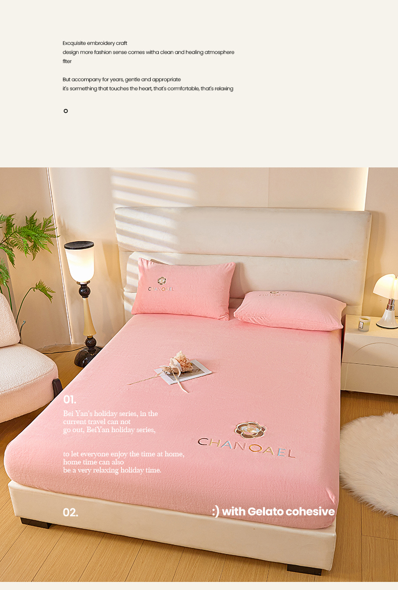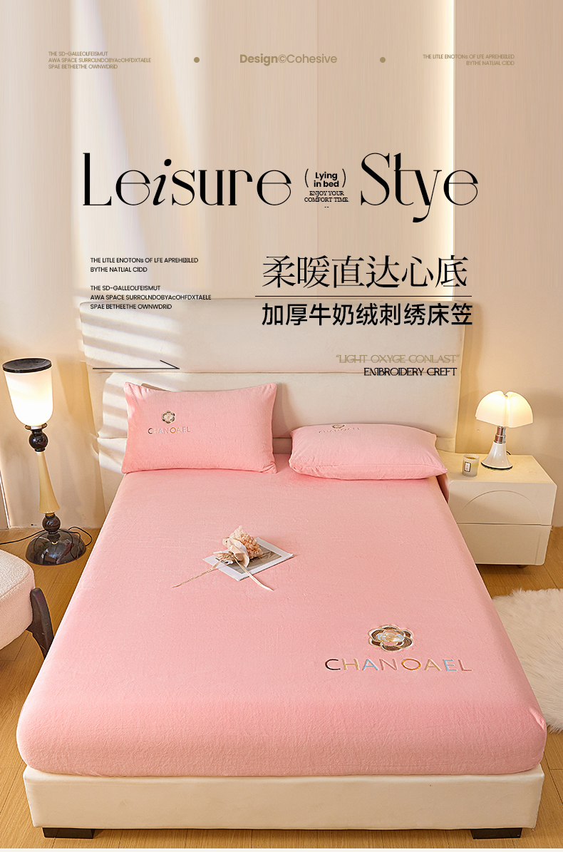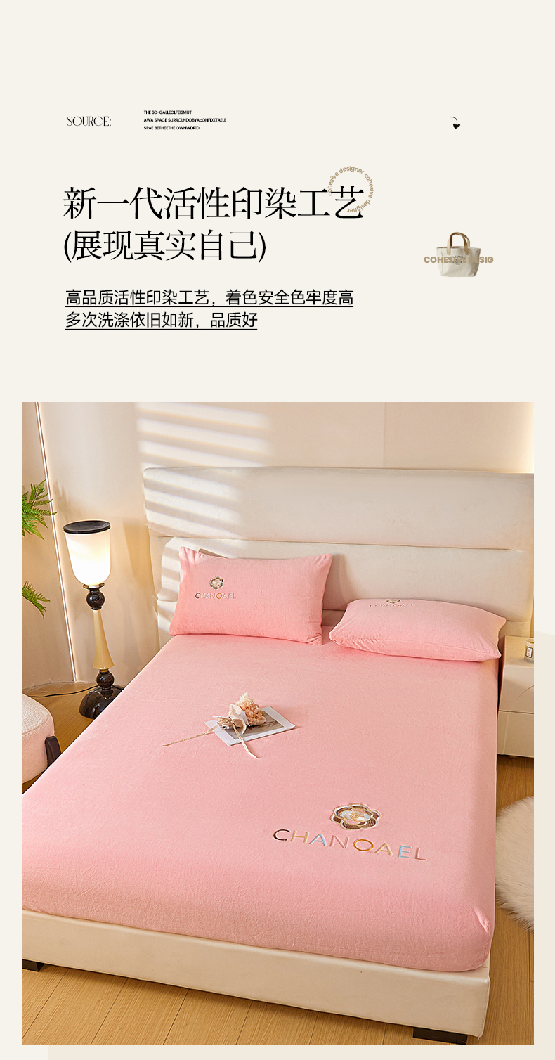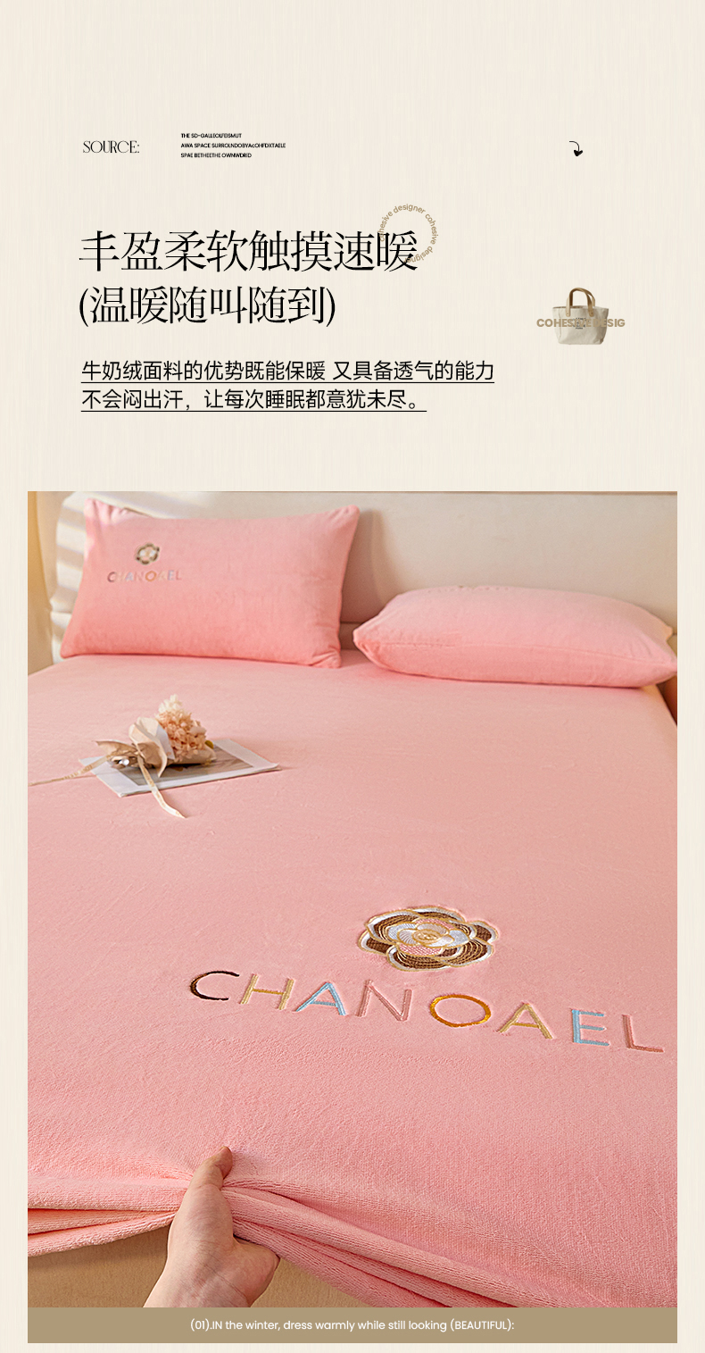 • 91家纺网 家纺一手货源 找家纺 摩妮卡 2025新品牛奶绒刺绣床笠床垫保护三件套-山茶花 香人粉