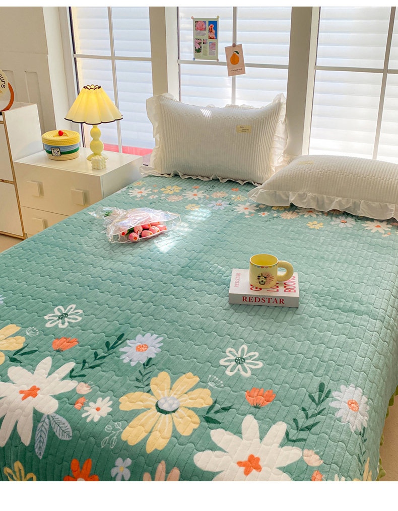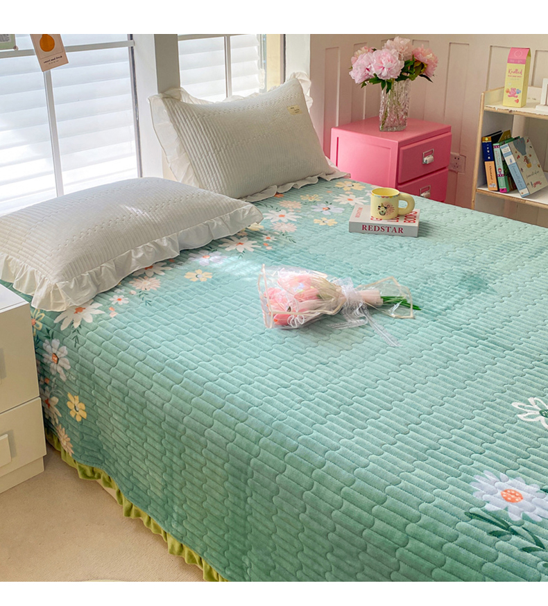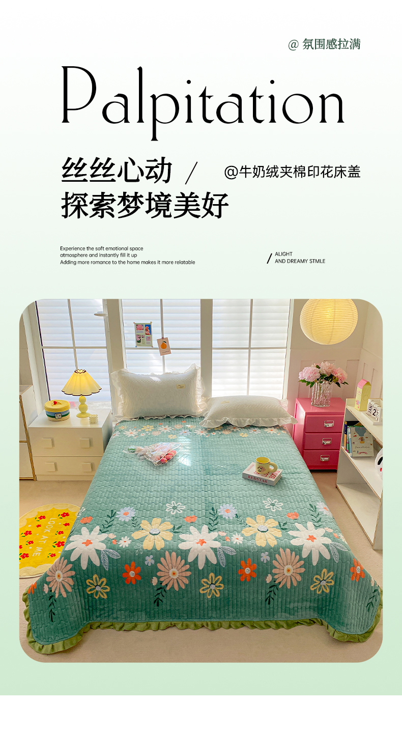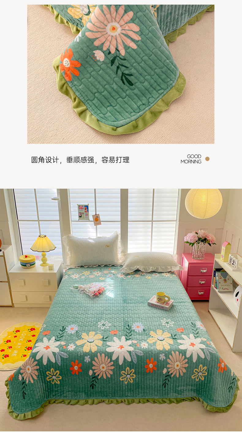 胜权家纺 2024秋冬新款印花牛奶绒加厚保暖圆角花边夹棉床盖 花开浪漫绿