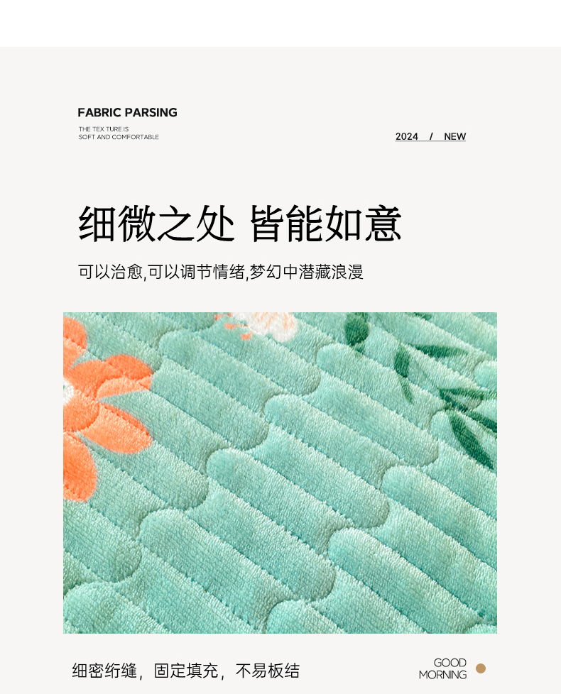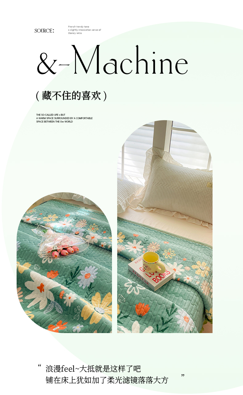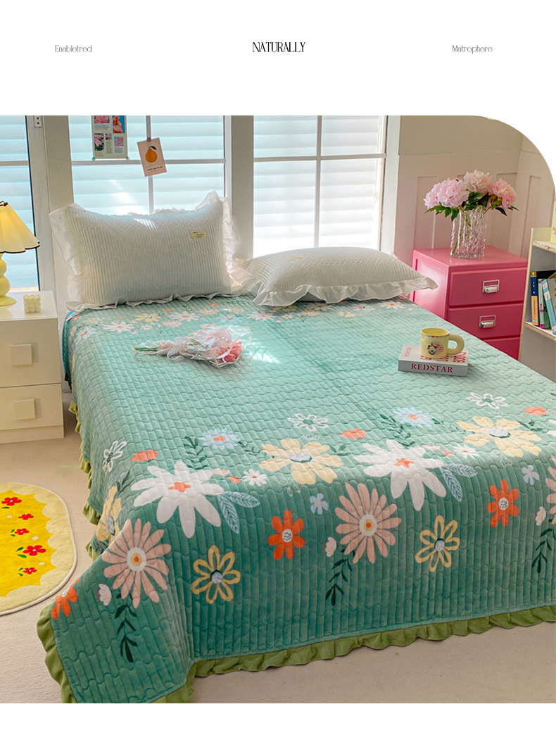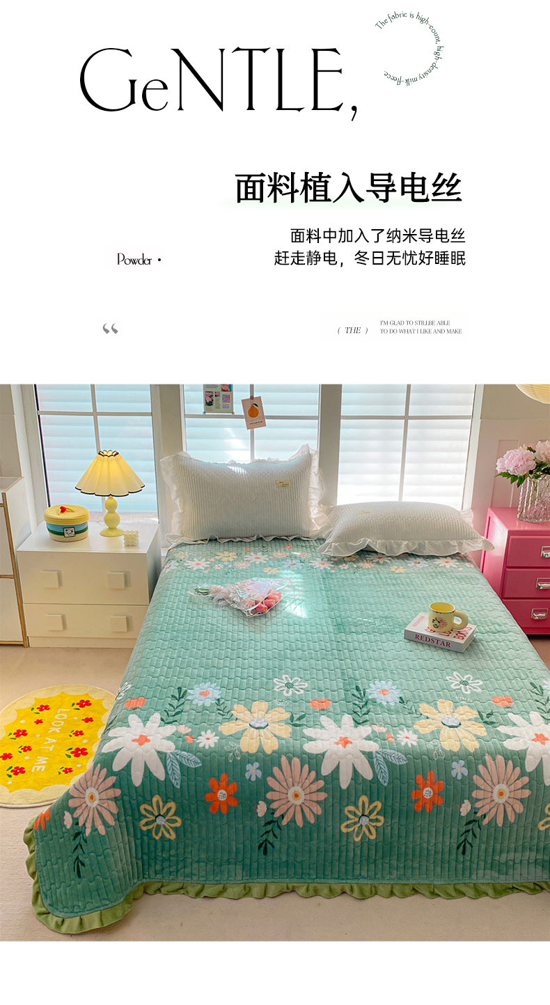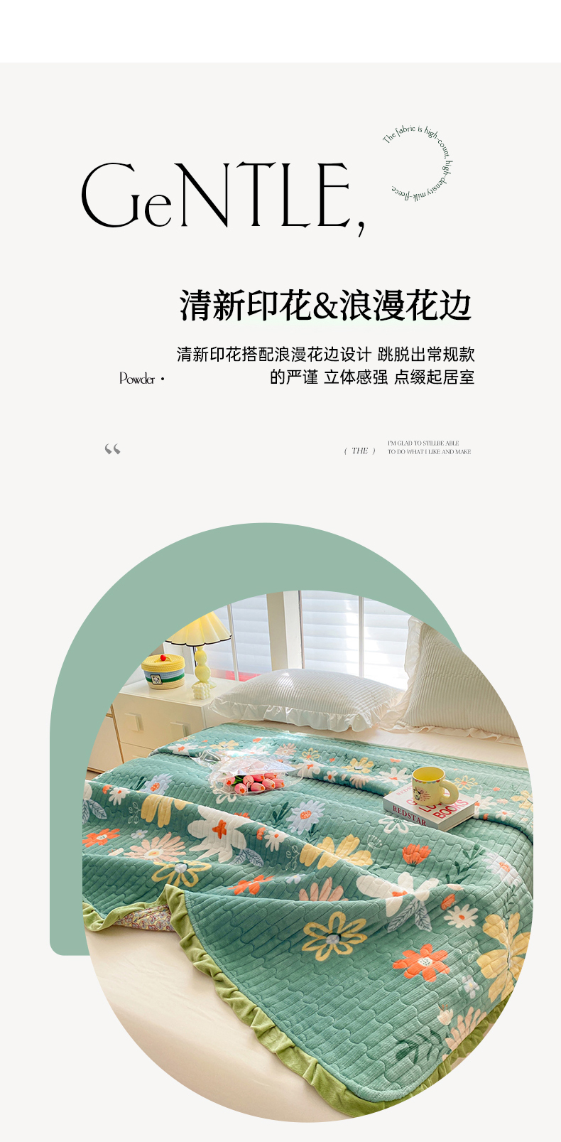 胜权家纺 2024秋冬新款印花牛奶绒加厚保暖圆角花边夹棉床盖 花开浪漫绿