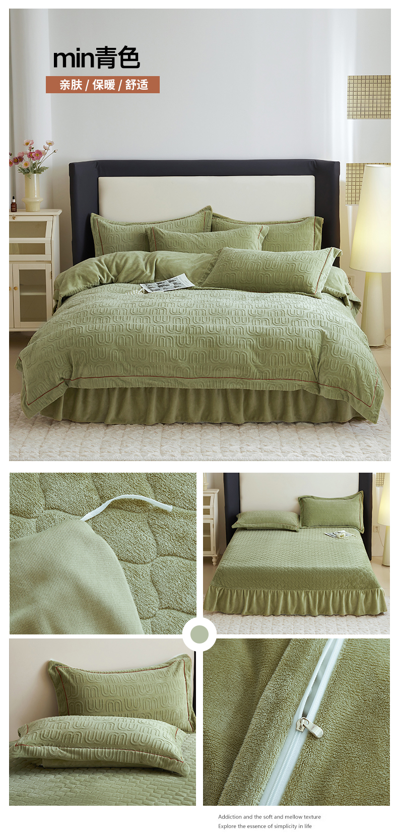 商品名称:舒梦琪家纺 2024新款雕花绒床盖一字绣四件套 min青色