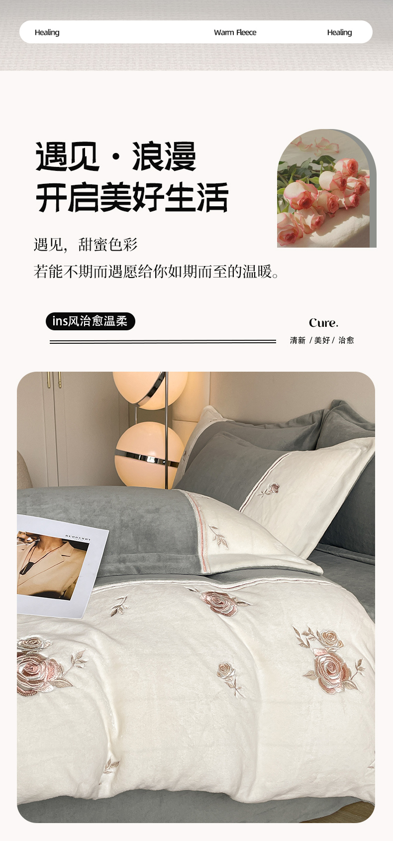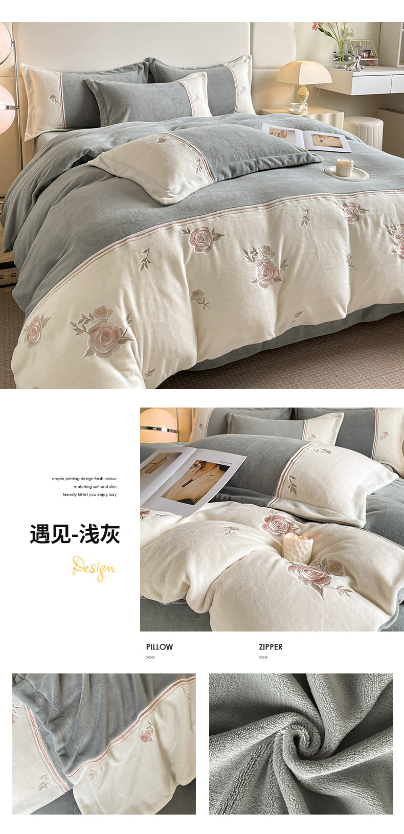 商品名称:金牛座家纺 2025新款牛奶绒拼接刺绣四件套-遇见系列 遇见-浅灰