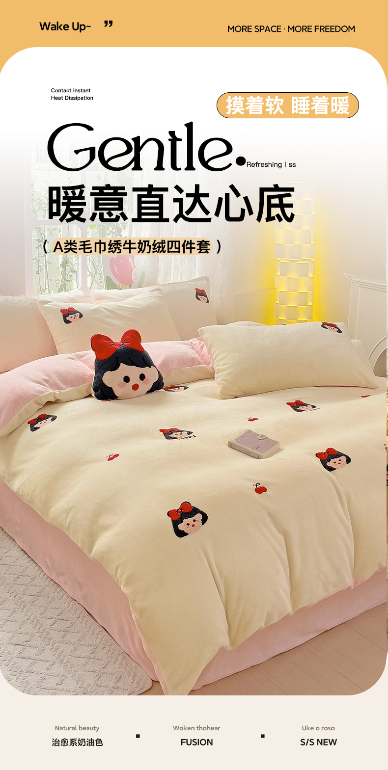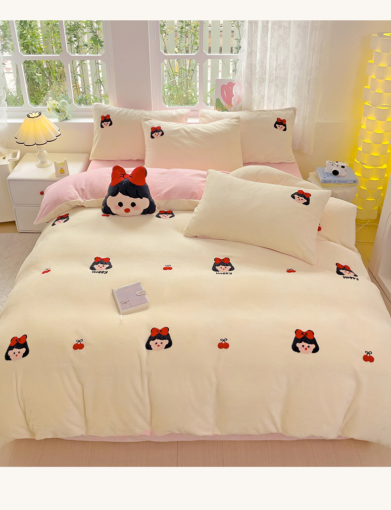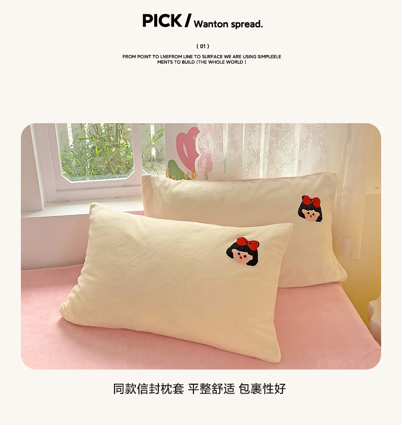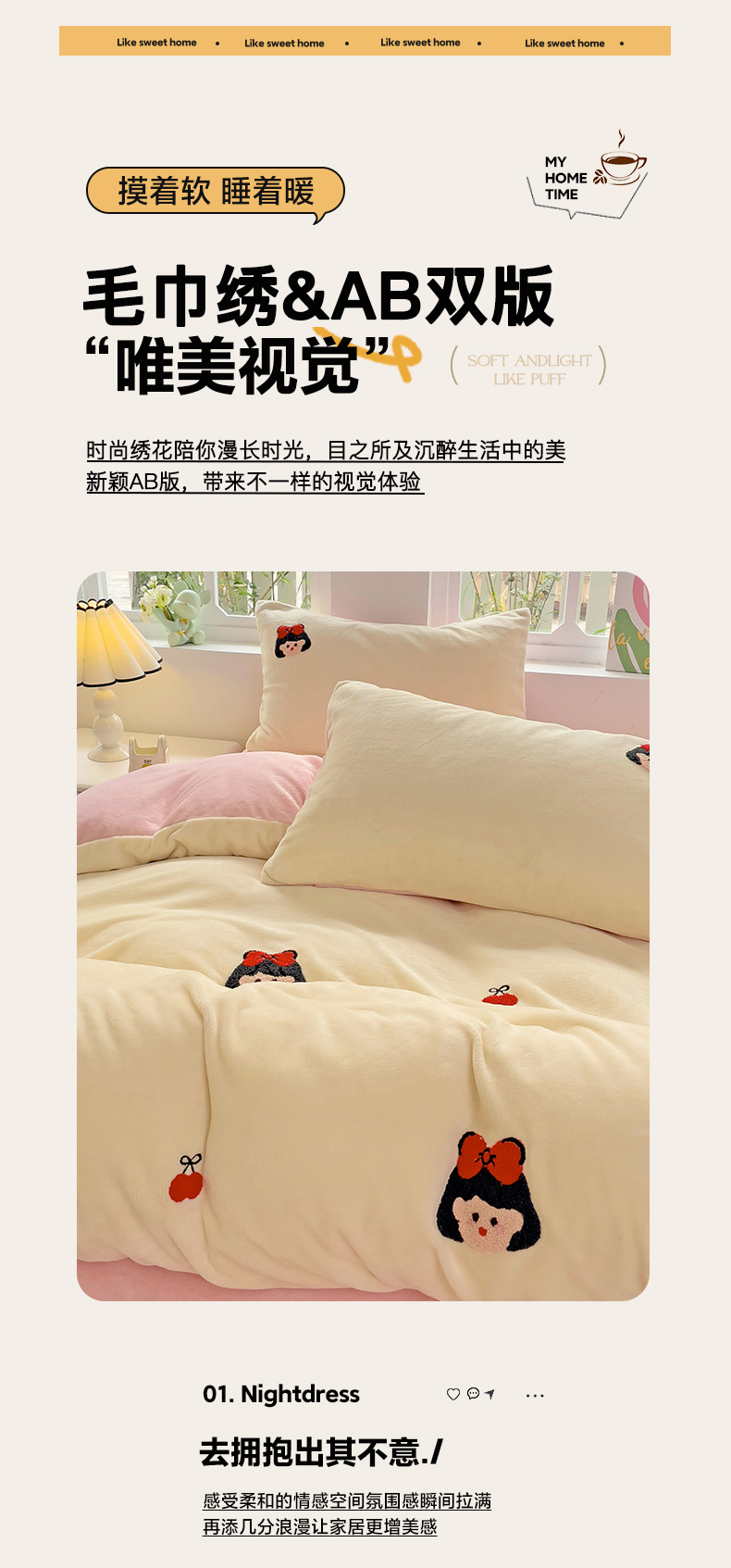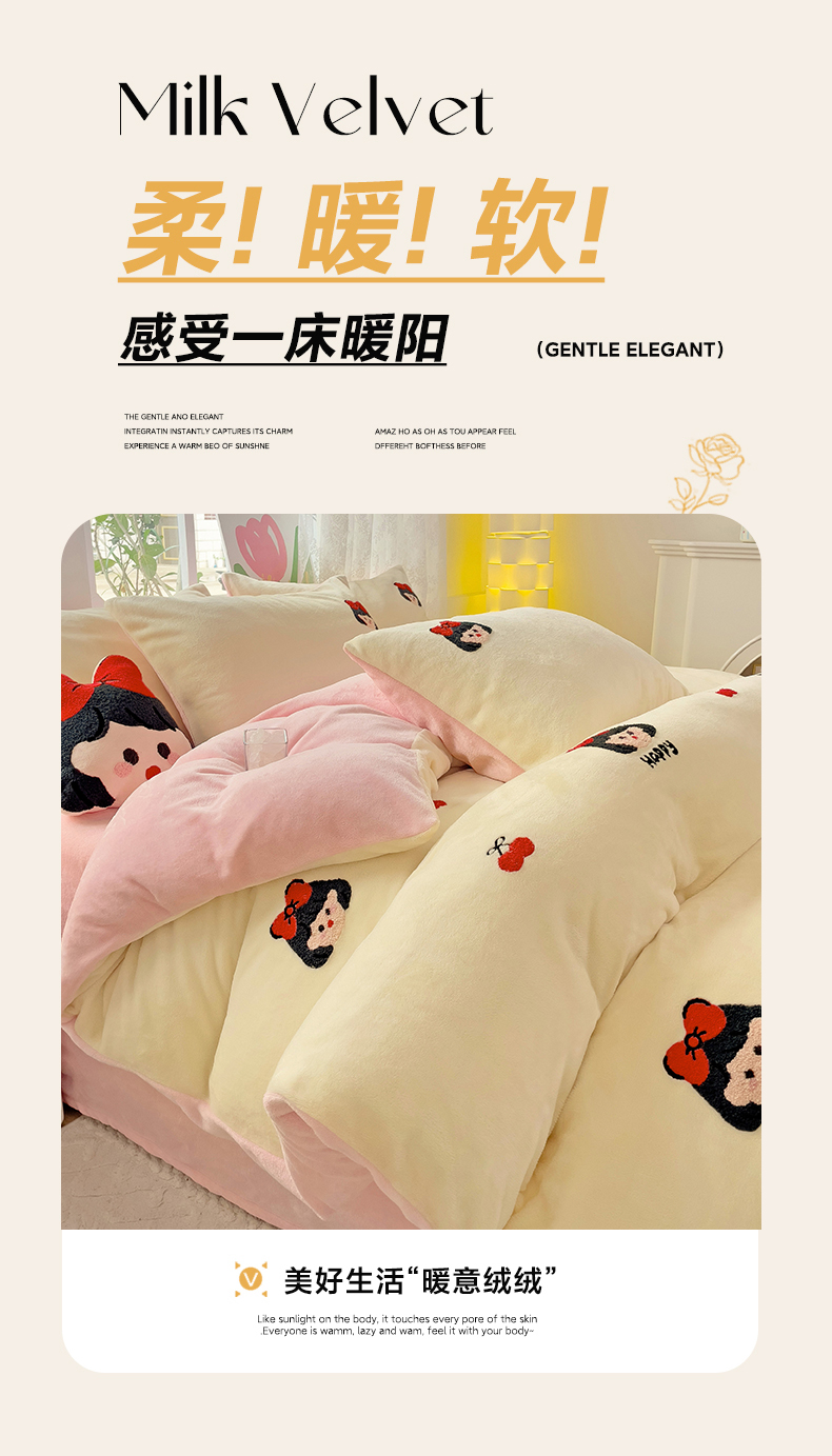 当前位置: 91家纺网 > 商品网购 > 床品套件 > 四件套 > 牛奶绒四件套 > 寐居家纺 2024新款纯色牛奶绒毛巾绣四件套 樱桃女孩-粉白