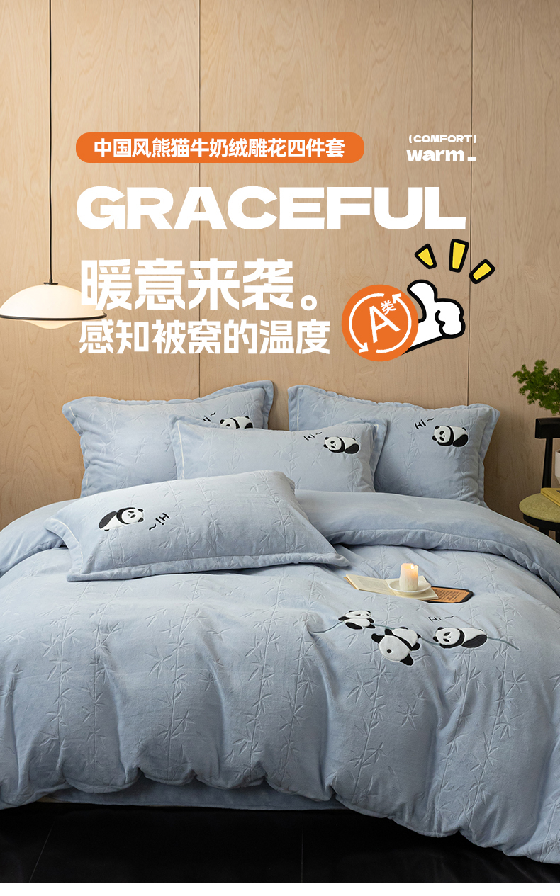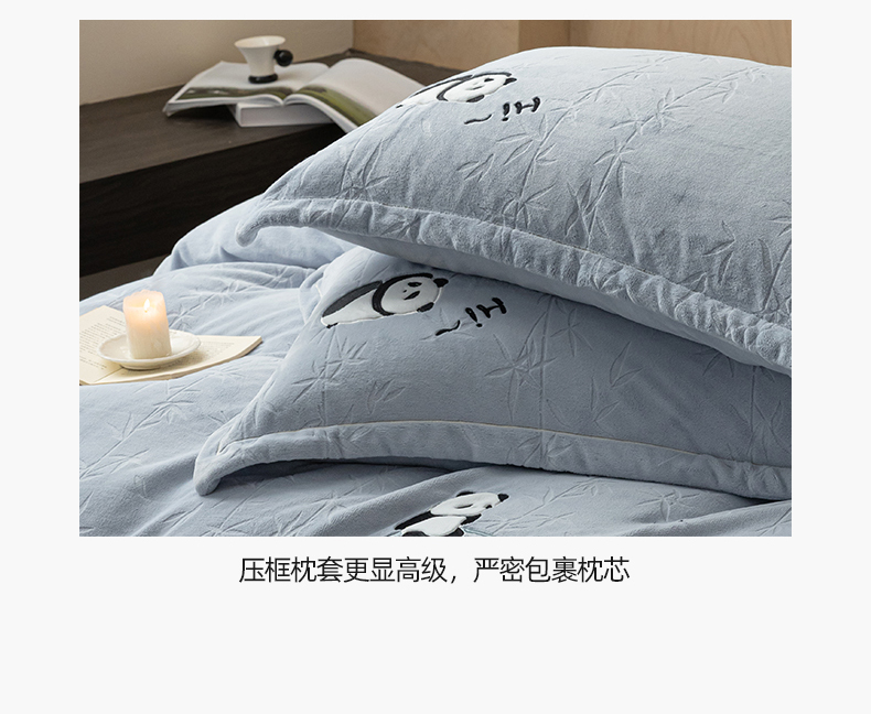 桃子家居 2024新款A类烂花雕花贴布绣刺绣轻奢一字绣压框枕套中国风熊猫牛奶绒四件套 绒刺绣-熊猫墨竹蓝