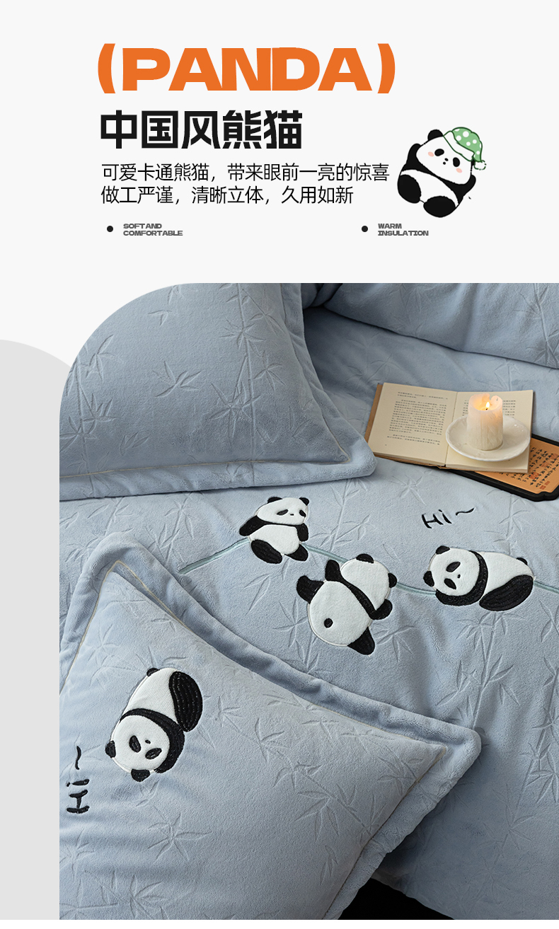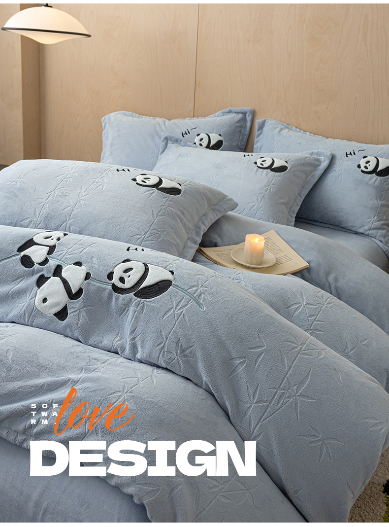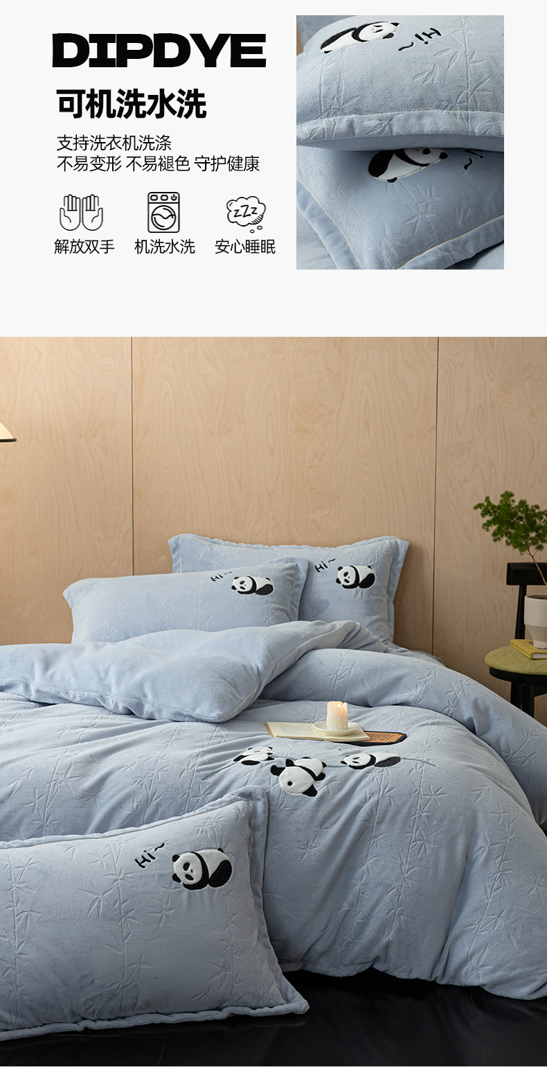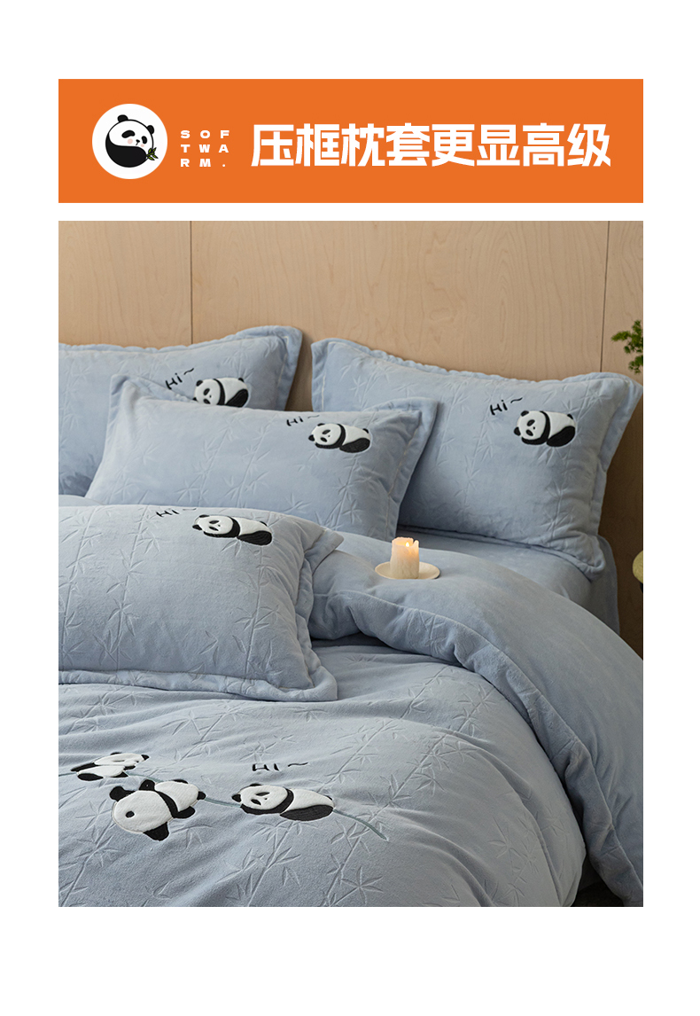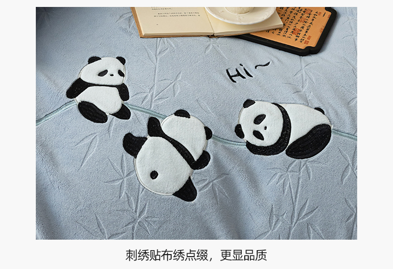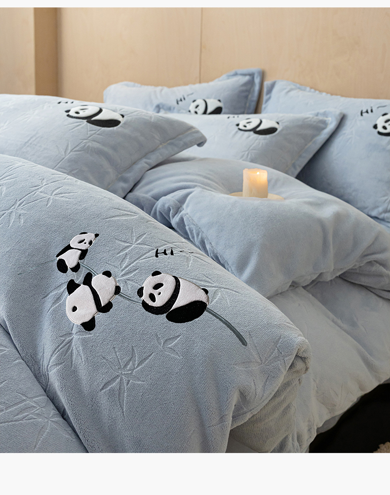 商品名称:桃子家居 2024新款A类烂花雕花贴布绣刺绣轻奢一字绣压框枕套中国风熊猫牛奶绒四件套 绒刺绣-熊猫墨竹蓝