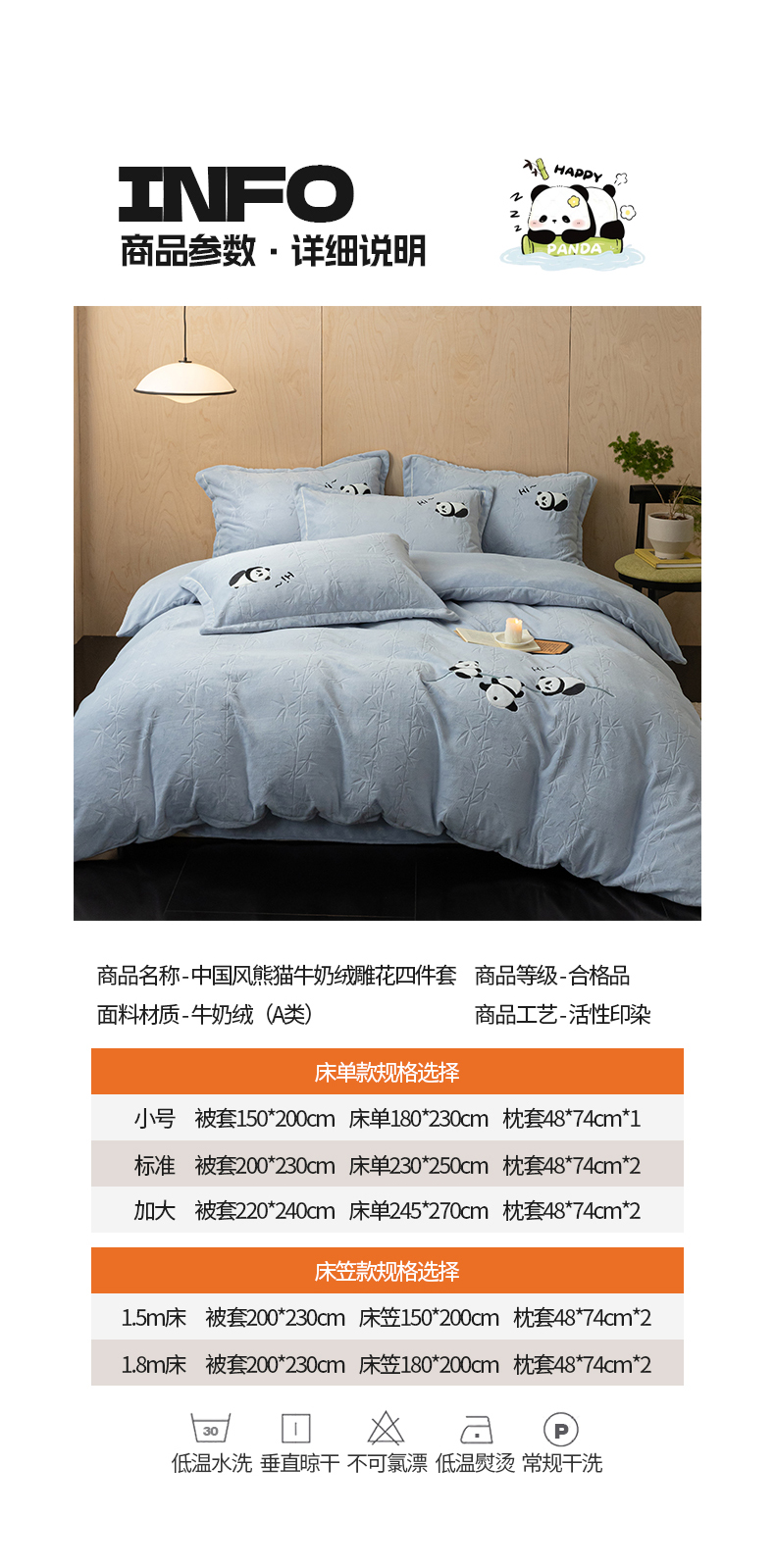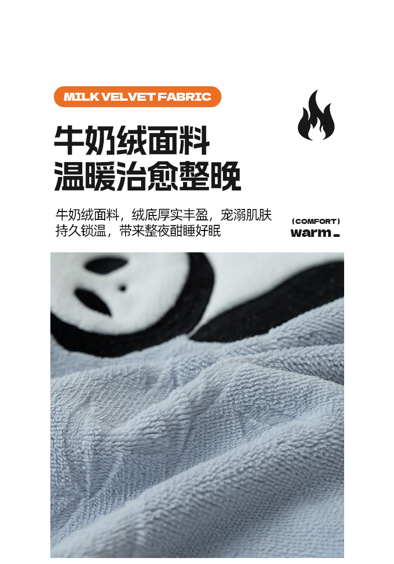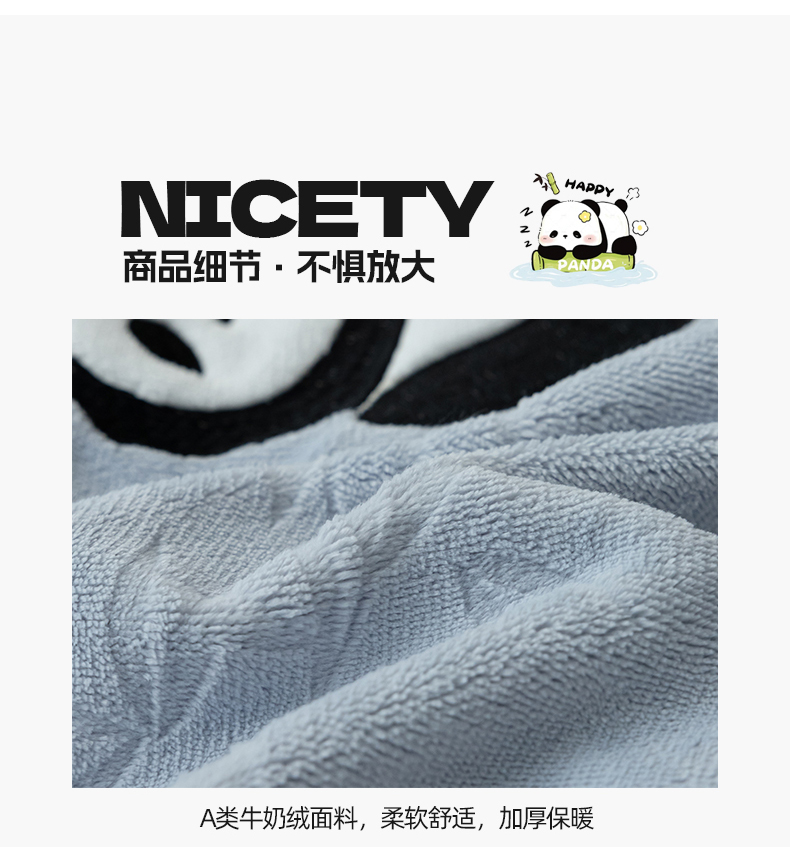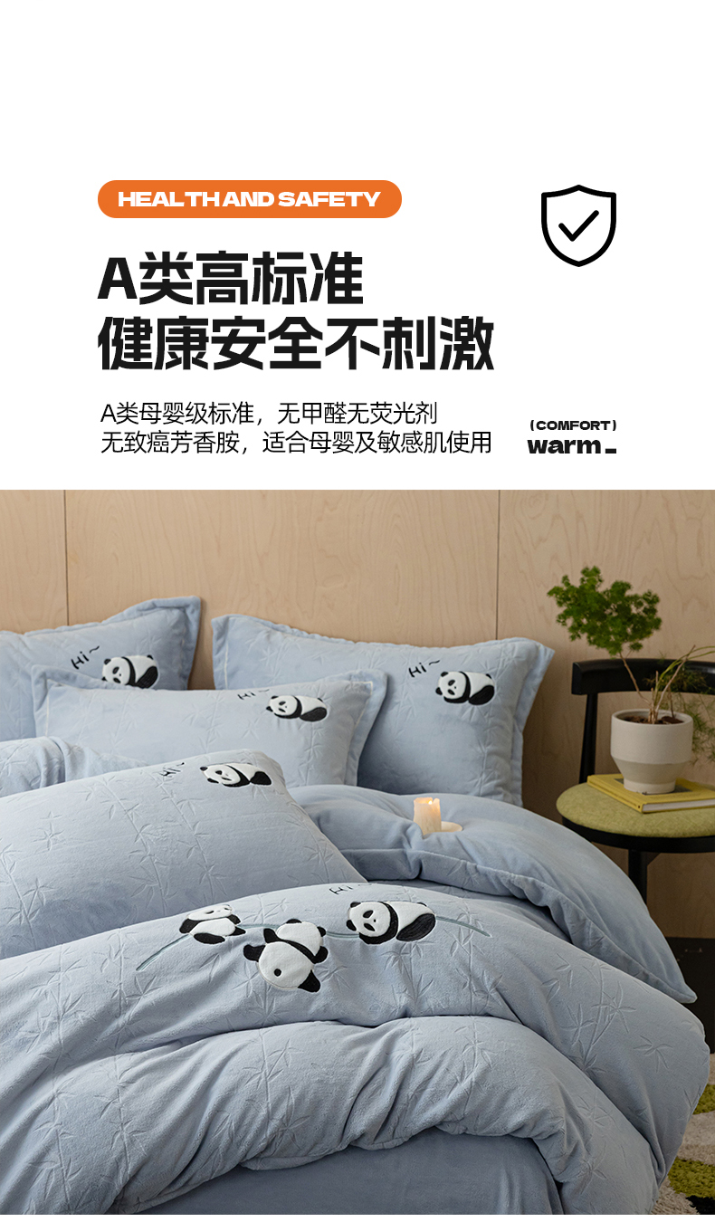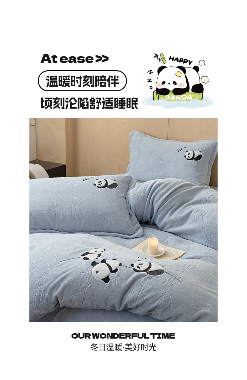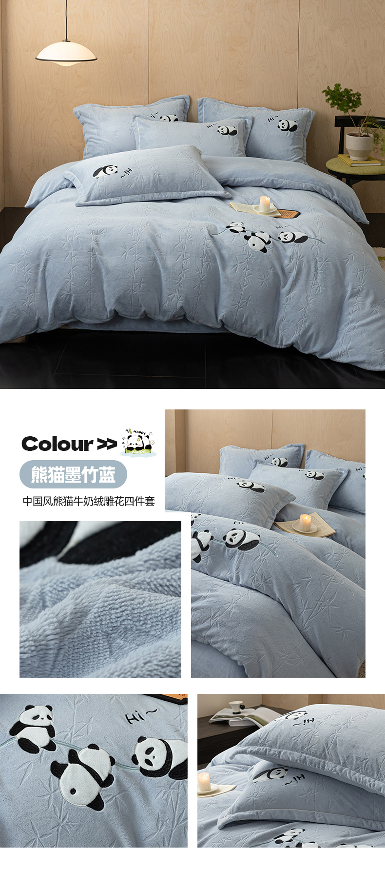 商品名称:桃子家居 2024新款A类烂花雕花贴布绣刺绣轻奢一字绣压框枕套中国风熊猫牛奶绒四件套 绒刺绣-熊猫墨竹蓝