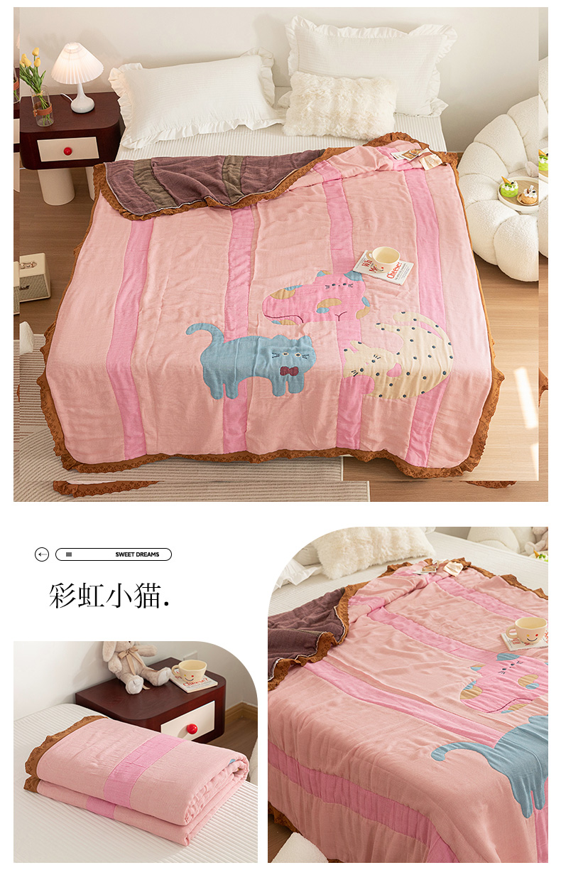 乐家毛巾被 2024新款十层纱布泡芙被 彩虹小猫