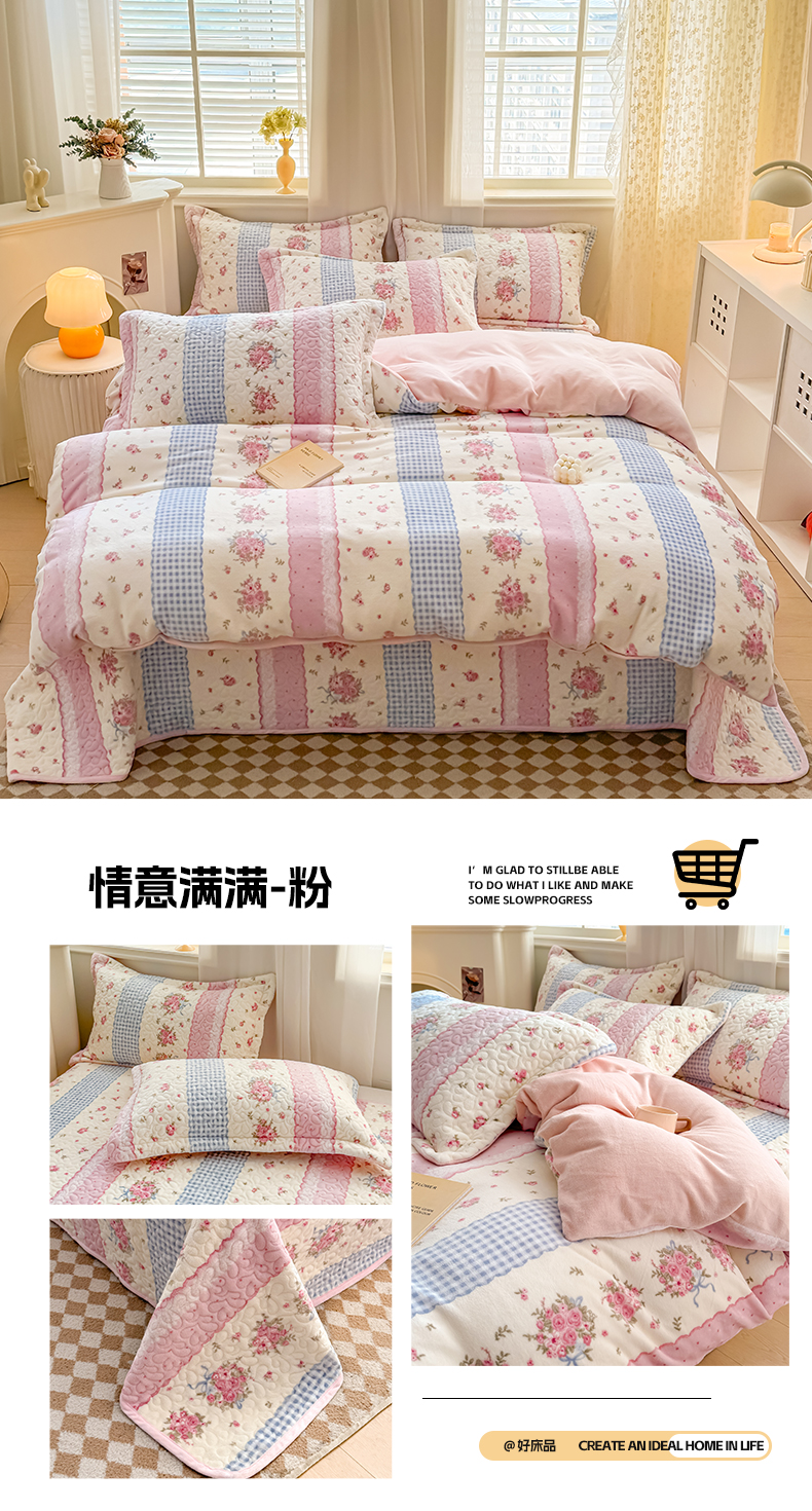 商品名称:迪梦姿家纺 2025新款牛奶绒印花床盖四件套 情意满满-粉