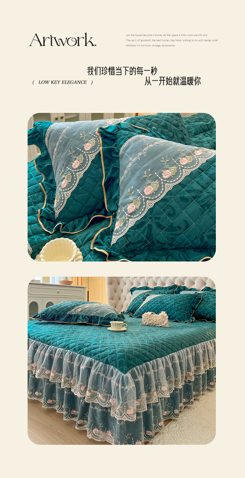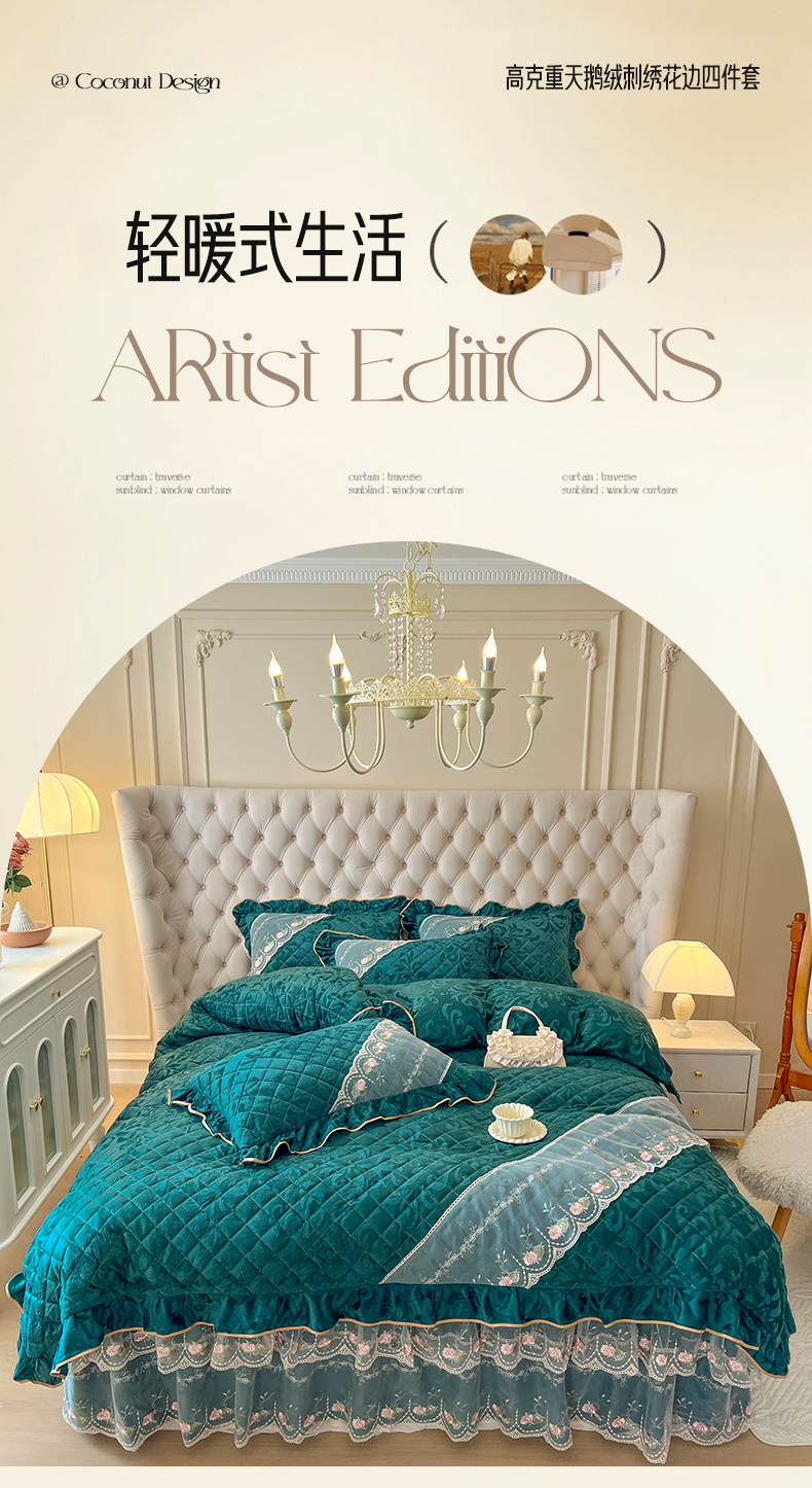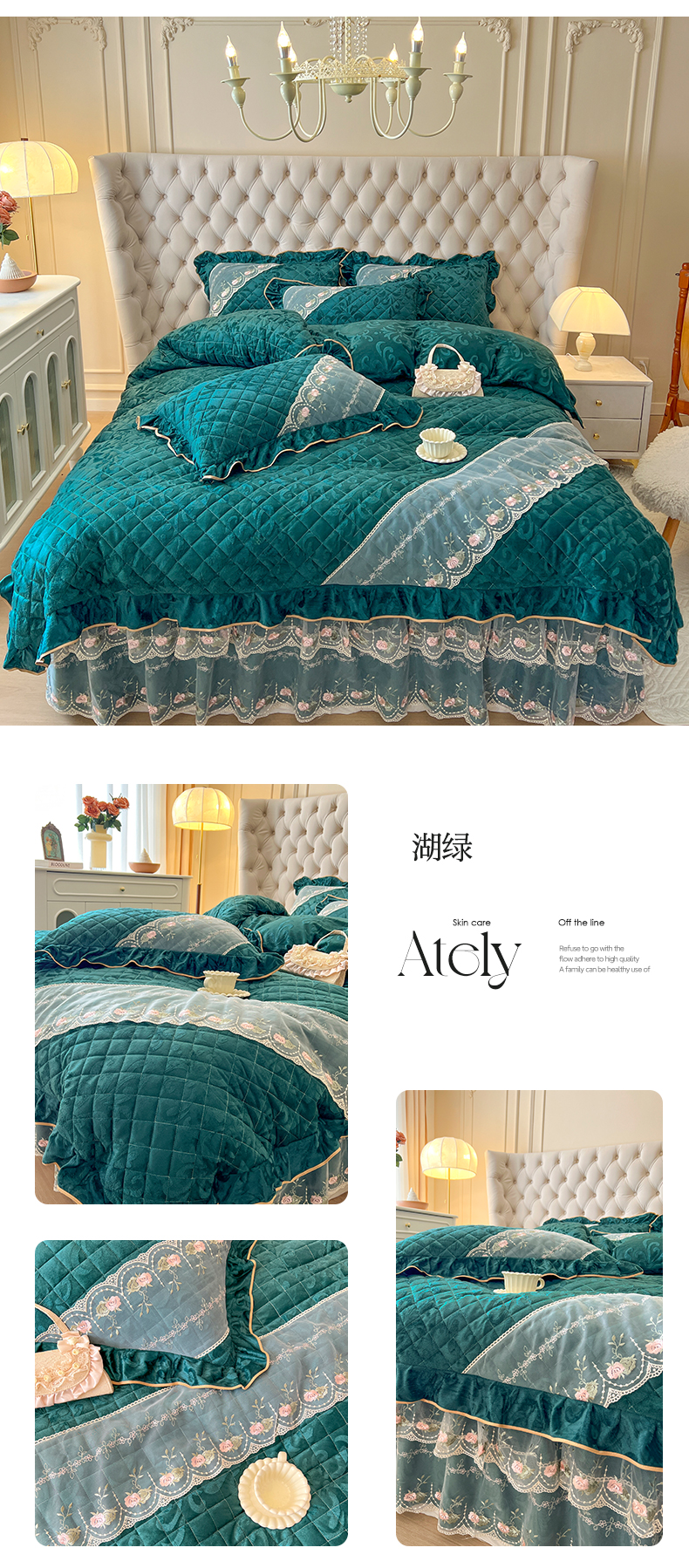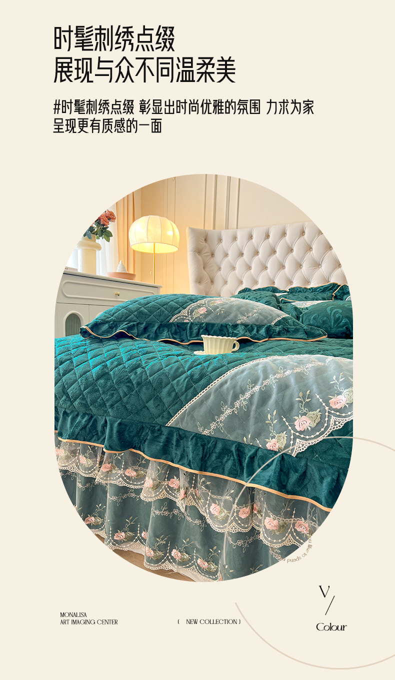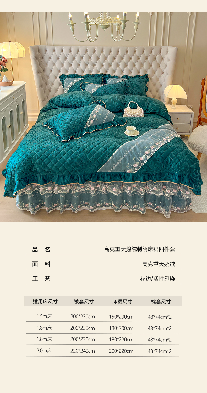 当前位置: 91家纺网 > 商品网购 > 床品套件 > 四件套 > 其它四件套 > 网红馆(ck家纺) 2025新款高克重天鹅绒刺绣床裙四件套-花语秘境 花语秘境-湖绿