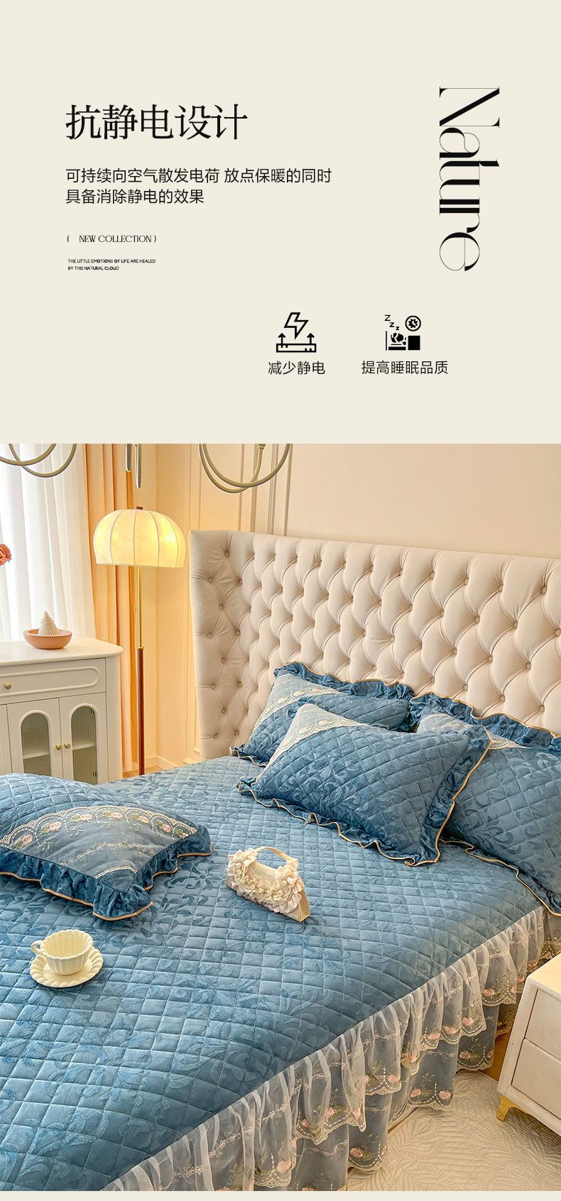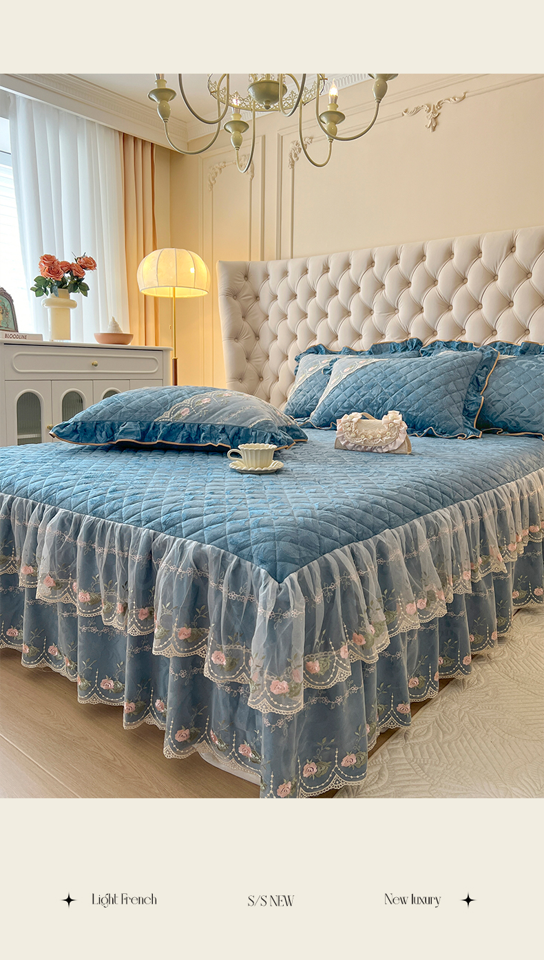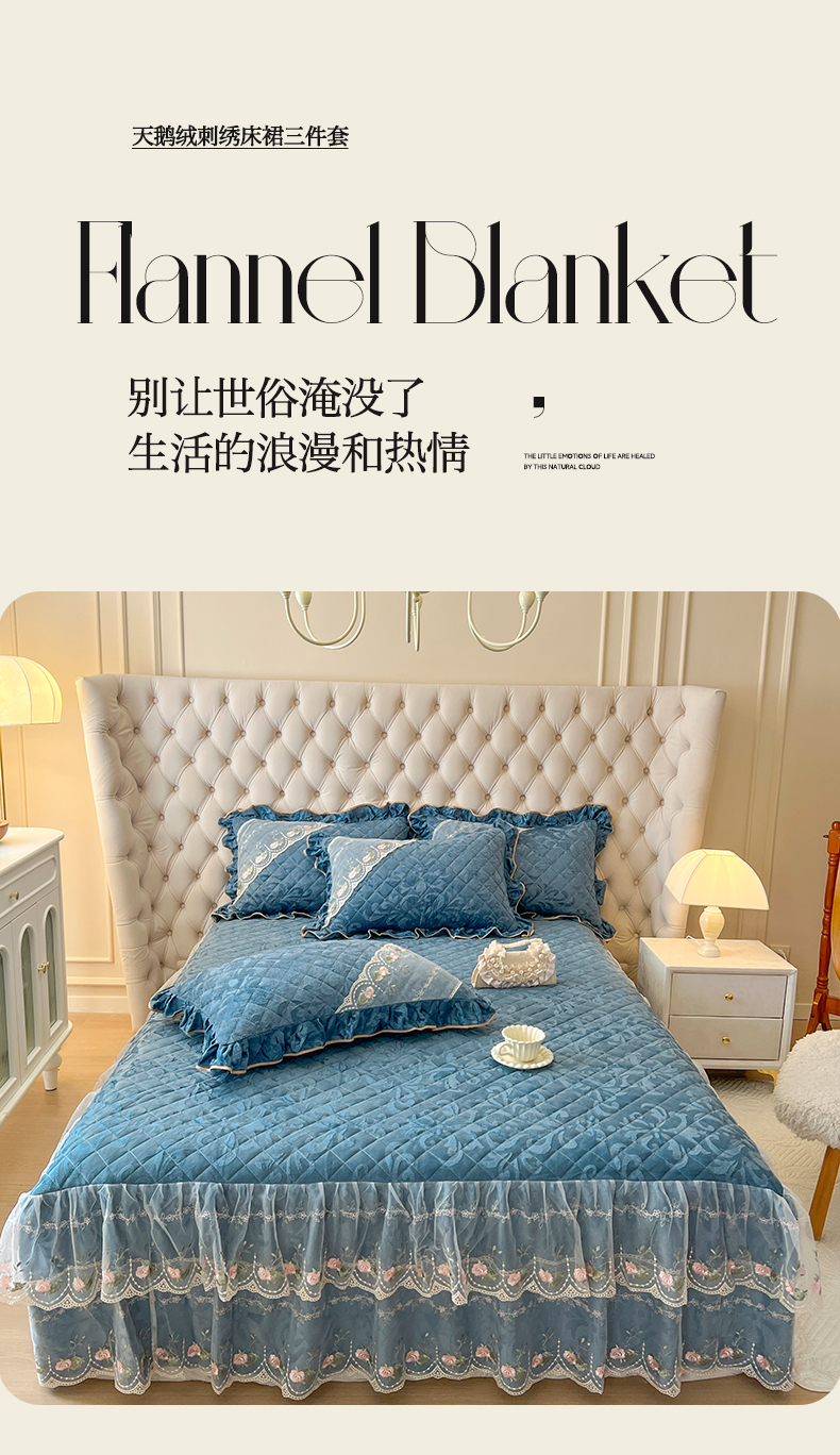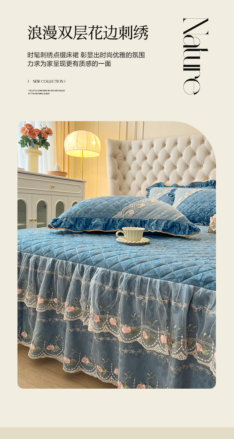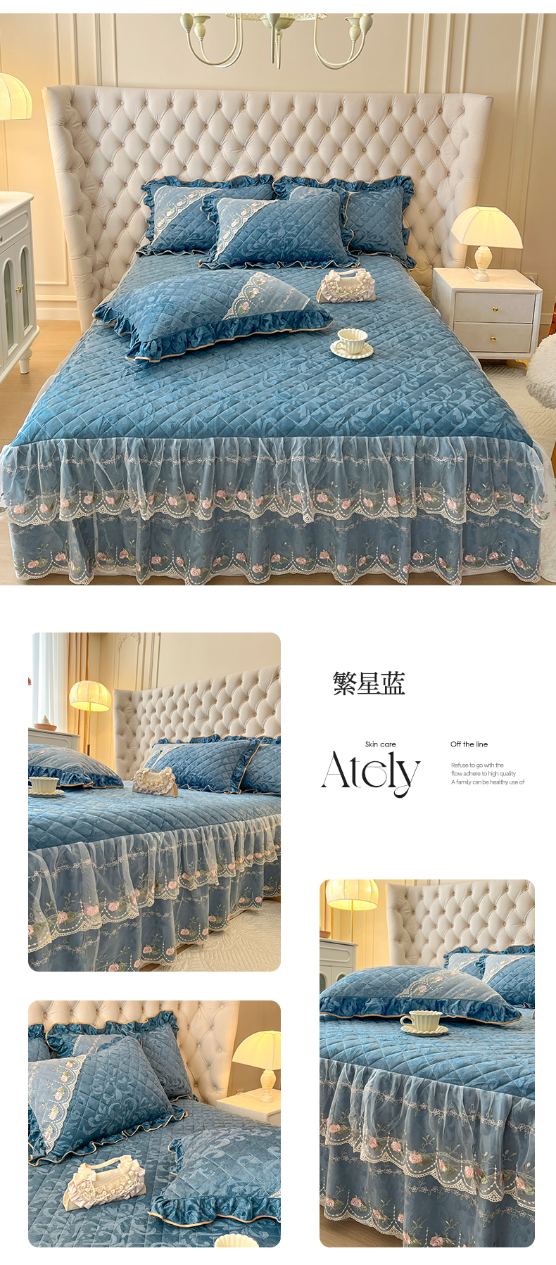 网红馆(ck家纺) 2025新款高克重天鹅绒刺绣床裙三件套-花语秘境 花语秘境-繁星蓝