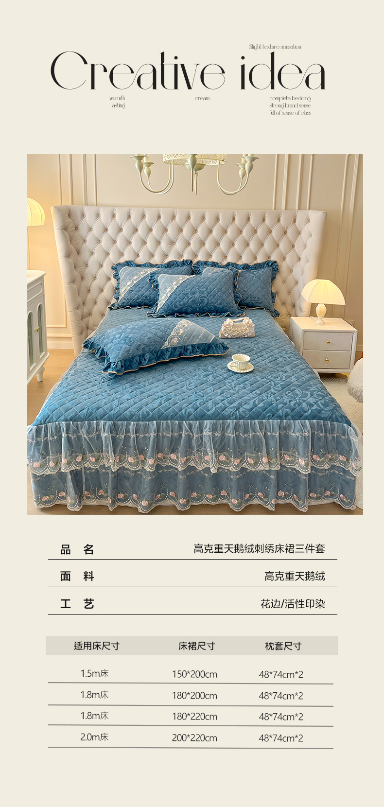 商品名称:网红馆(ck家纺) 2025新款高克重天鹅绒刺绣床裙三件套-花语秘境 花语秘境-繁星蓝