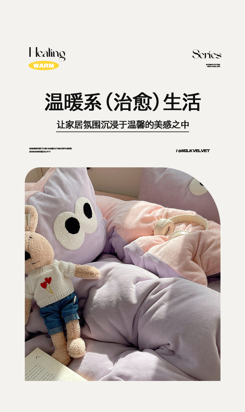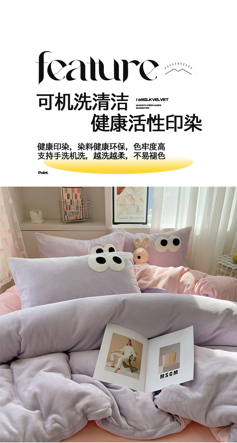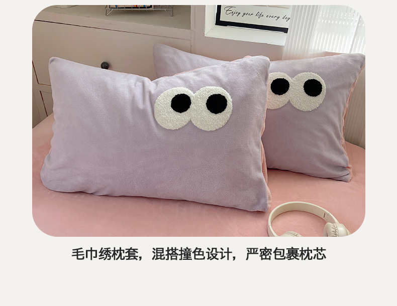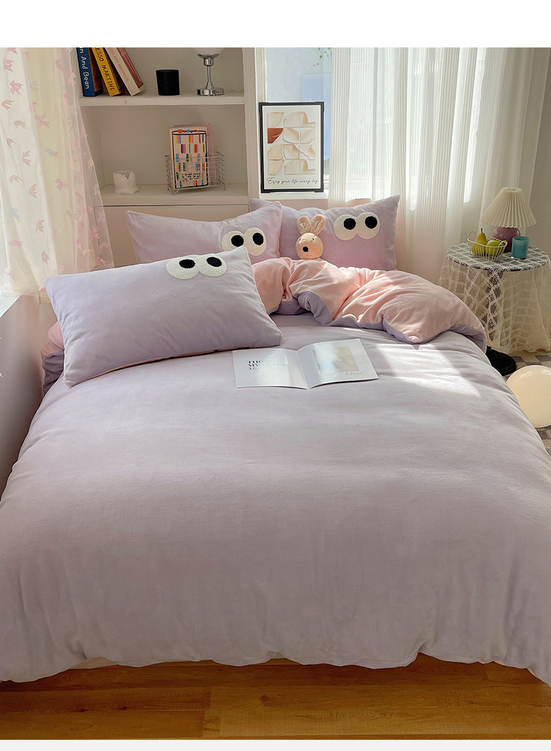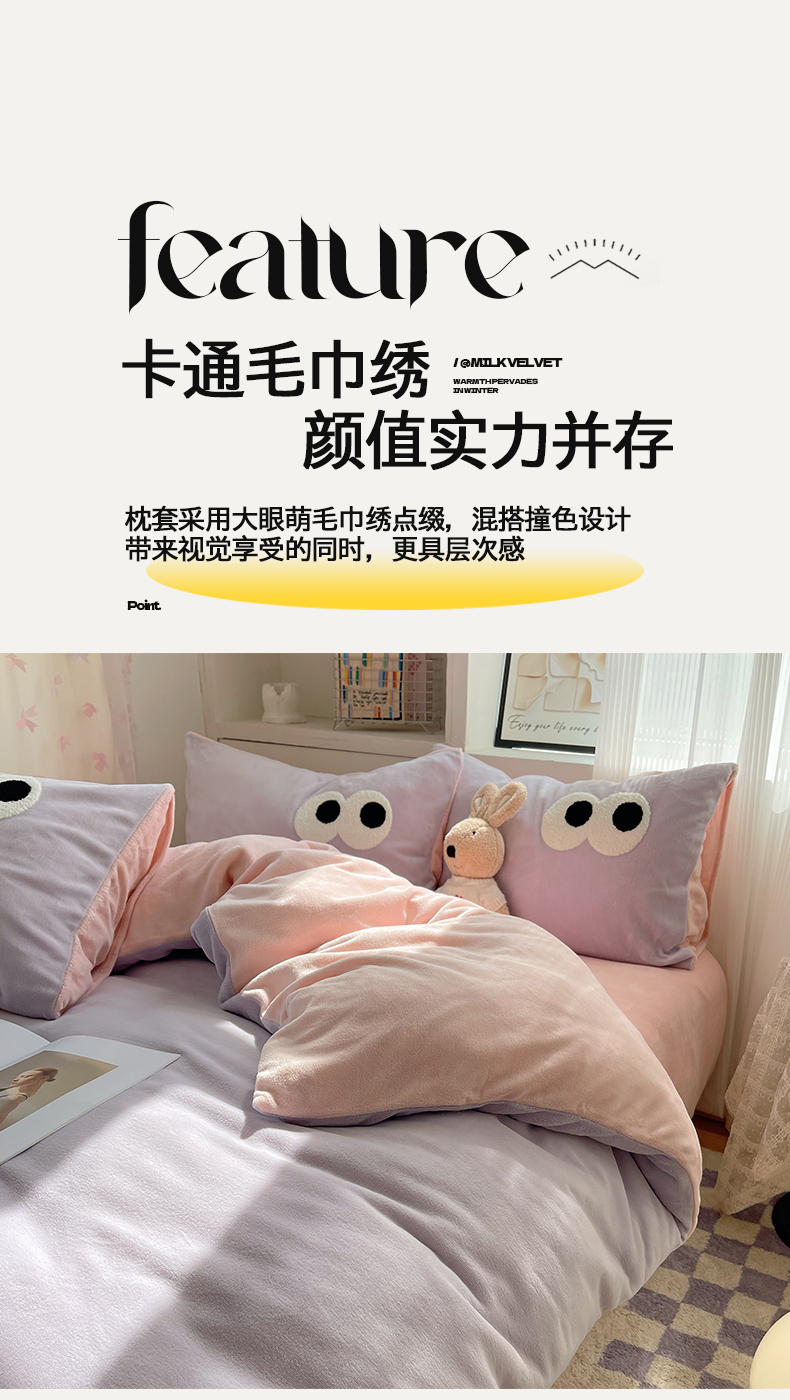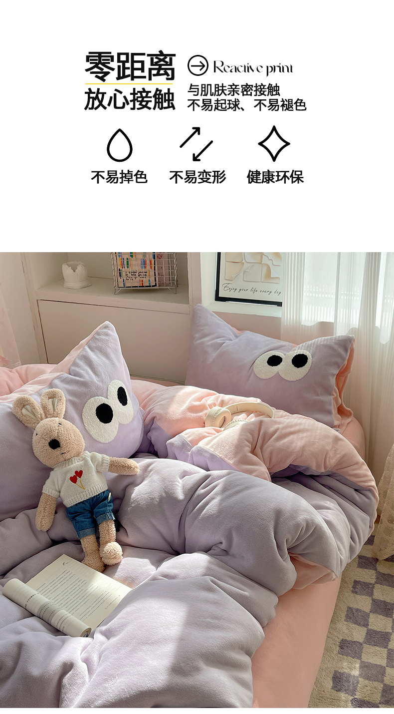 当前位置: 91家纺网 > 商品网购 > 床品套件 > 四件套 > 牛奶绒四件套 > 桃子家居 2024新款A类ins加厚毛巾绣大眼萌混搭撞色牛奶绒系列四件套 绒毛巾绣-大眼萌葡萄奶缇