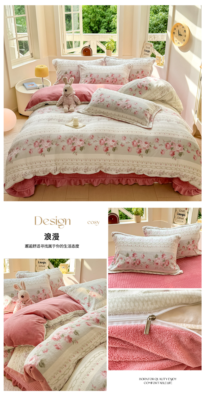 商品名称:尚美 2024新款高克重印花花边牛奶绒床盖四件套 浪漫