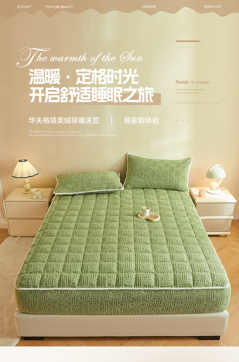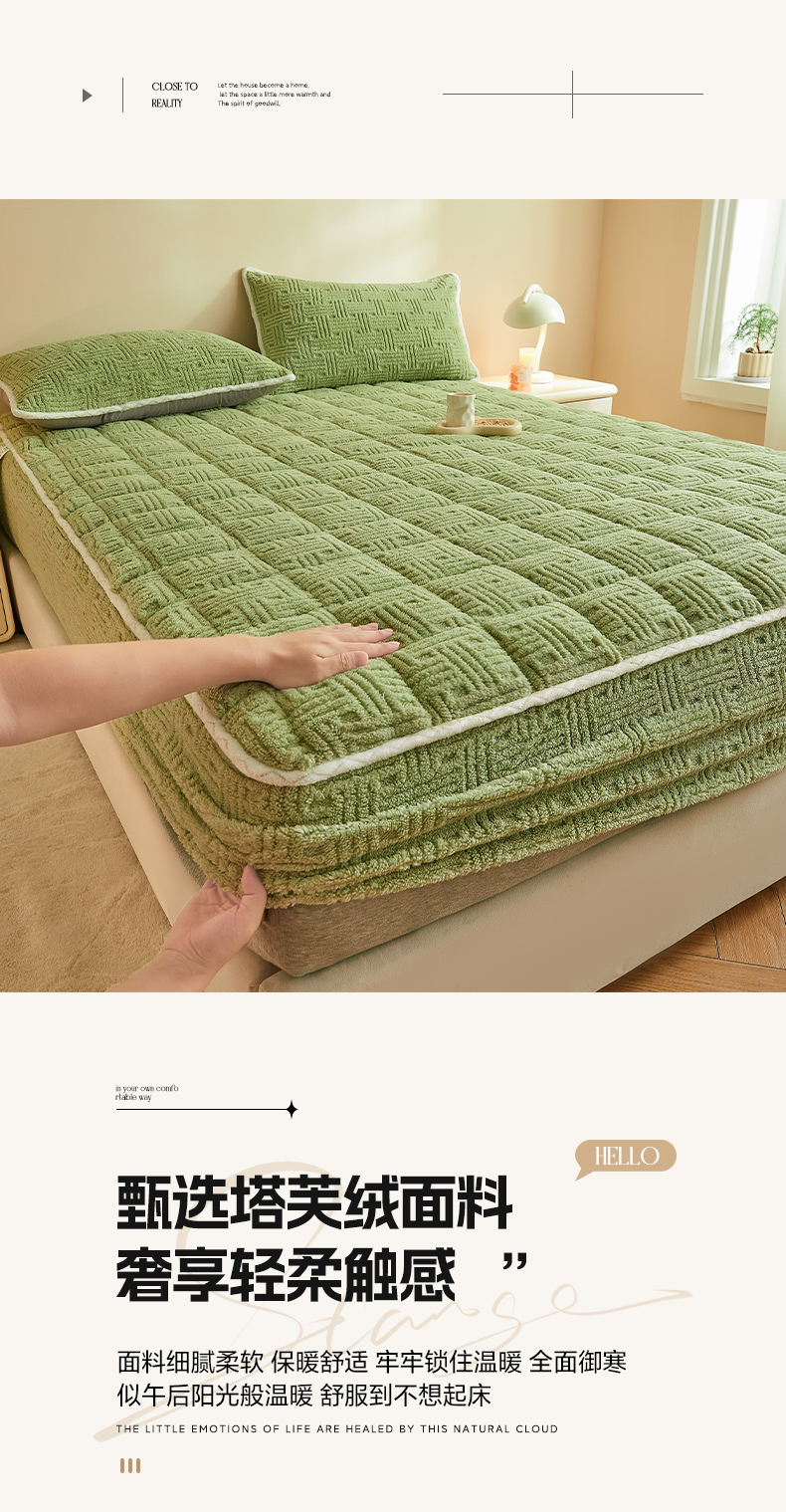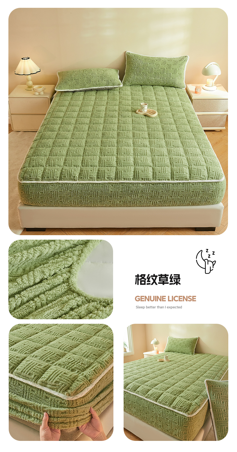 商品名称:卡伦家纺 2025新款塔芙绒方格纹加厚保暖夹棉床笠 格纹草绿