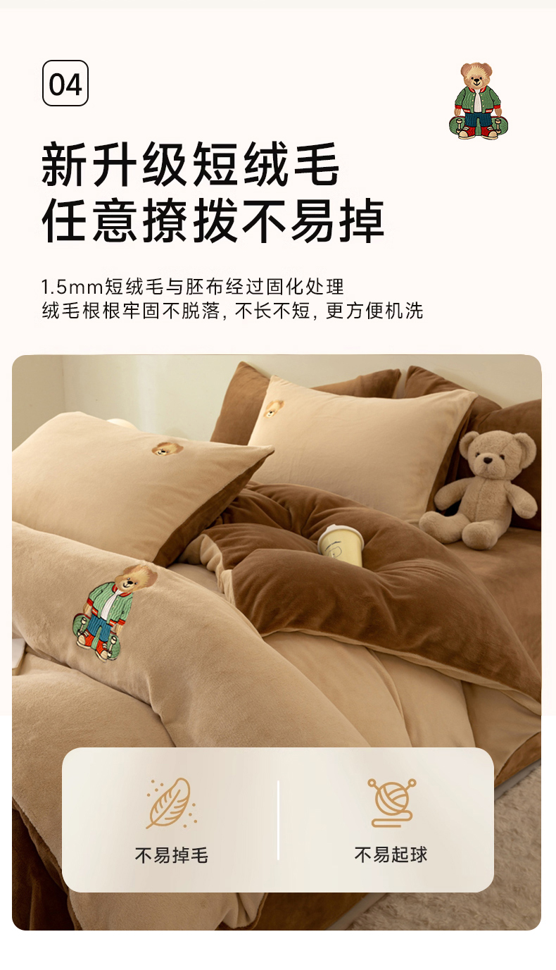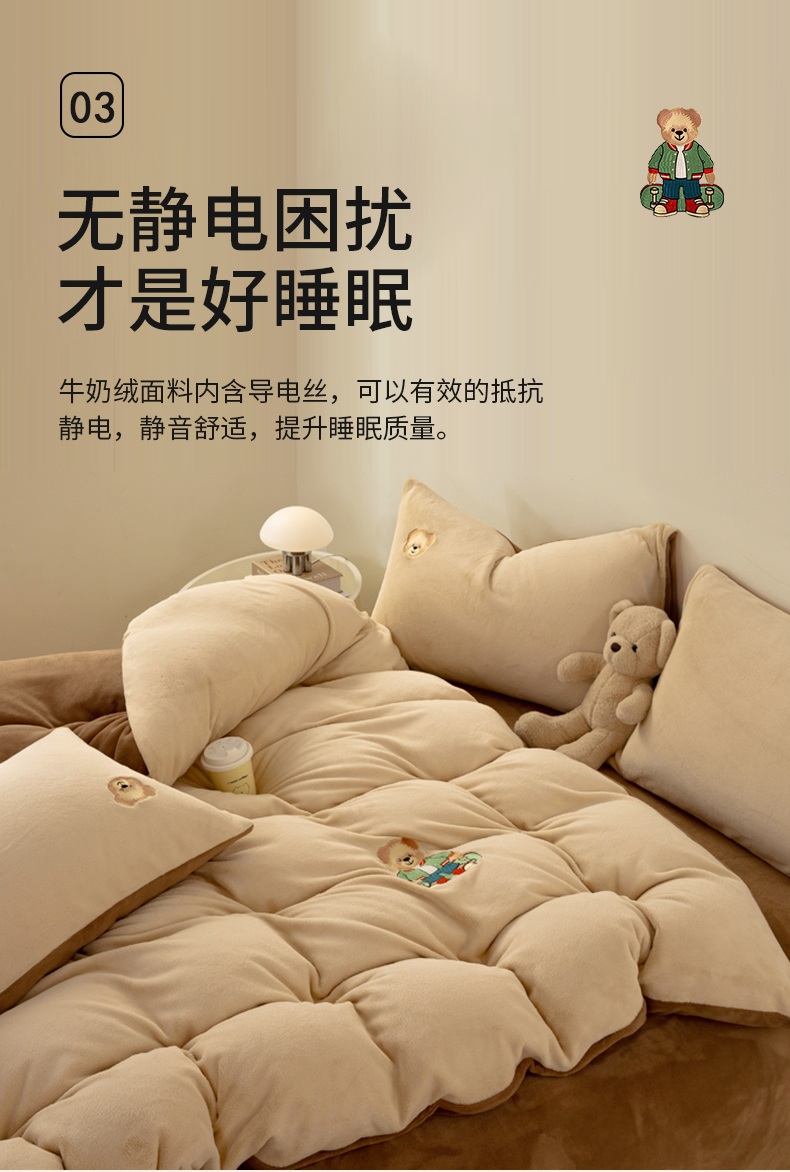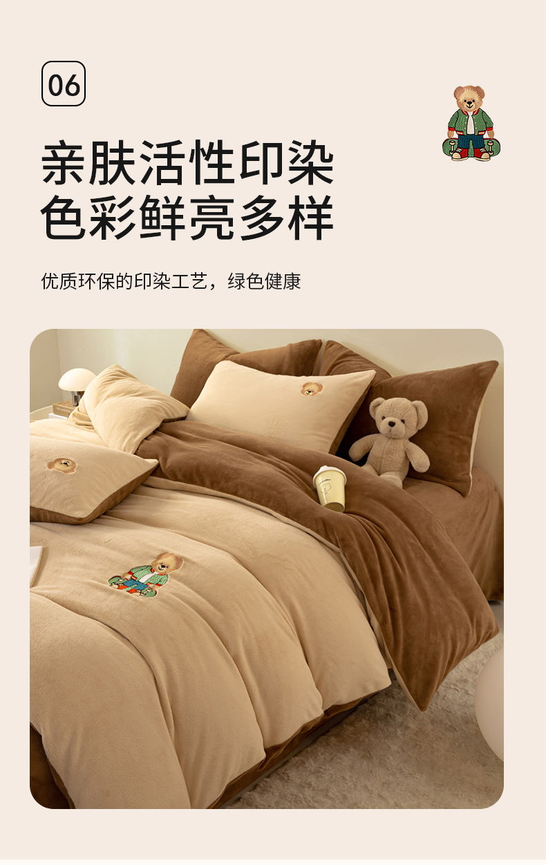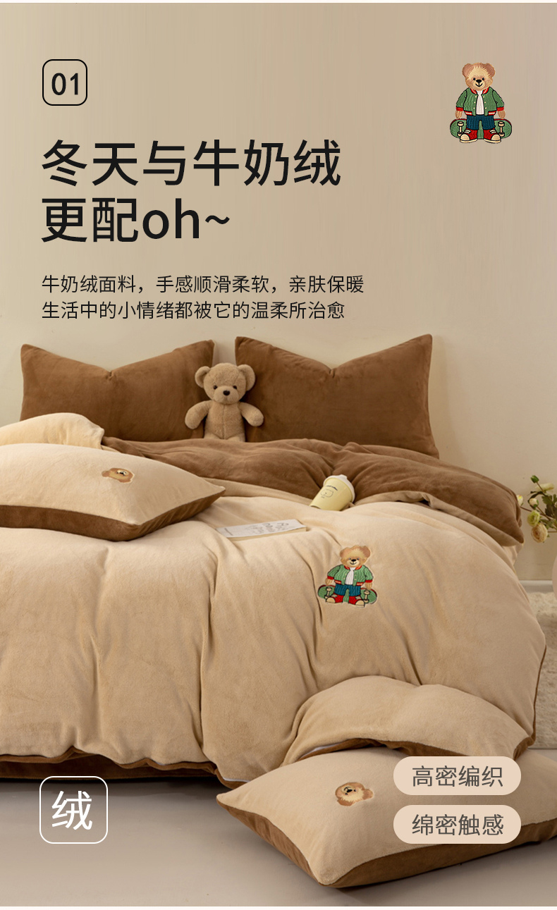当前位置: 91家纺网 > 商品网购 > 床品套件 > 四件套 > 牛奶绒四件套 > 沐晴家纺 2024新品秋冬加厚牛奶绒纯色简约绣花卡通四件套 滑板熊(米黄+深咖)