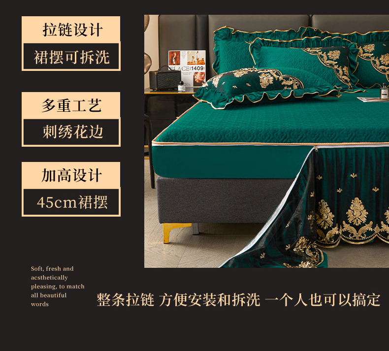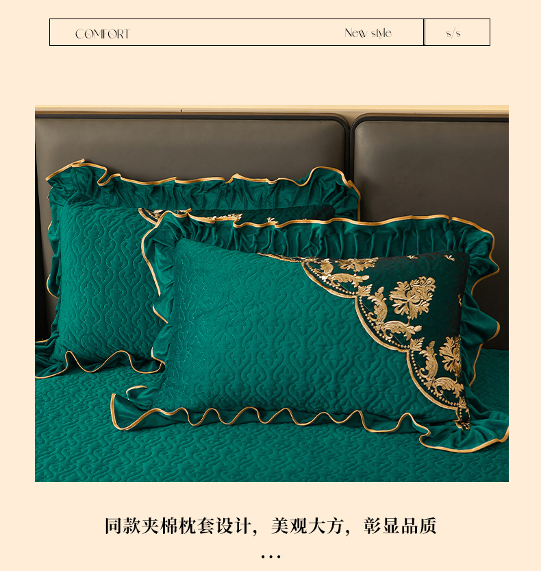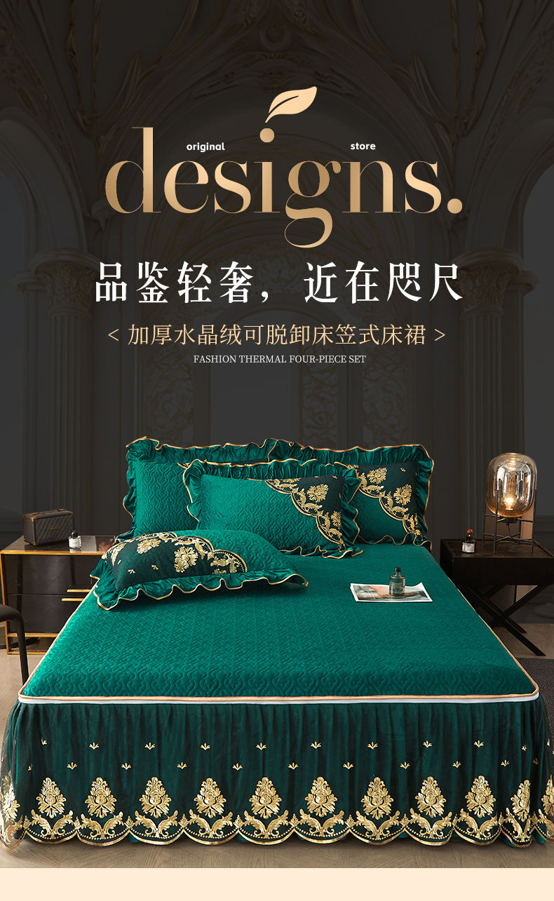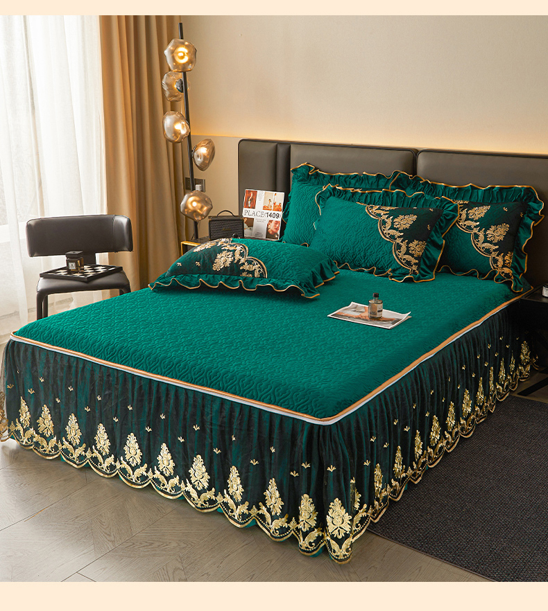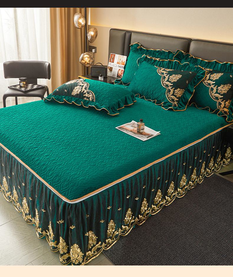 罗艺轩 2024新款高克重水晶绒夹棉床裙三件套-欧典风尚 欧典风尚-黛绿色