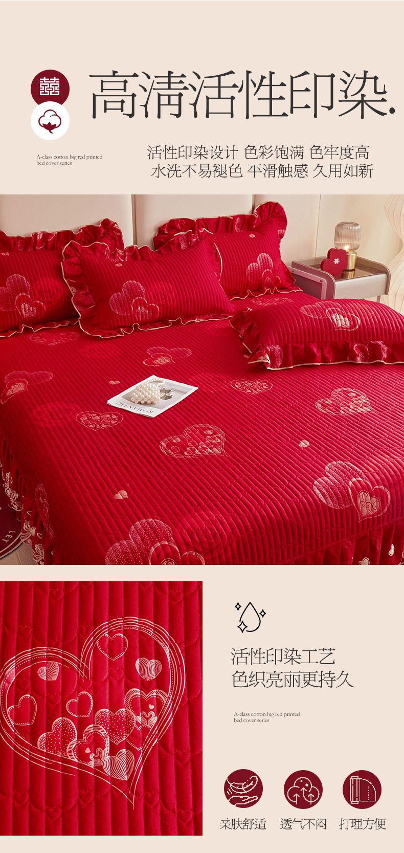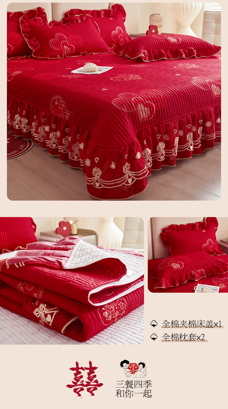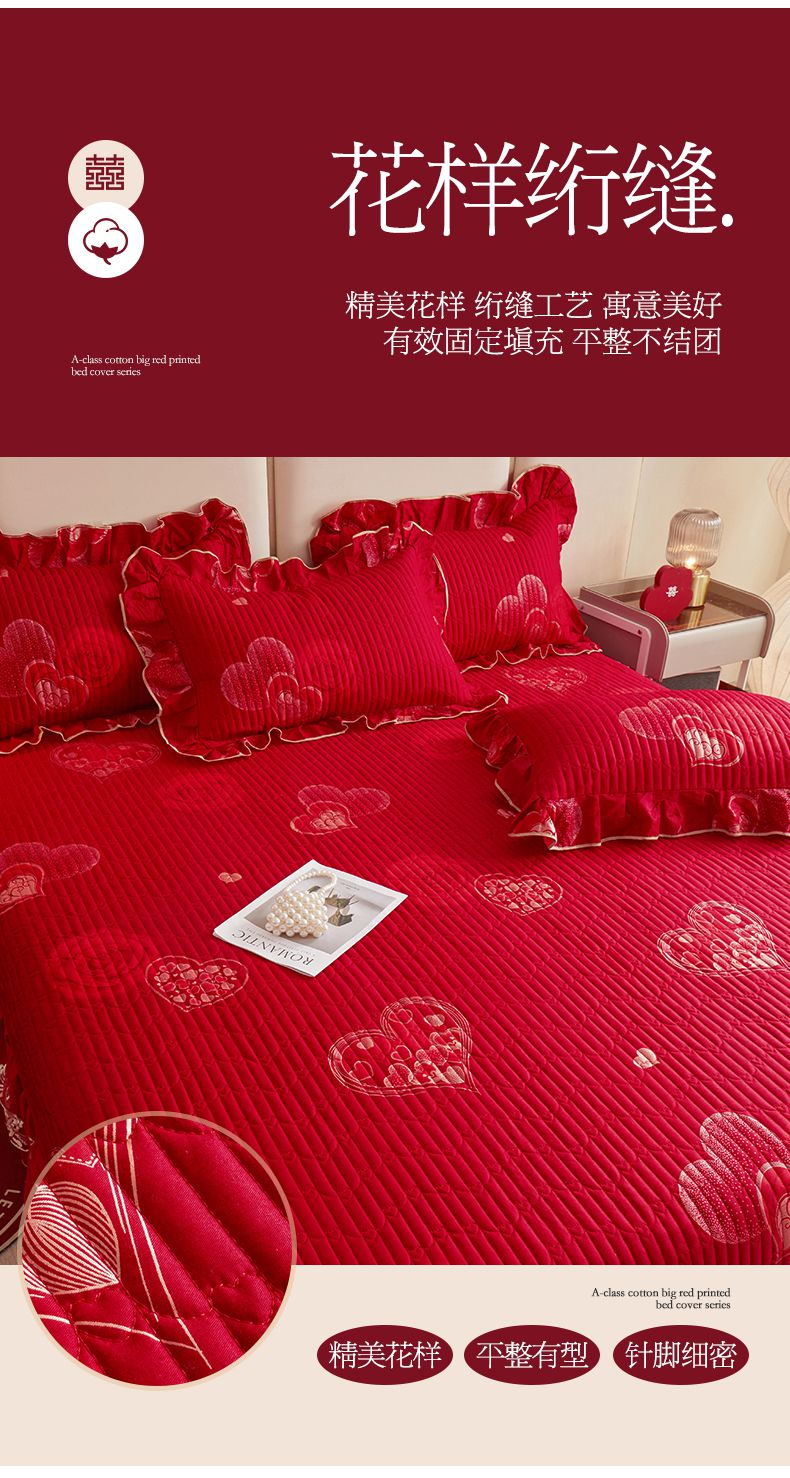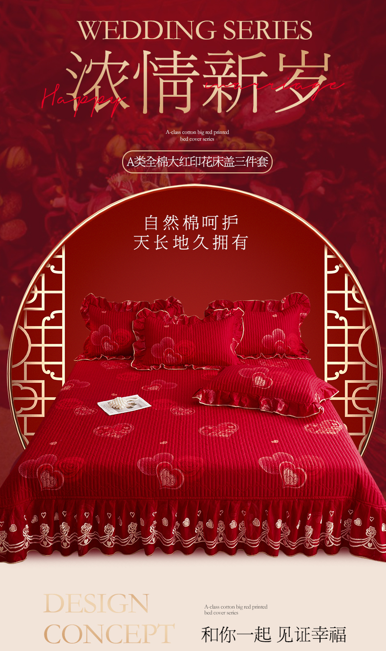 当前位置: 91家纺网 > 商品网购 > 床品套件 > 四件套 > 婚庆四件套 > 宜凡家纺 2024新款A类全棉大红印花床盖三件套 心悦你