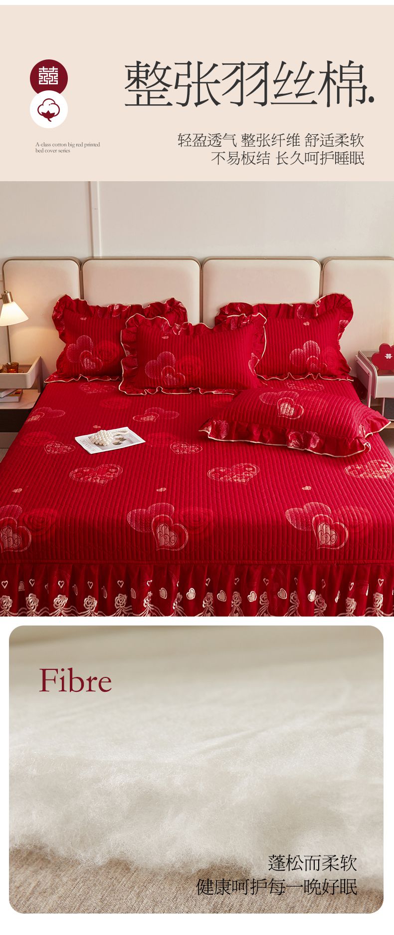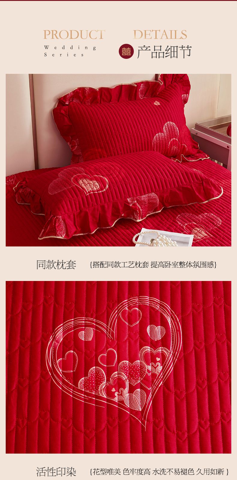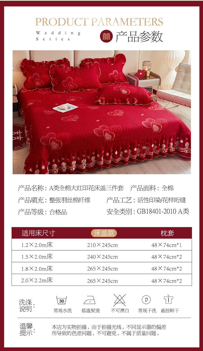 当前位置: 91家纺网 > 商品网购 > 床品套件 > 四件套 > 婚庆四件套 > 宜凡家纺 2024新款A类全棉大红印花床盖三件套 心悦你