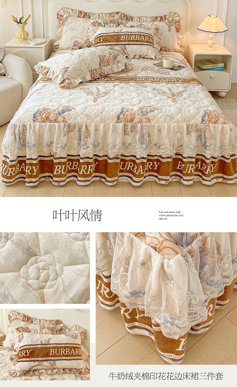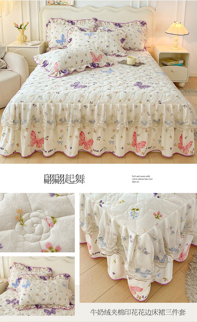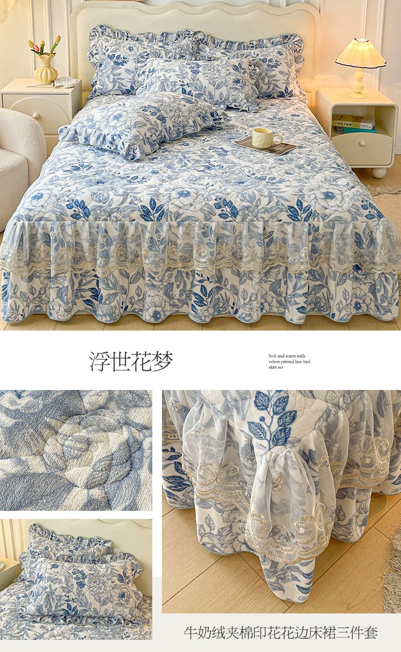 当前位置: 91家纺网 > 商品网购 > 床品套件 > 三件套 > 宜凡家纺 2024新款牛奶绒印花夹棉花边床裙三件套 花好月圆