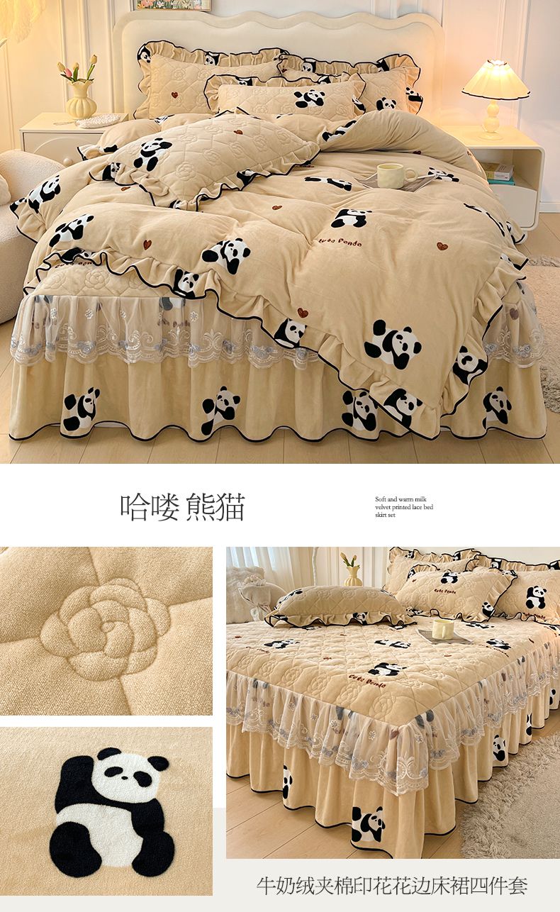 宜凡家纺 2024新款牛奶绒印花夹棉花边床裙四件套 哈喽 熊猫