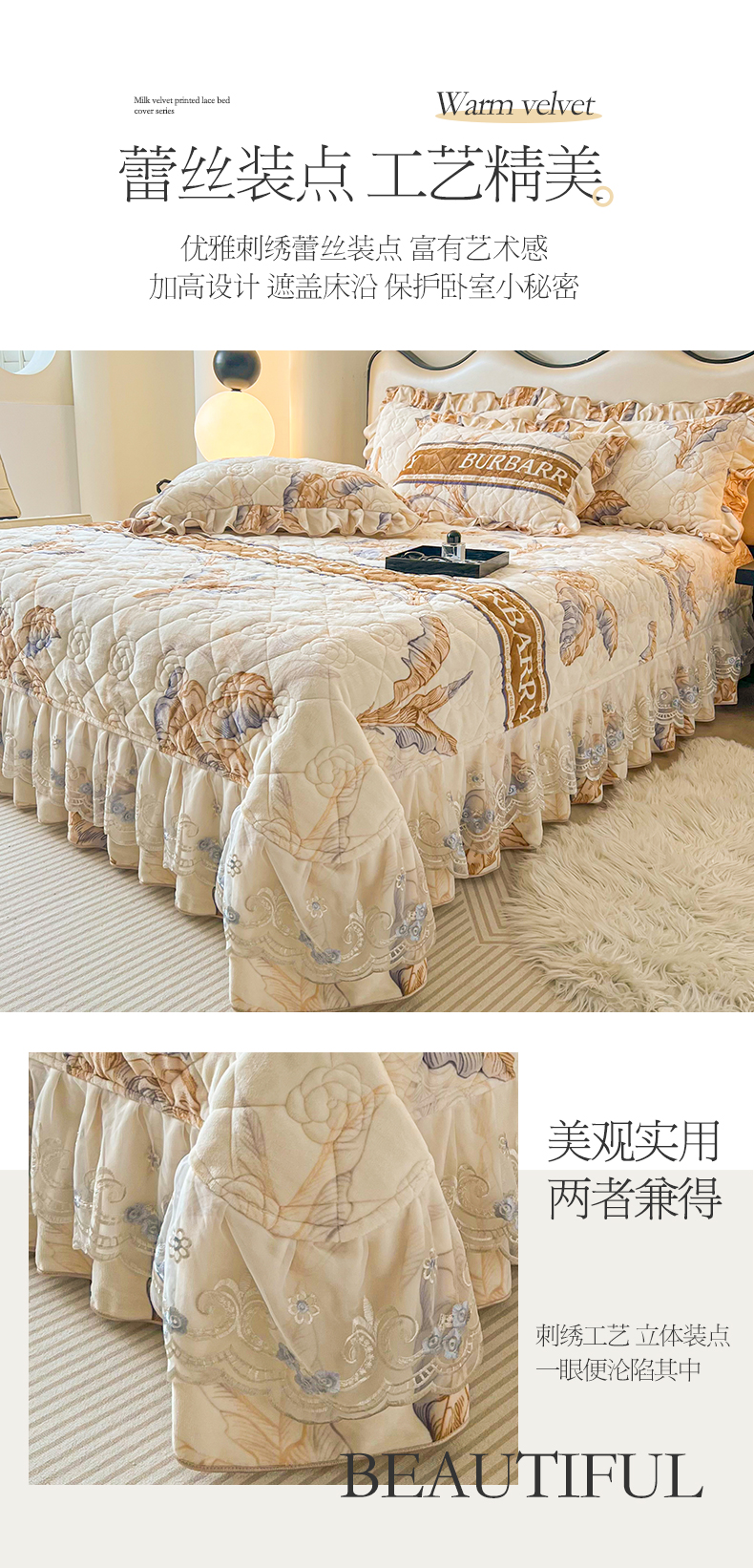商品名称:宜凡家纺 2024新款牛奶绒印花夹棉花边床盖四件套 淡雅相思