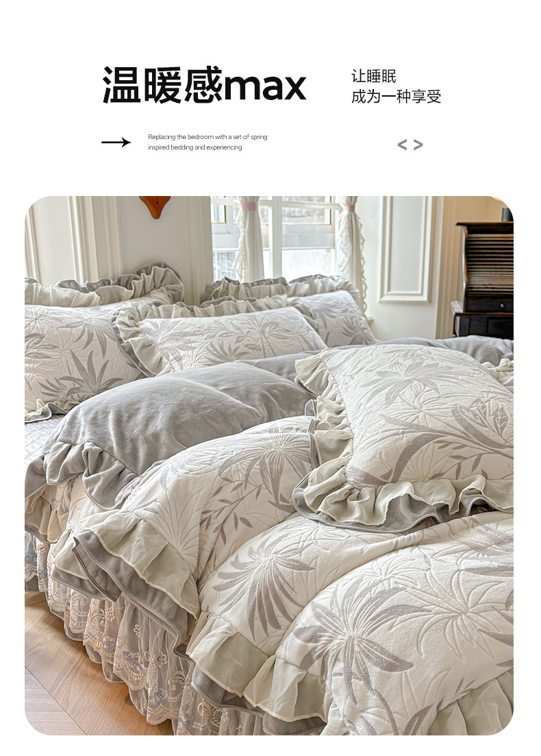 (总)宜凡家纺 2025新款牛奶绒雕花拼接刺绣床裙四件套,晨雾蔷薇,蝶恋花语,花野漫屿,蕾丝蝶音,洛可可影,雾蓝漫织,香槟漫月